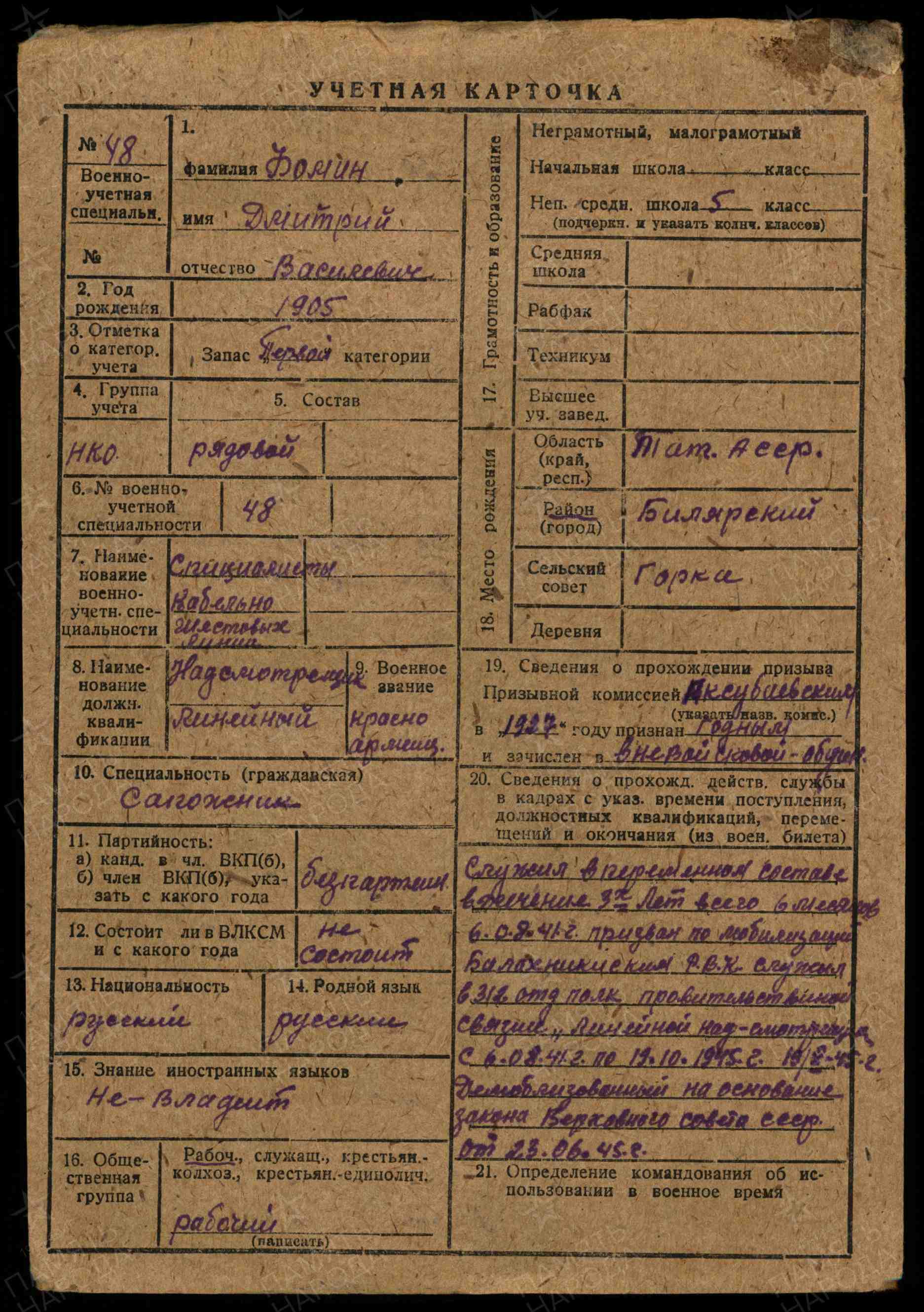 ФОМИН Дмитрий Васильевич, 1905, с. Богоявленская Горка. Мобилизован 6 авг. 1941 Балахнинским РВК Горьковской обл. Красноармеец, связист, линейный надсмотрщик 312 отд. полка правительственной связи. Демобилизован 19 окт. 1945. После войны жил в Дагестанской АССР, г. Избербаш, к-з им. Жемчужина.