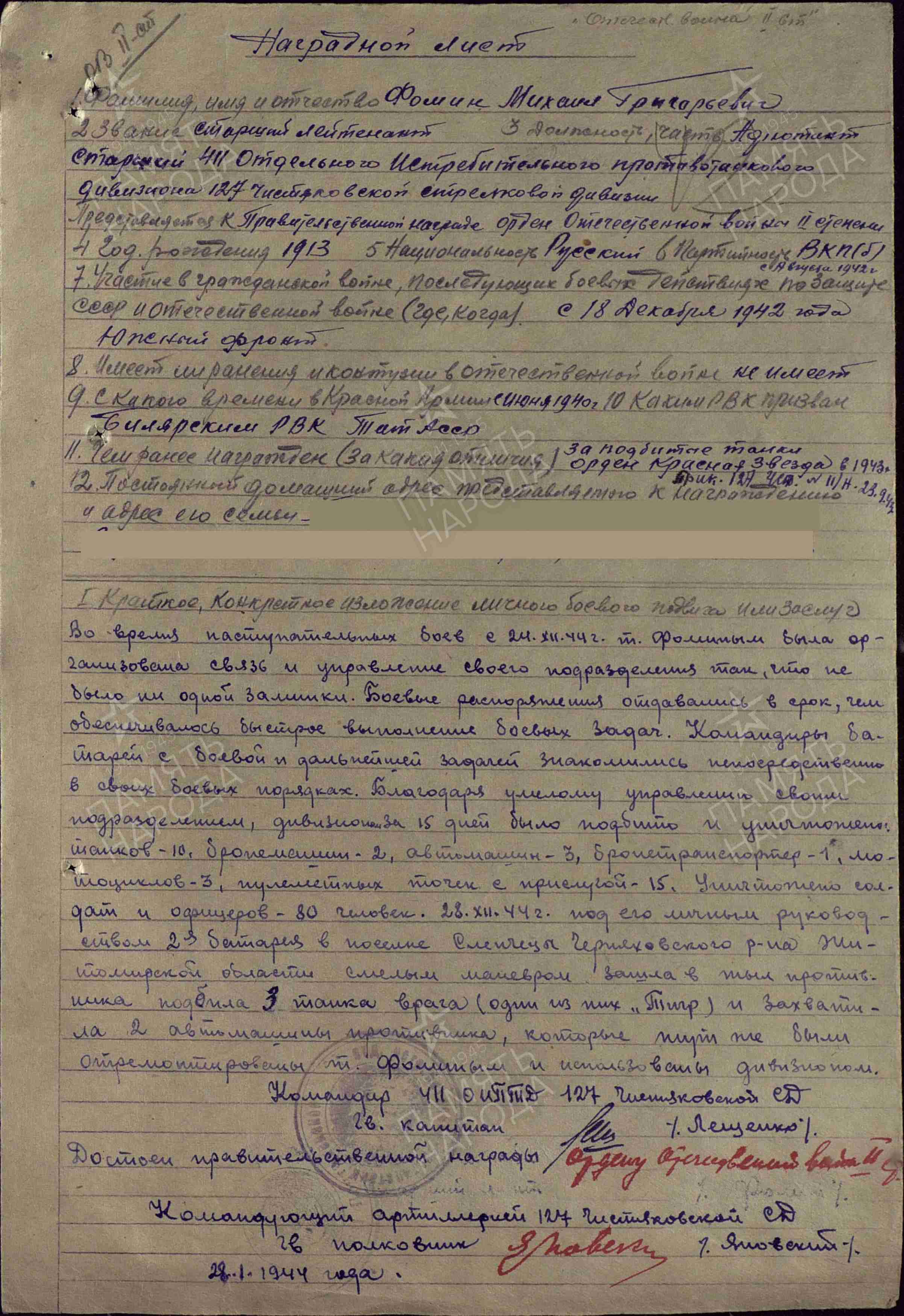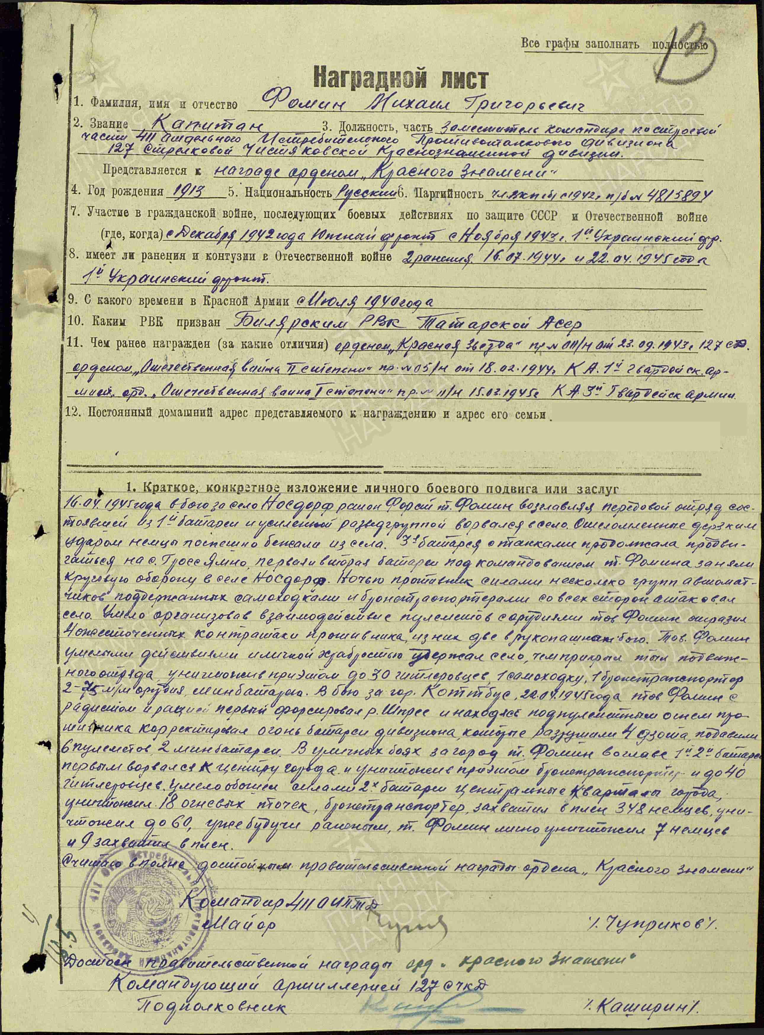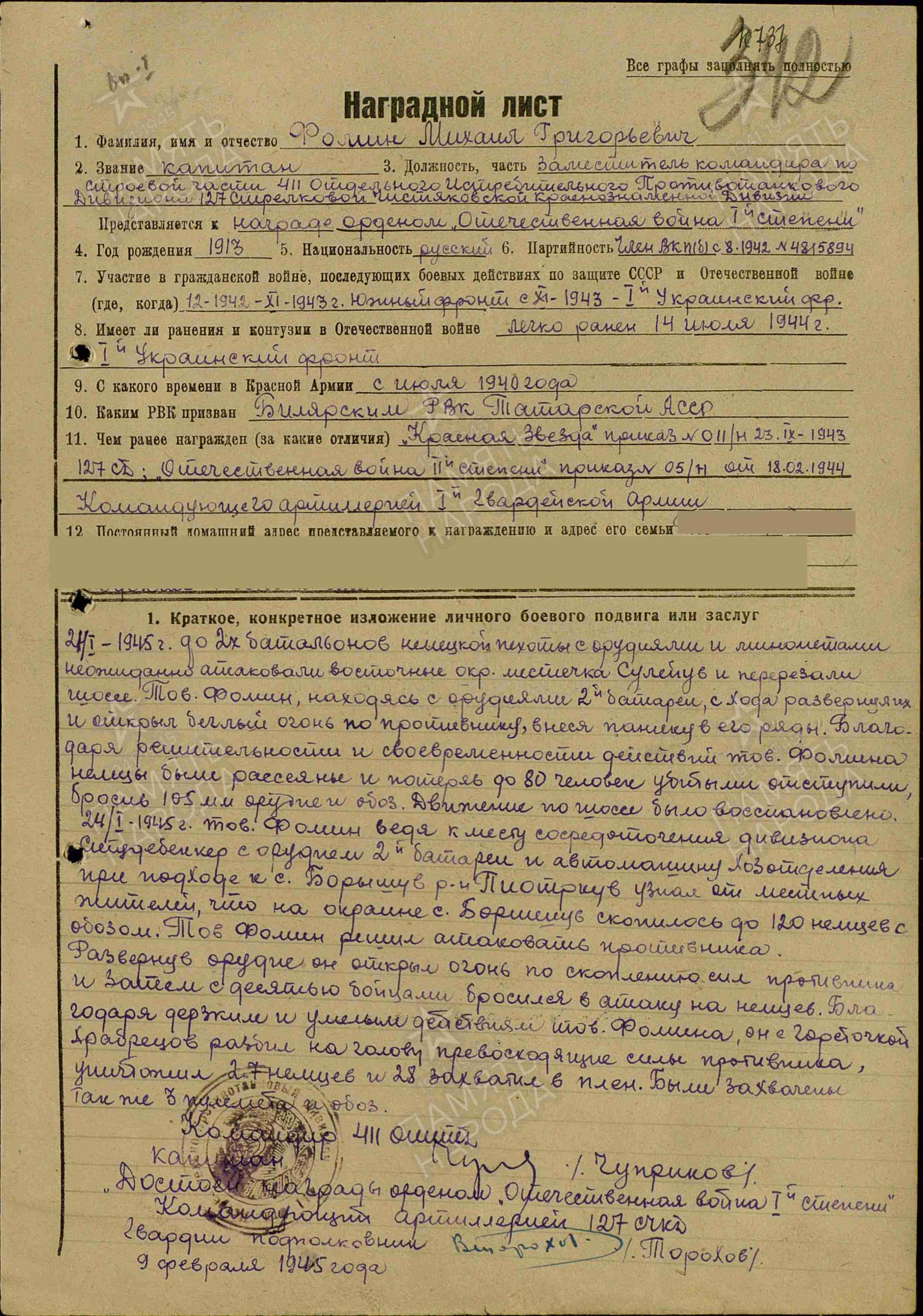 ФОМИН Михаил Григорьевич, 1913, с. Богоявленская Горка. Призван 15 июля 1940 Билярским РВК. Участвовал в боях с 18 дек. 1942. Лейтенант, ст. лейтенант, капитан; ком. батареи, адъютант старший, зам. ком. по строевой части 411 отд. ИПТАД 127 СД в составе 5 УдА/ 28 А Южного фронта, 1 гв. А/ 38 А/ 3 гв. А 1 Украинского фронта. Перенёс два лёгких ранения: 14 июля 1944, 22 апр. 1945. После войны продолжил службу в вооружённых силах. Награждён медалями «За взятие Берлина», «За освобождение Праги», двумя орденами Красной Звезды (1943, 1956), орденами Отечественной войны 2 ст. (1944), Красного Знамени (1945), Отечественной войны 1 ст. (1945). Вышел в отставку 1 фев. 1963 в звании «подполковник».