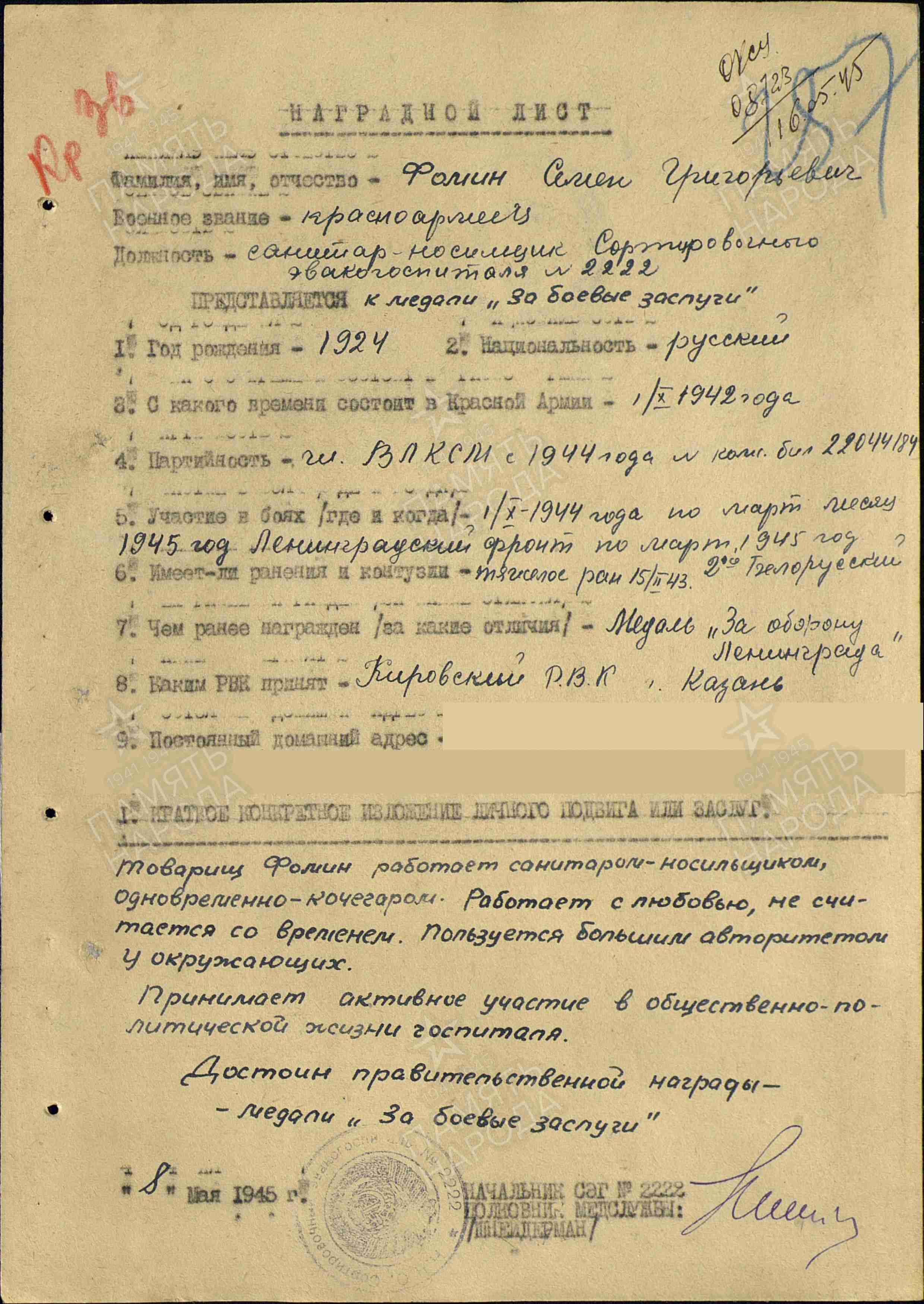 ФОМИН Семён Григорьевич, 1924, с. Горка. Мобилизован Кировским РВК г. Казань 6 нояб. 1942. Воевал на Ленинградском и 2 Белорусском фронте в составе 67 А. Красноармеец, стрелок 181 СП 43 СД/ 947 СП 268 СД, санитар-носильщик СЭГ 2222. Тяжело ранен 15 фев. 1943. Проходил лечение в ЭГ 1117, г. Ленинград. Демобилизован 29 окт. 1945. Признан инвалидом войны 3 г. Награждён медалью «За оборону Ленинграда», орденами Красной Звезды (1945), Отечественной войны 1 ст. (1985).