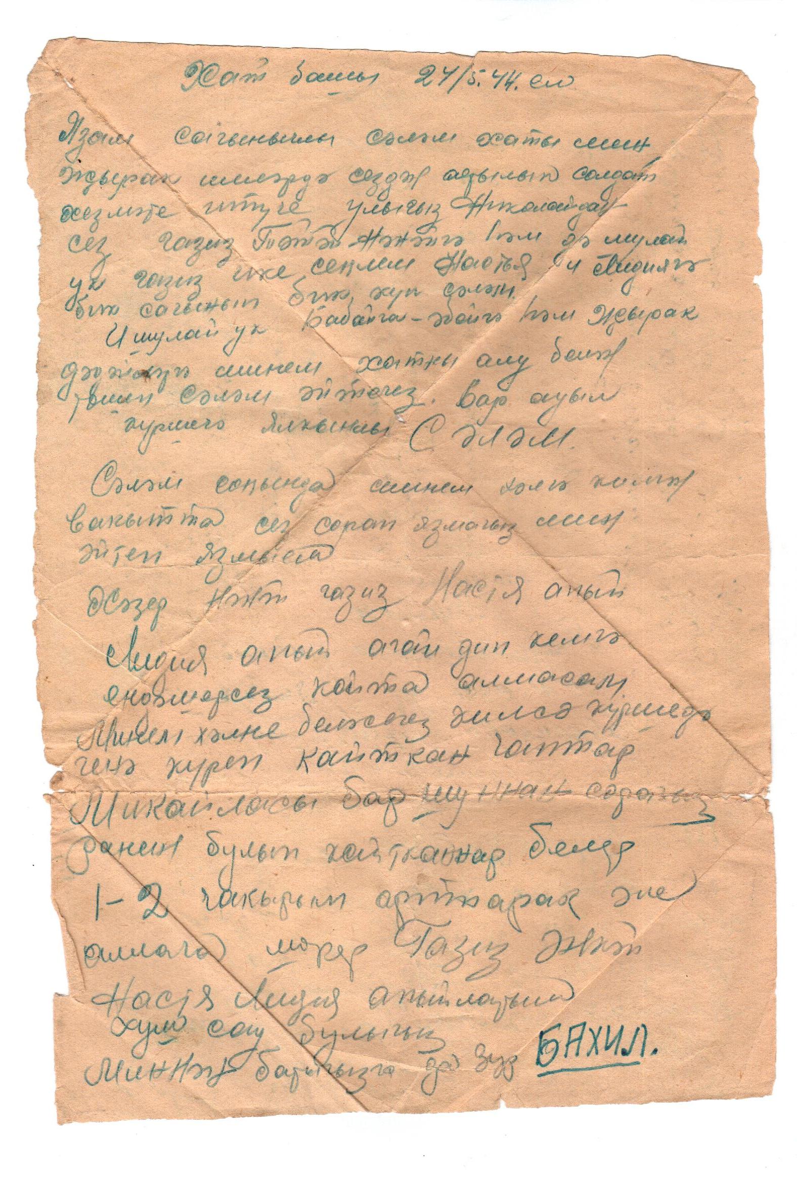 "Хат башы 24/5.1944 ел. Язам сагынычлы саләм хаты. Мин җырган илләрдә сездән аерылып солдат хезмәте итүче улыгыз Николайдан сез газиз Тәтәй-Нәнәйгә һәм шулай ук газиз ике сеңлем Настя һәм Лидиягә, шулай ук бабайга-әбейгә һәм җырак дәдәйләргә минем хатымны алу белән сәлам әйтегез. Бар аул күршегә ялкынлы сәлам..."