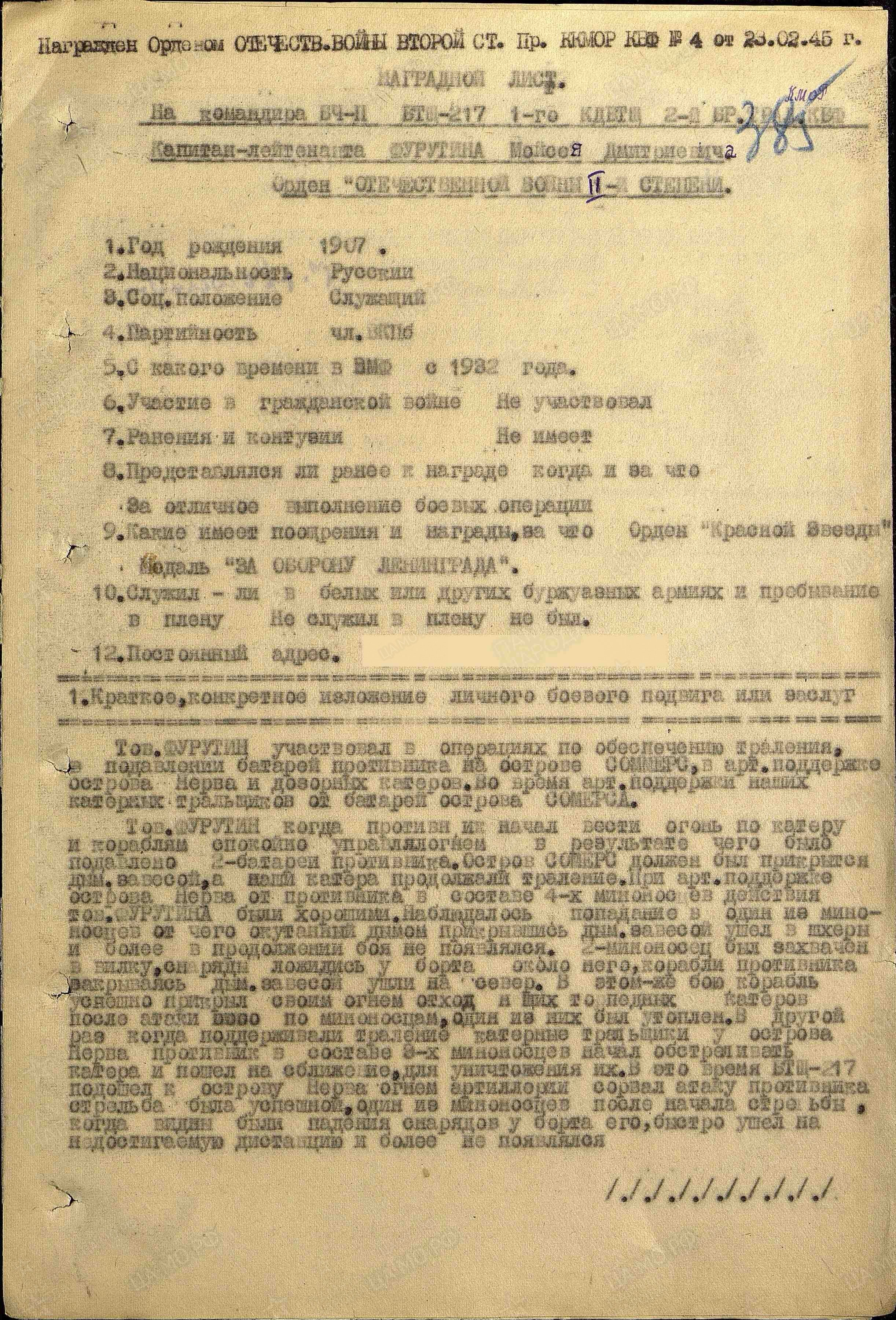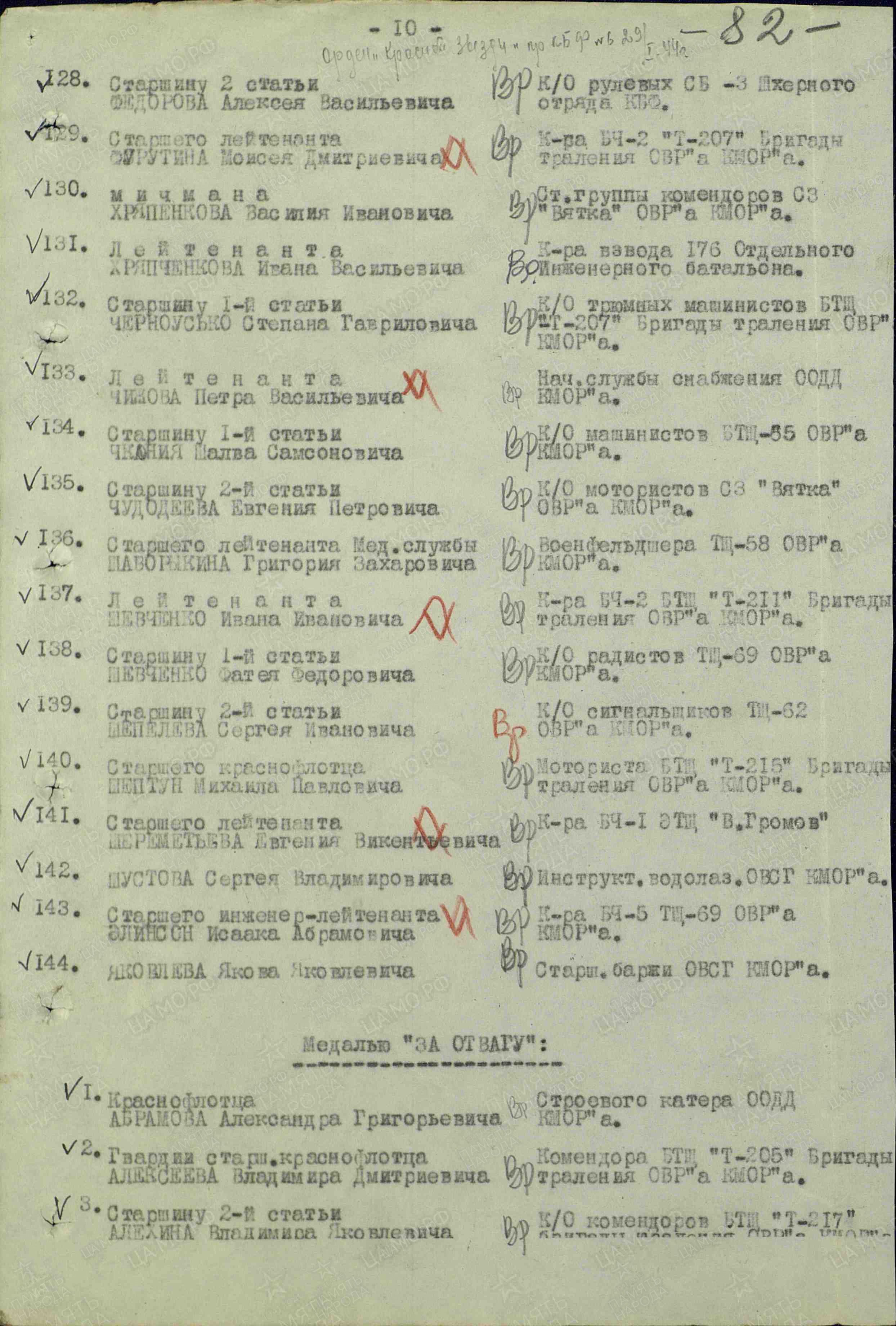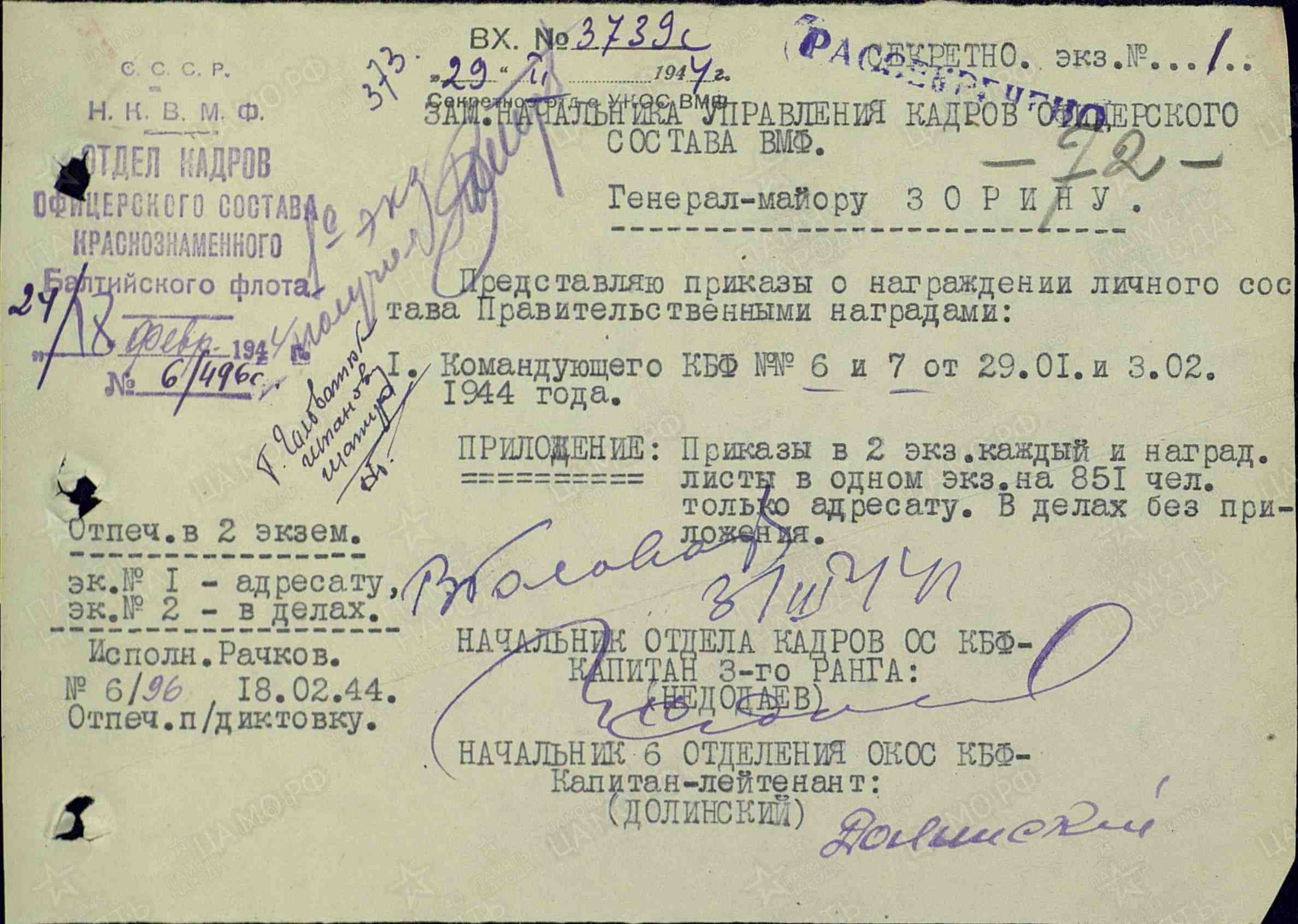 «За 1943-44 гг. участвовал в 103 боевых операциях, проведенных кораблем, в которых проявил мужество и отвагу, отличное знание техники и умение владеть ею, так, например, 30 октября 1943 года при поддержки тралящих кораблей в непосредственной близости от острова противника, при обстреле вражеского острова, благодаря четкой и правильной корректировке огня и руководства орудийным расчетом – подавил артиллерийскую батарею противника, препятствующую боевому тралению нашего соединения».