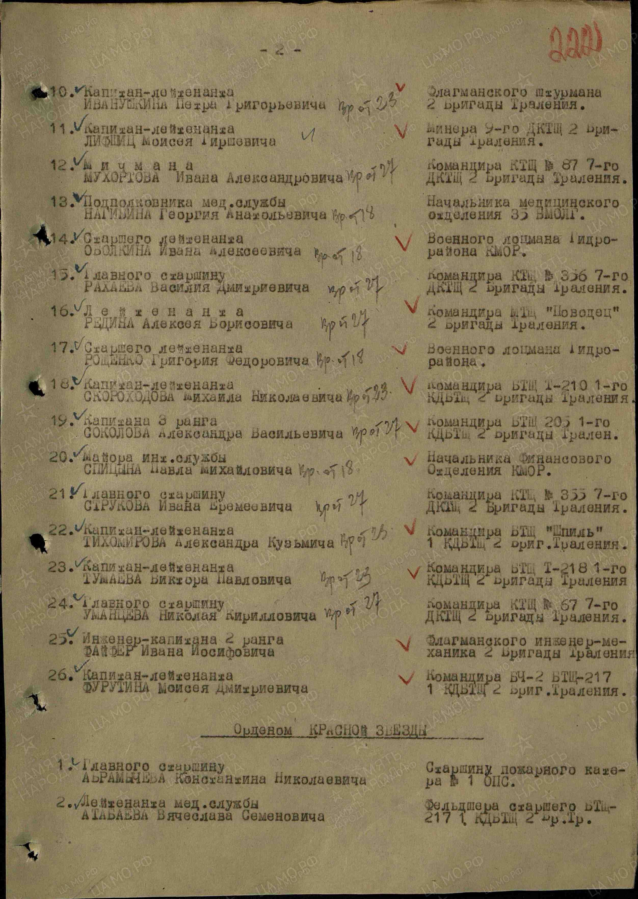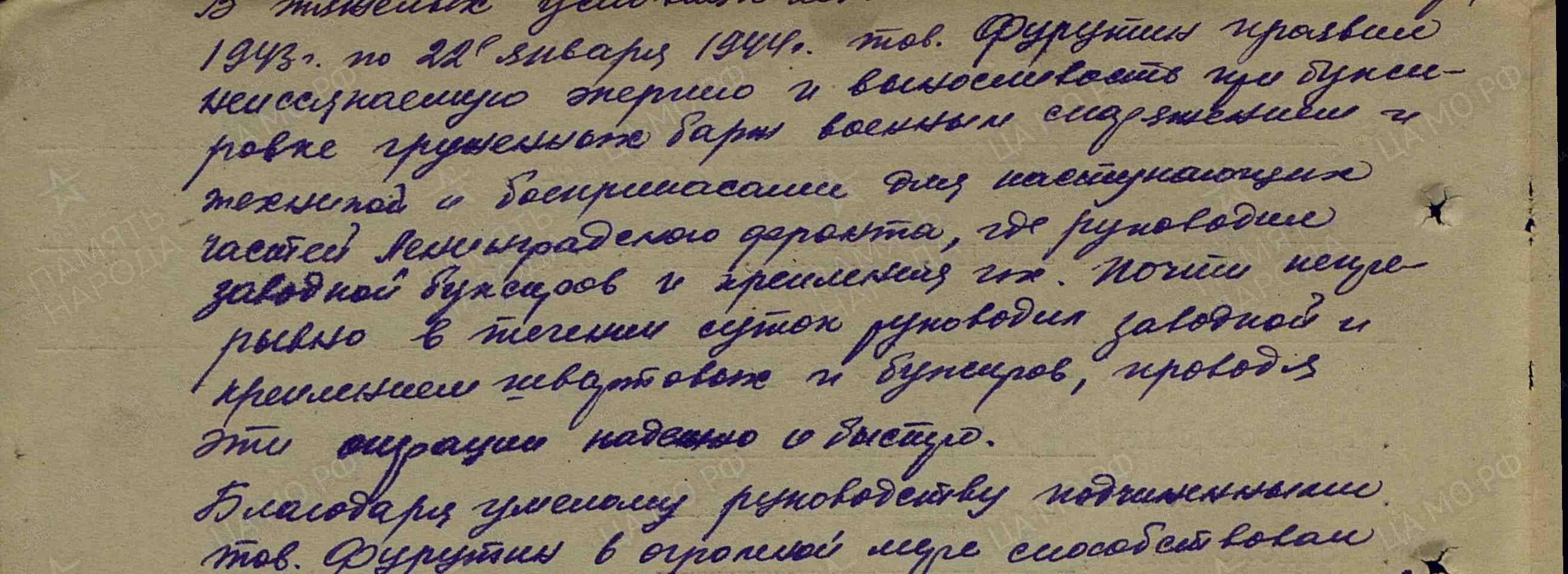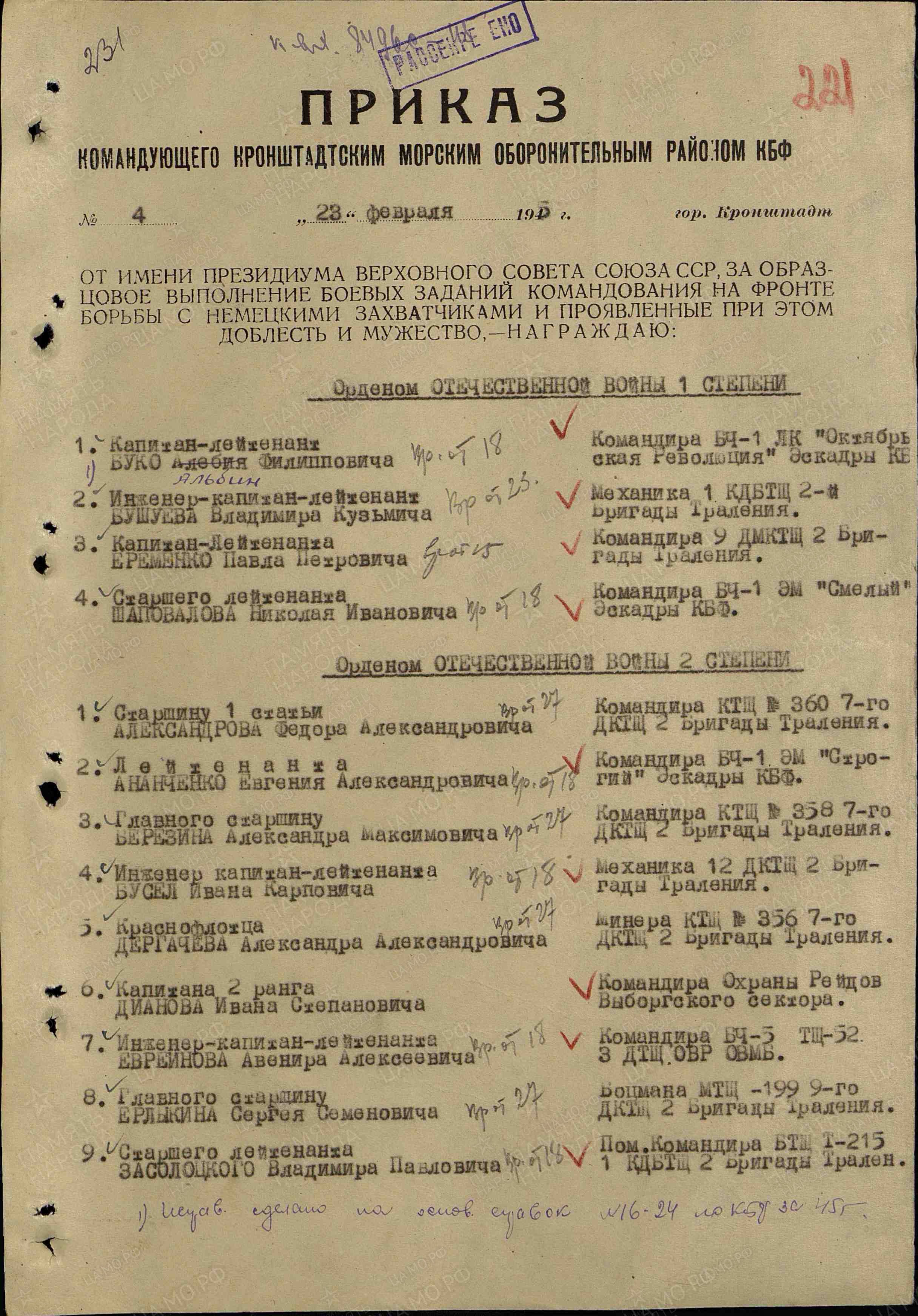 «За 1943-44 гг. участвовал в 103 боевых операциях, проведенных кораблем, в которых проявил мужество и отвагу, отличное знание техники и умение владеть ею, так, например, 30 октября 1943 года при поддержки тралящих кораблей в непосредственной близости от острова противника, при обстреле вражеского острова, благодаря четкой и правильной корректировке огня и руководства орудийным расчетом – подавил артиллерийскую батарею противника, препятствующую боевому тралению нашего соединения».