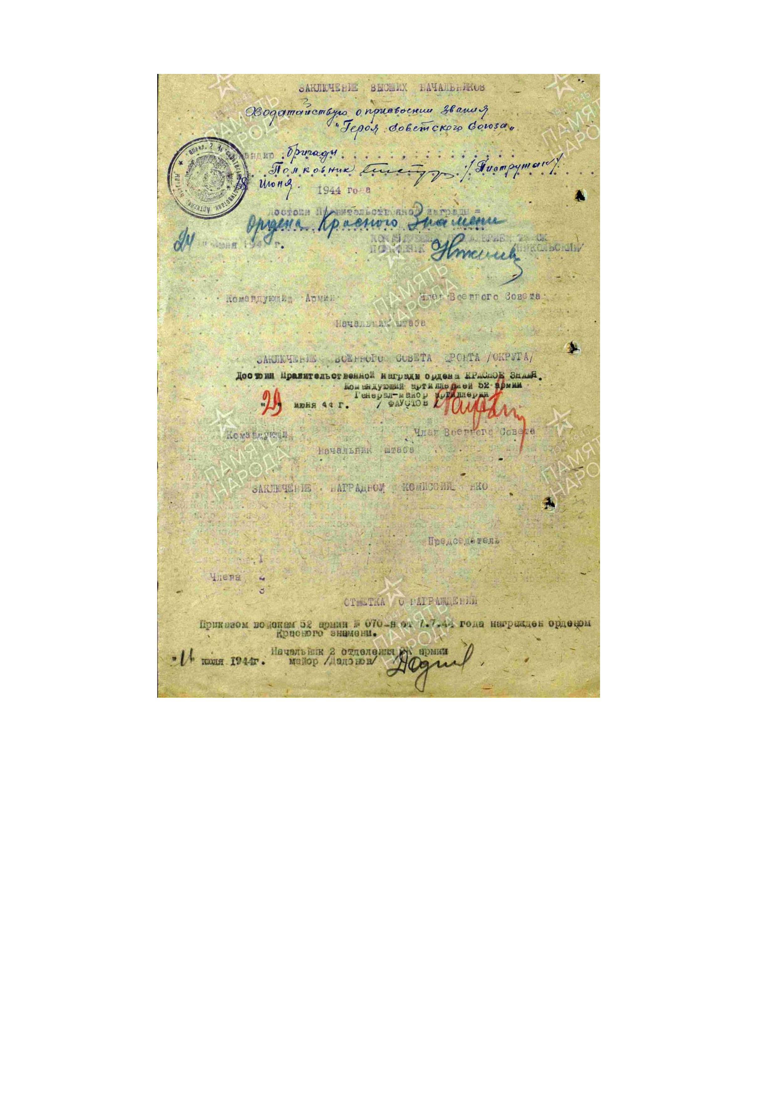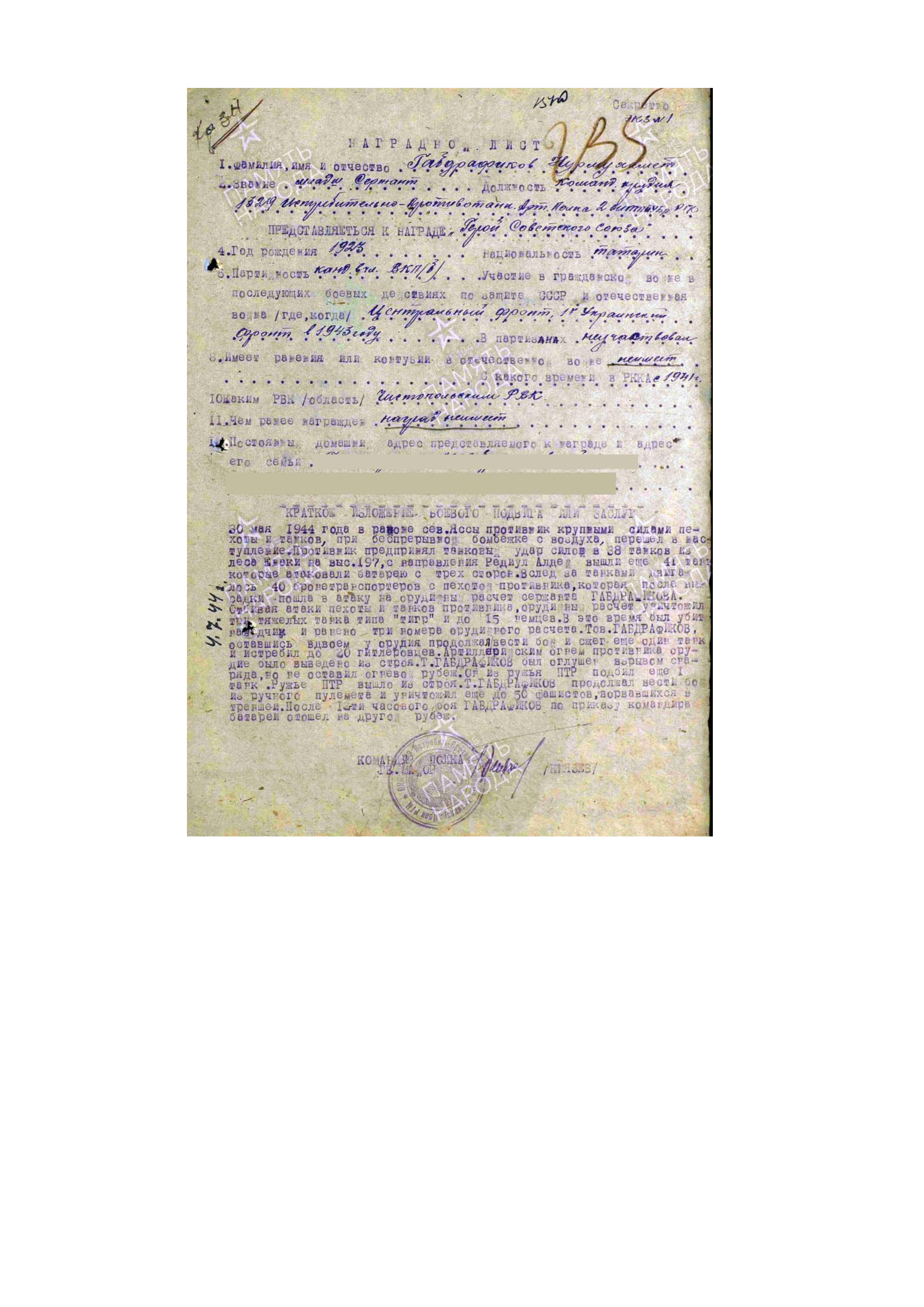 Представлен к званию Героя 18 июня 1944 г. командиром 2 отдельной истребительно-противотанковой артиллерийской бригады полковником Пистружак.