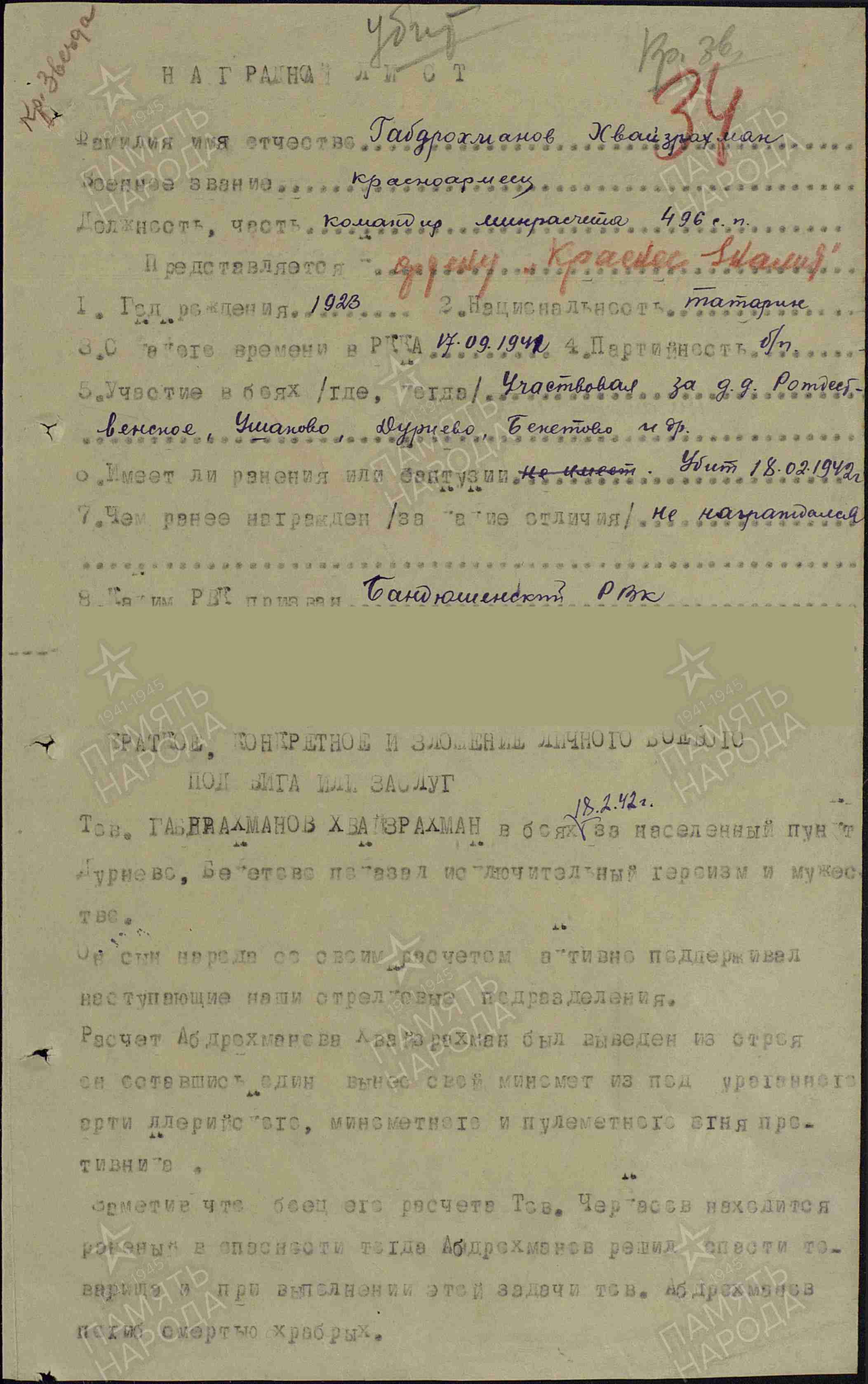 Из наградного листа: «Тов. Габдрахманов Хвайзрахман в боях 18.2.42 г. за населенный пункт Дурнево, Бекетово показал исключительный героизм и мужество. Он сын народа со своим расчетом активно поддерживал наступающие наши стрелковые подразделения. Расчет был выведен из строя, он, оставшись один, вынес свой миномет из-под ураганного артиллерийского, минометного и пулеметного огня противника. Заметив, что боец его расчета тов. Черкасов находится раненый в опасности, Абдрахманов решил спасти товарища и при выполнении этой задачи погиб смертью храбрых. На счету Габдрахманова более 40 убитых фашистских солдат и офицеров. Достоин правительственной награды ордена Красное Знамя». Награжден орденом Красной Звезды (15.06.1942 г.).