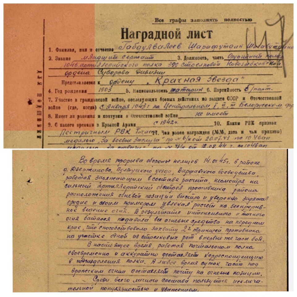 Габдулвалеев Шарафутдин Шигабутдинович 1903 г.р. кавалер ордена «Красной звезды». Во время прорыва обороны немцев 14.01.45 г. В районе деревни Держаново Пултусского уезда Варшавского воеводства, работая заряжающим в составе расчета, несмотря на сильный артиллерийский обстрел противника района расположения огневой позиции быстро и уверенно заряжал орудие и своим примером увлекал расчёт на беспрерывное ведение огня. В результате беспрерывного и точного огня батарея подавила все огневые средства на переднем крае, что способствовало захвату двух траншей противника на участке одной из стрелковых рот в первые часы боя. Работая почтальоном полка своевременно и аккуратно доставлял корреспонденцию в подразделения полка. В любое время суток, часто под вражеским огнем доставлял почту на огневые позиции. Среди всего личного состава пользовался исключительной популярностью и уважением...