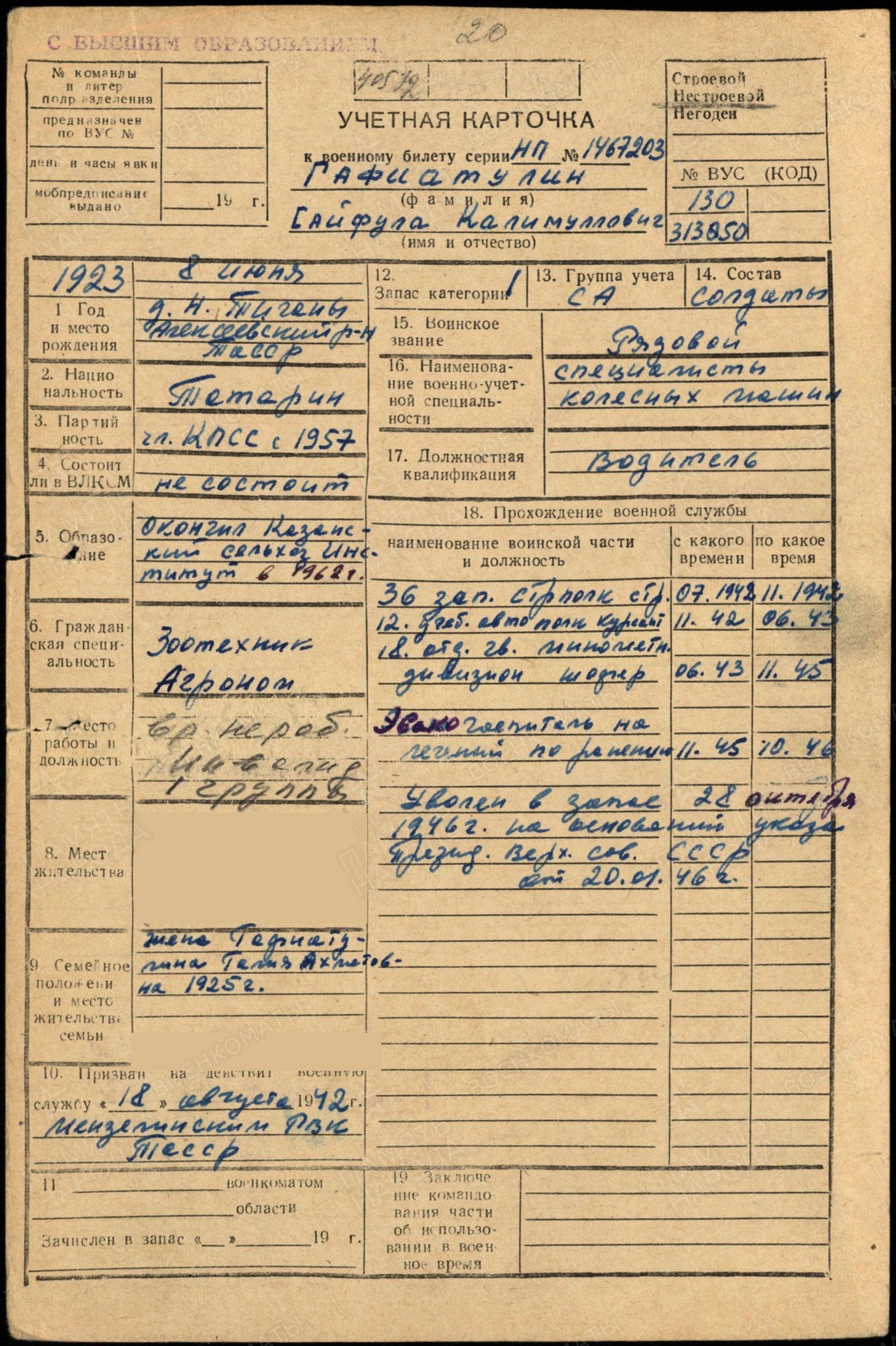 ГАФИАТУЛЛИН Сайфулла Калимуллович, 1923, с. Нижние Тиганы. Мобилизован 18 авг. 1942 Мензелинским РВК. Гв. красноармеец, шофёр 18 отд. гв. миномётный дивизион (с июня 1943). Имел одно ранение в грудь. Демобилизован в 1946. Умер 2003.