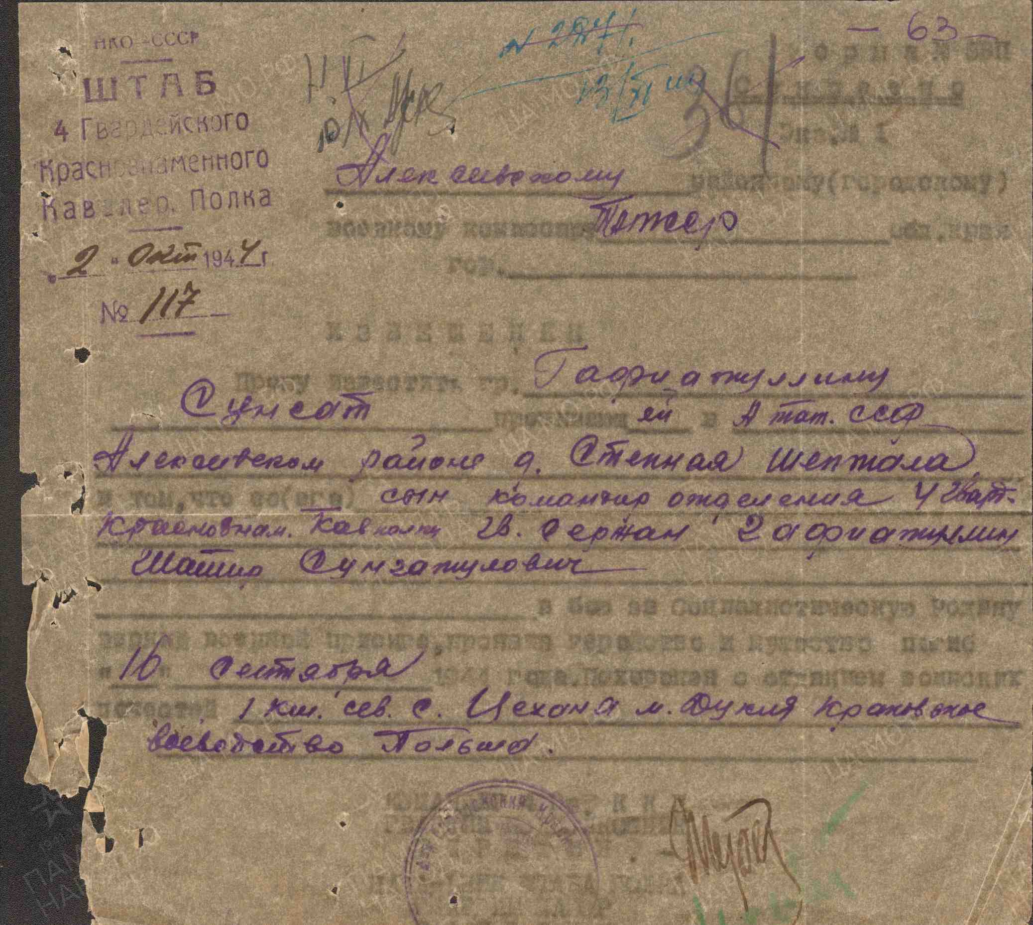 ГАФИАТУЛЛИН Шакир Сунгатович (Сунгатуллович), 1924, с. Степная Шентала. До призыва в армию работал в к-зе Им. Вахитова. Член ВЛКСМ. Мобилизован 25 авг. 1942 Алексеевским РВК. На фронте с 1943. Гв. сержант, ком. отделения 4 гв. КавП 2 гв. КавД 1 гв. КавК Юго-Западного, Воронежского фронта, 13 А/ 38 А 1 Украинского фронта. Награждён двумя медалями «За отвагу». Погиб 16 сент. 1944, м. Дукля, с. Цеханя, Кросненский повят, Подкарпатское воеводство, Польша.