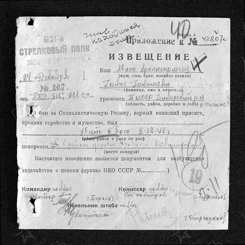 ГАЛЕЕВ Галимзян, 1910, с. Большие Тиганы. Мобилизован Билярским РВК 7 июля 1941. Красноармеец, 921 СП 249 СД 22 А Калининского фронта. Ошибочно учтён погибшим 8 дек. 1941, д. Давыдово (Дроздово)/ д. Замошье, Осташковский р-н, Калининская (Тверская) обл. Уволен по ранению.
