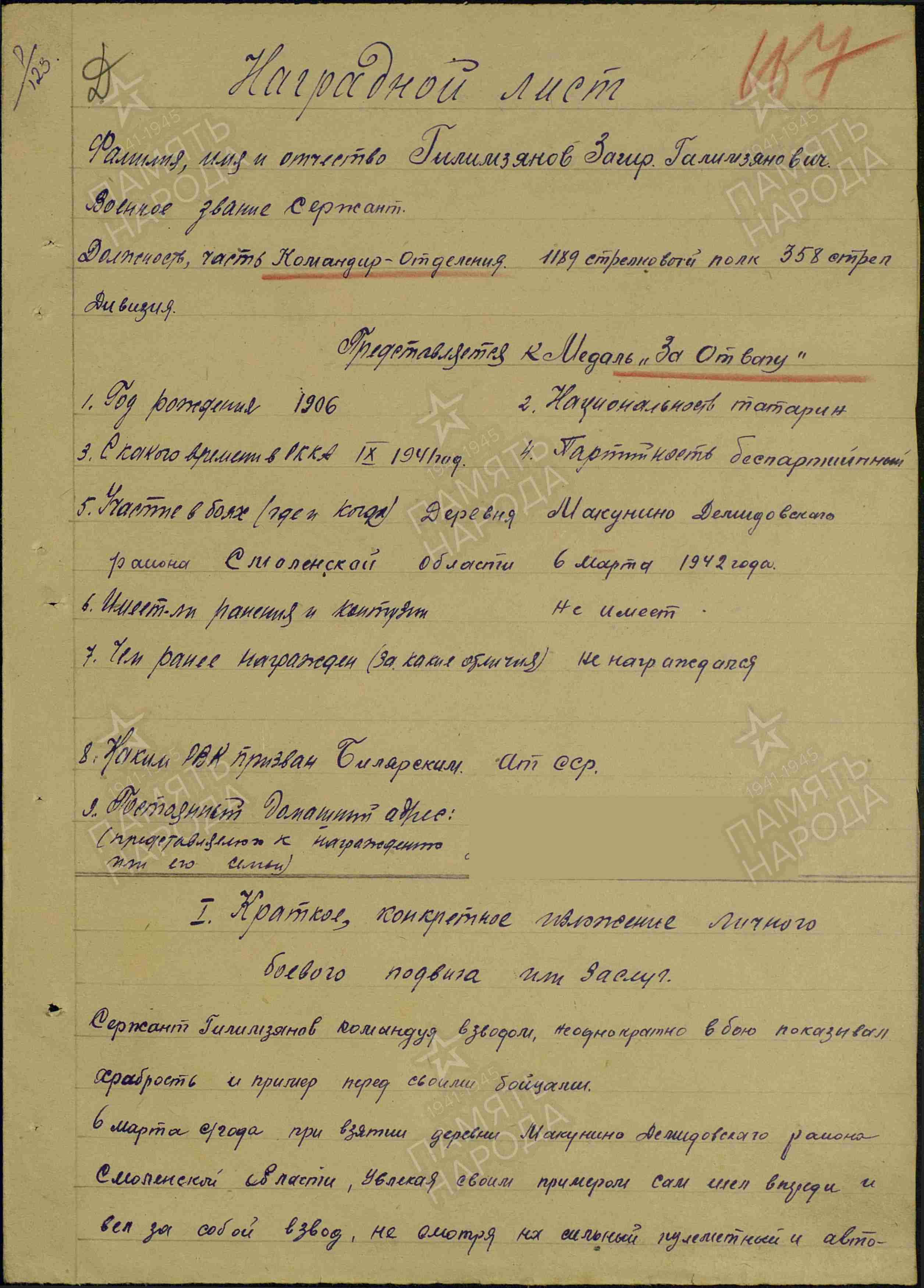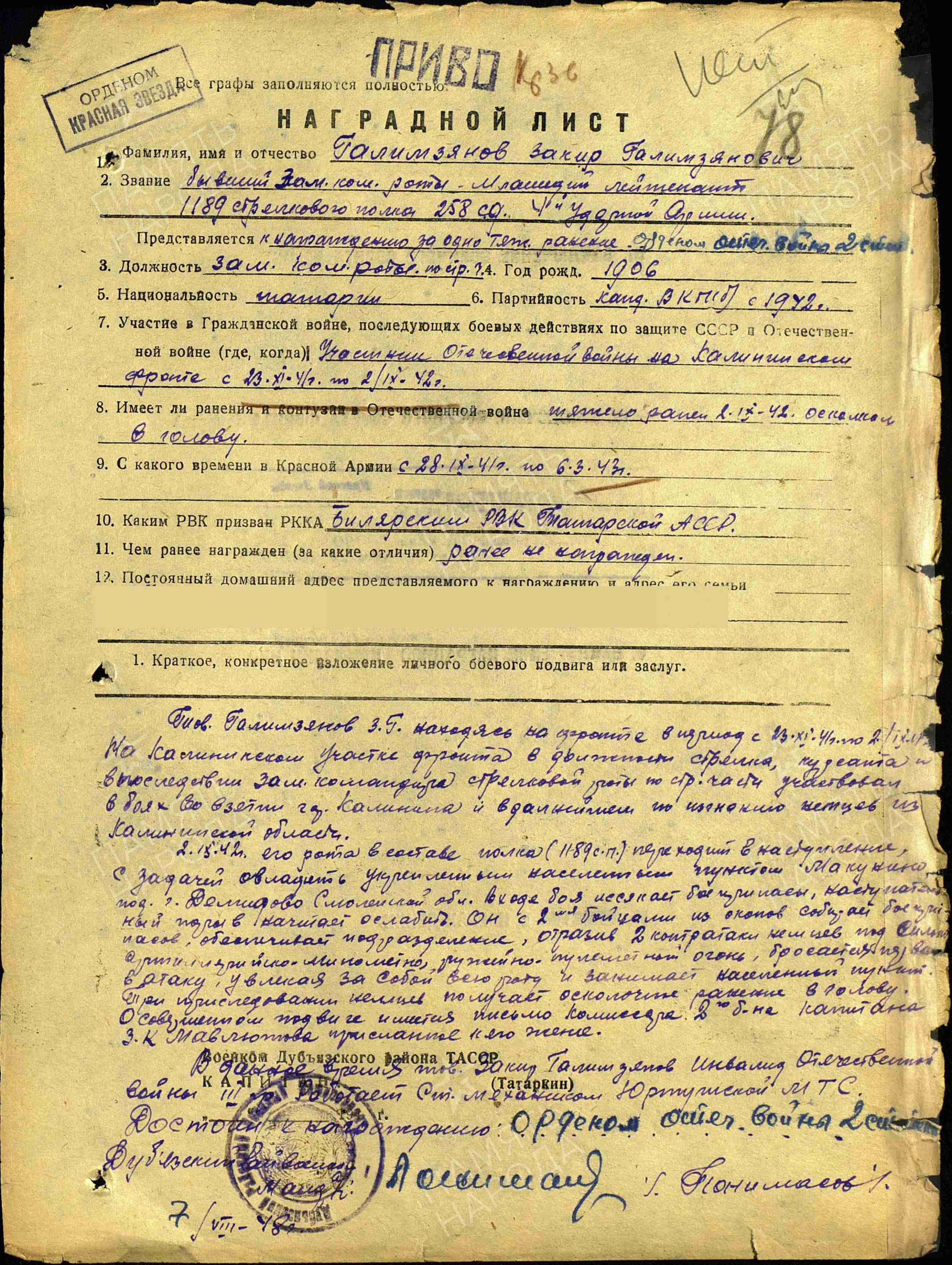 ГАЛИМЗЯНОВ Закир Галимзянович, 1906, с. Янгулово, Балтасинский р-н. До войны жил и работал в Билярском р-не, д. Гоголиха. Мобилизован Билярским РВК 28 сент. 1941. Сержант, ком. отделения на должности ком. взвода 1189 СП 358 СД 4 УдА Северо-Западного/ Калининского фронта. Окончил фронтовые курсы мл. офицеров. Мл. лейтенат, зам. ком. роты по строевой части. Канд. ВКП(б). 2 сент. 1942, в бою за д. Макунино, Демидовского р-на Смоленской обл., получил тяжёлое осколочное ранение в голову. Находился на излечении до 6 марта 1943, демобилизован по инвалидности 3 гр. Работал ст. механиком МТС в Дубъязском р-не. Награждён медалью «За отвагу» (1942), орденом Красной Звезды (1951).