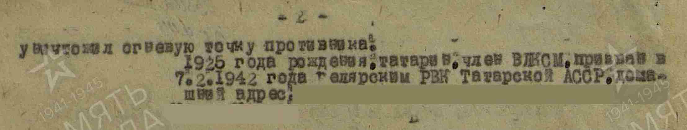 ГАЛИУЛЛИН Зиннат (Зиннатулла) Шарифуллович (Шарифович), 1925, с. Ошняк. Жил в п. Кызыл Чишма. Член ВЛКСМ. До призыва в армию работал в к-зе им. Вахитова. Мобилизован 7 янв. 1943. Мл. сержант, наводчик пулемёта 1326 СП 415 СП 61 А Брянского/ Центрального/ 2 Белорусского фронта, 13 А 1 Украинского фронта. Перенёс ранение. После излечения воевал на той же должности в составе 717 СП 170 СД 48 А/ 50 А/ 3 А 1 Белорусского фронта. Награждён двумя медалями «За отвагу» (янв., июнь 1944). По данным военкомата – письменная связь с семьёй прекратилась в фев. 1944. Учтён пропавшим без вести.