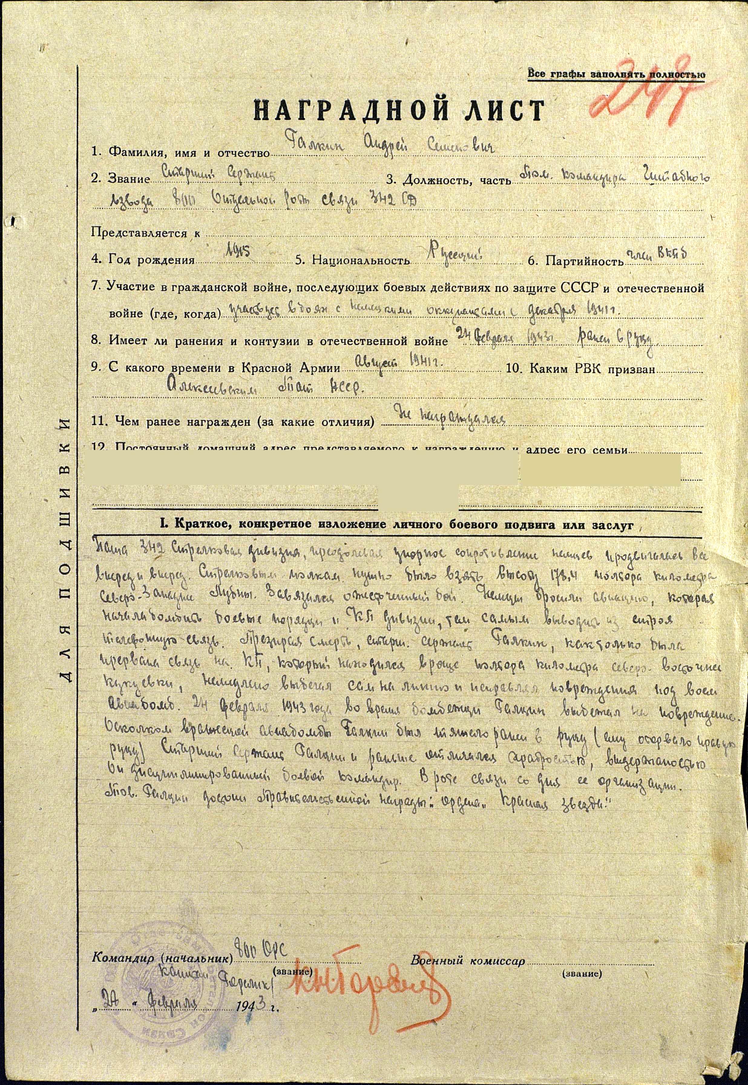 ГАЛКИН Андрей Семёнович, 1915, д. Бурцево. Мобилизован в РККА в 1941 г. Алексеевским РВК. Ст. сержант, 629 СП. Пропал без вести в 1944 г. По другим сведениям был помощником командира штабного взвода 800 отдельной роты связи 342 СД. 24 февраля 1943 г. под г. Лубны исправляя связь, повреждённую авиабомбами, получил тяжёлое ранение правой руки. За мужество был представлен к ордену Красная Звезда. Дальнейшая судьба неизвестна. Предположительно: умер в госпитале в феврале 1943г., похоронен в с. Бандики, Арсеньевский р-н, Тульская обл.