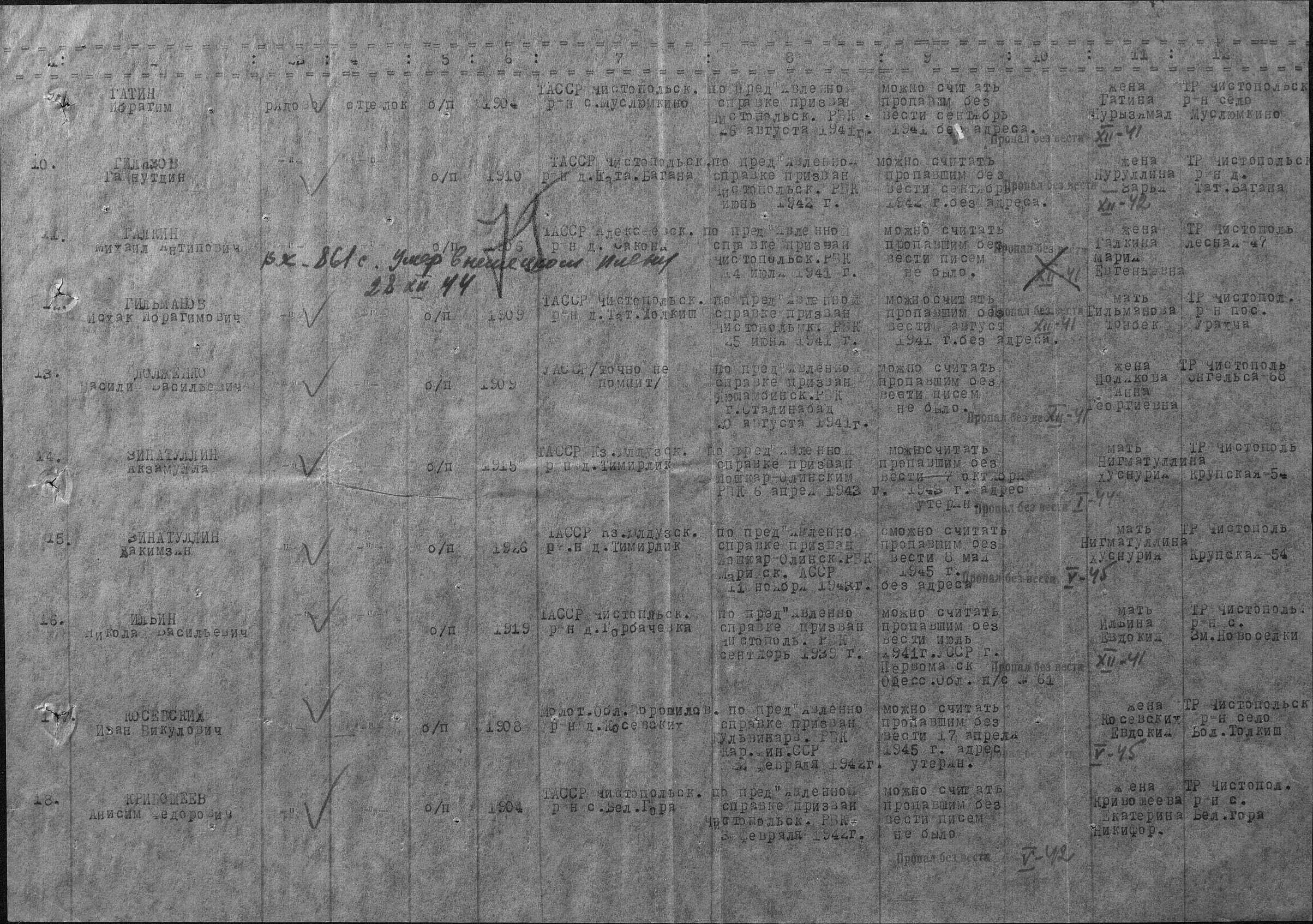 ГАЛКИН Михаил Антипович, 11 ноября 1906, с. Саконы Алексеевского района. Призван 14 июля 1941 г. Чистопольским РВК. Красноармеец, 232 СП. Пленен в Эстонии 17 августа 1941 г. Содержался в дулаге 101. Лагерный номер 252023. Умер 28 декабря 1944 г. Место захоронения: Фихтенхайн.