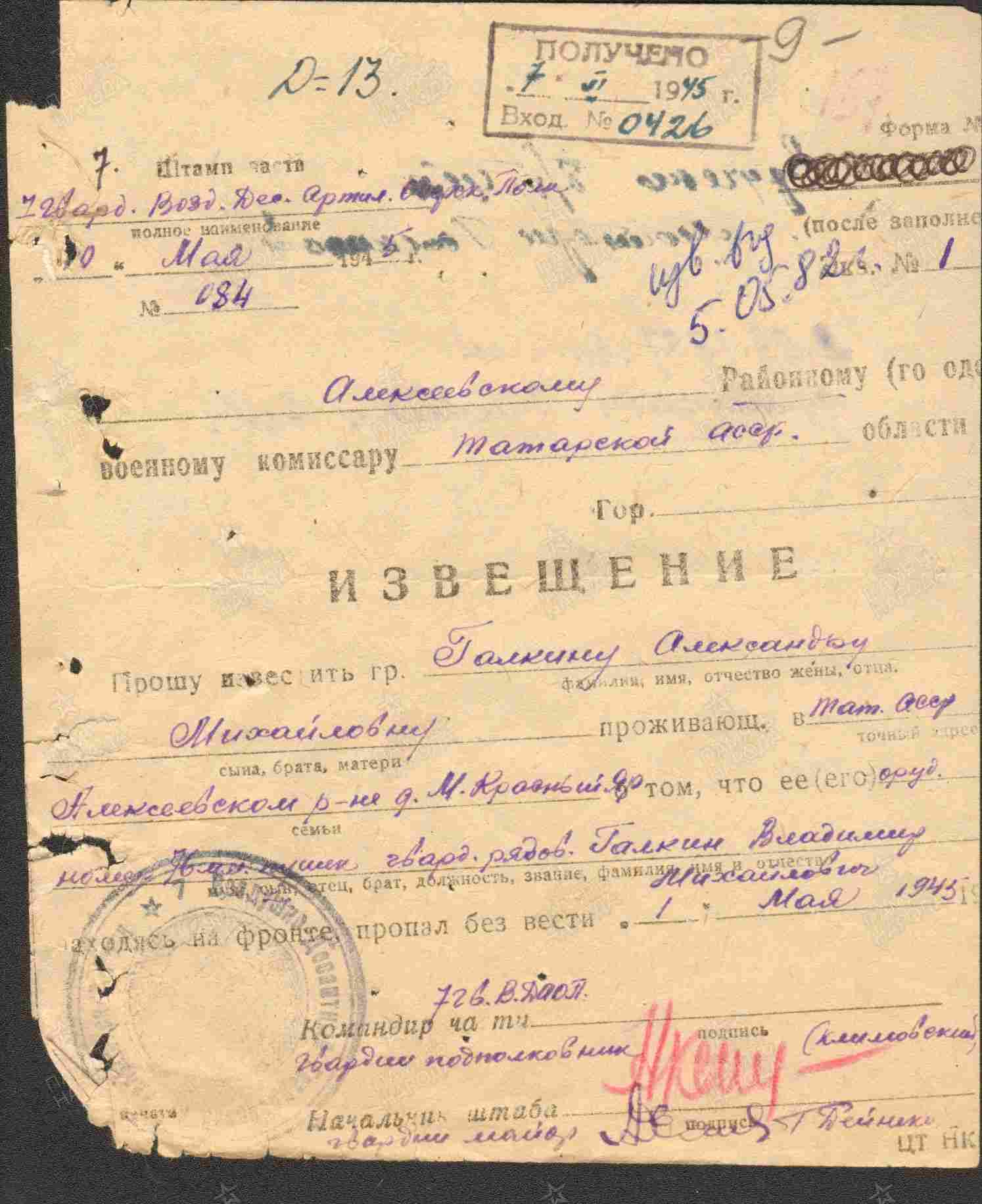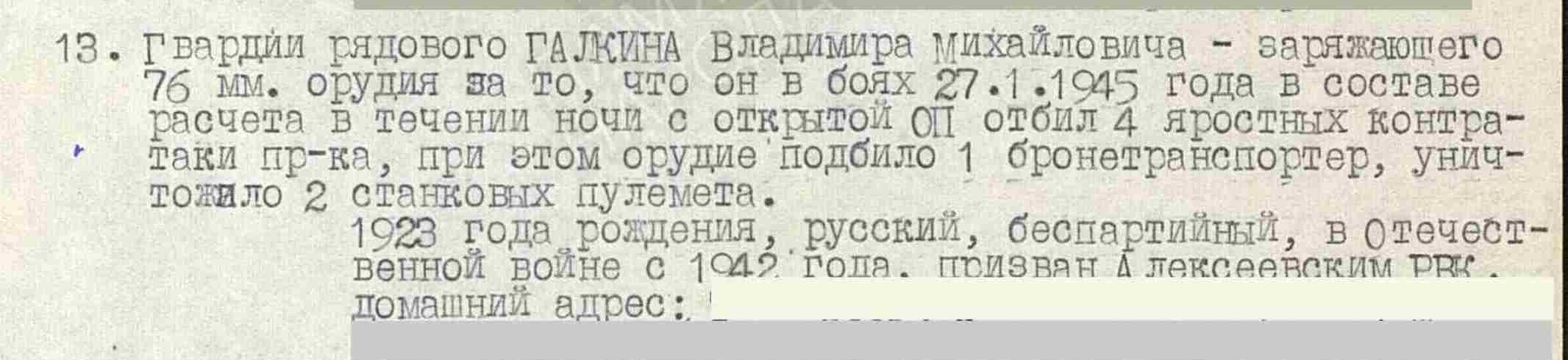ГАЛКИН Владимир Михайлович, 1923, д. Малый Красный Яр. Член ВЛКСМ. Мобилизован Алексеевским РВК 20 мая 1942. В боях с июля 1943 на Брянском фронте. Участник битвы на Курской дуге. Гв. красноармеец, подносчик миномётных мин 299 гв. МинП 10 гв. ТК 4 ТА, заряжающий 76 мм орудия 21 гв. КавП 7 гв. КавД 1 гв. КавК, орудийный номер 7 гв. ВДАП 9 гв. ВДД 5 гв. А 1 Украинского фронта. Награждён двумя медалями «За отвагу». Пропал без вести 1 мая 1945 в р-не г. Каменц, округ Дрезден, Саксония, Германия, в ходе Берлинской наступательной операции.
