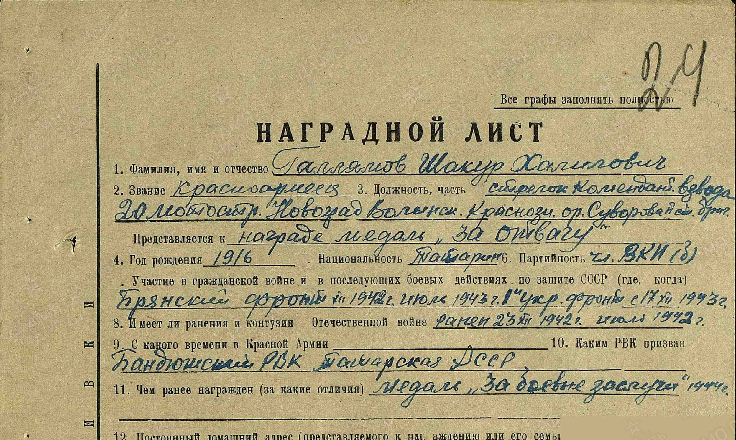 Красноармеец, санитар медико-санитарного взвода 20 мотострелковой бригады; стрелок комендантского взвода штаба бригады. Брянский, Первый Украинский. В 1942 г. был ранен.