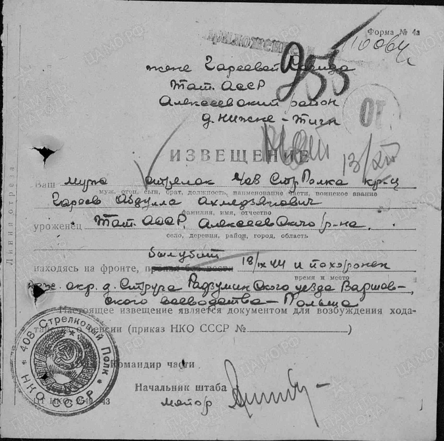 ГАРАЕВ (ГАРЕЕВ) Абдулла Ахмедзянович, 1900, с. Нижние Тиганы. Пункт и дата мобилизации не установлены. Переведён в состав РККА 29 апр. 1944 из партизанского отряда, Белоруссия. Красноармеец, 408 СП 1 СД 70 А 2 и 1 Белорусского фронта. Погиб 18 сент. 1944, с. Струга, Радзыминский уезд, Варшавское воеводство. Увековечен на братском захоронении в г. Варшава.
