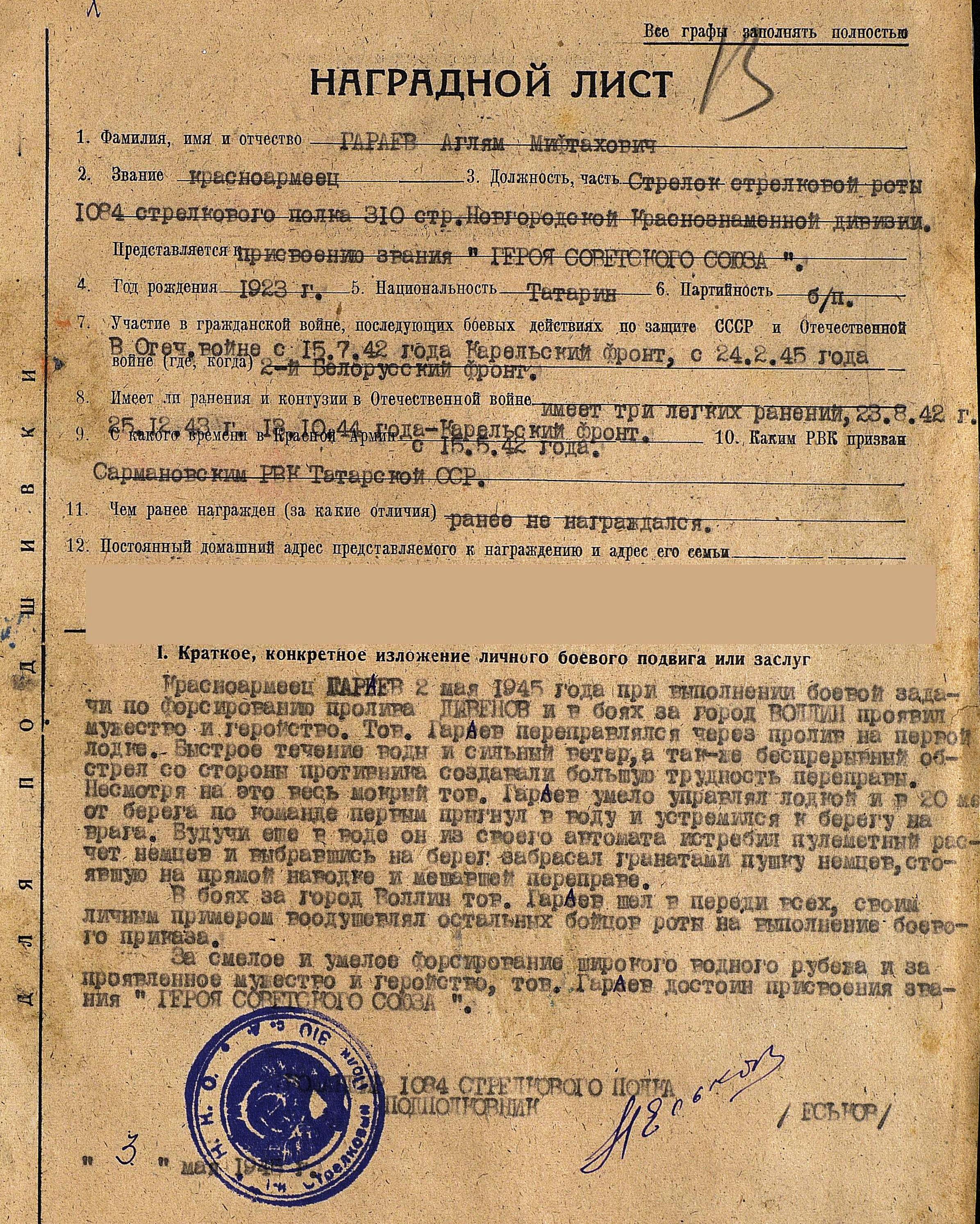 «Хәтер” китабы. Гәрәев Әгъләм, 1023, Сарман РХк моб., к-арм, 25.08.1942 һәлак булган, Тверь өлк., Зубцов р-ны, Михеево ав. (?) җирл. (62бит)