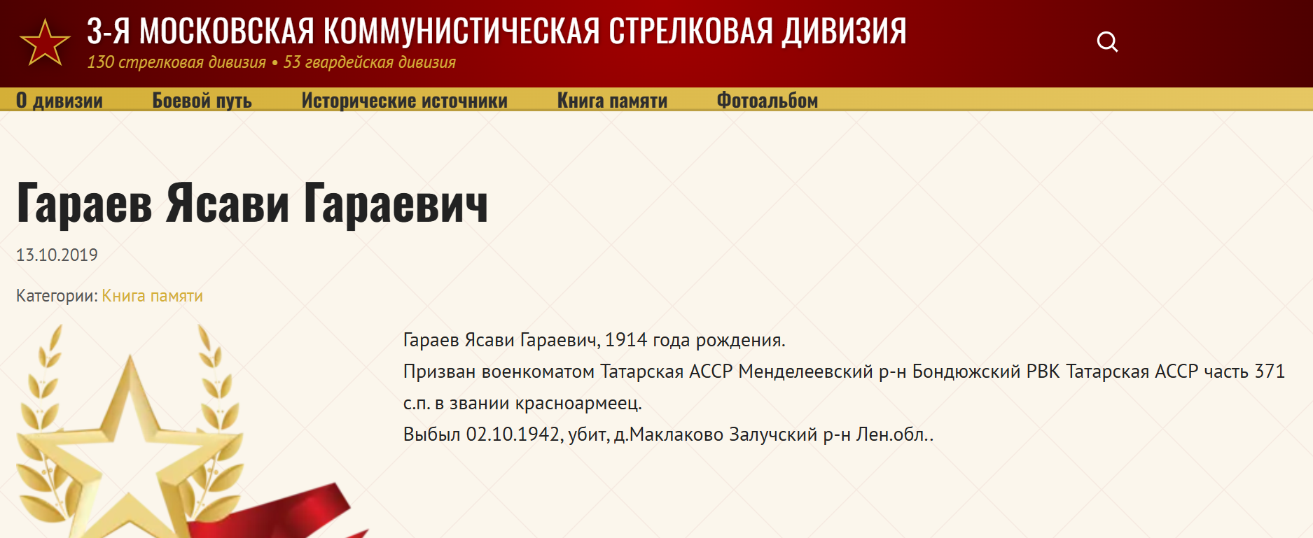 В донесении о потерях записан как Горяев Ясавий Гордеевич, жена Горяева Амина, Бондюжский район, д.Куразово.
