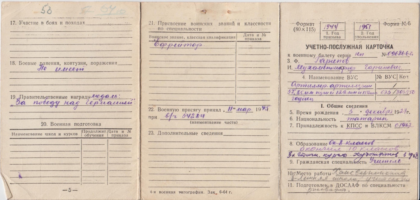 Нас, 17-18-летних ребят, забрали в Красную Армию в ноябре 1944 года. Мамы, целуя и благословляя на прощание, говорили: «Какие же вы ещё юные, возвращайтесь живыми и здоровыми!» Нас направили в город Инзу Ульяновской области в 56 –ую стрелковую дивизию, где готовили младший командирский состав. Начались занятия. Во время вечерней переклички мою фамилию не называют ни в первый день, ни в последующие 3 дня. Некоторые товарищи шутили: «Уезжай домой, твоего имени здесь нет». Я обратился к старшине роты Исаеву, вместе с ним мы обнаружили в списке фамилию Хайруллина, на которую во время переклички никто не откликался. Так я стал Хайруллиным. Комсомольский билет, выданный на имя Мухаметшарифа Гарипова, забрали, обещав выдать новый, но сделать это не успели, так как я уже уехал.