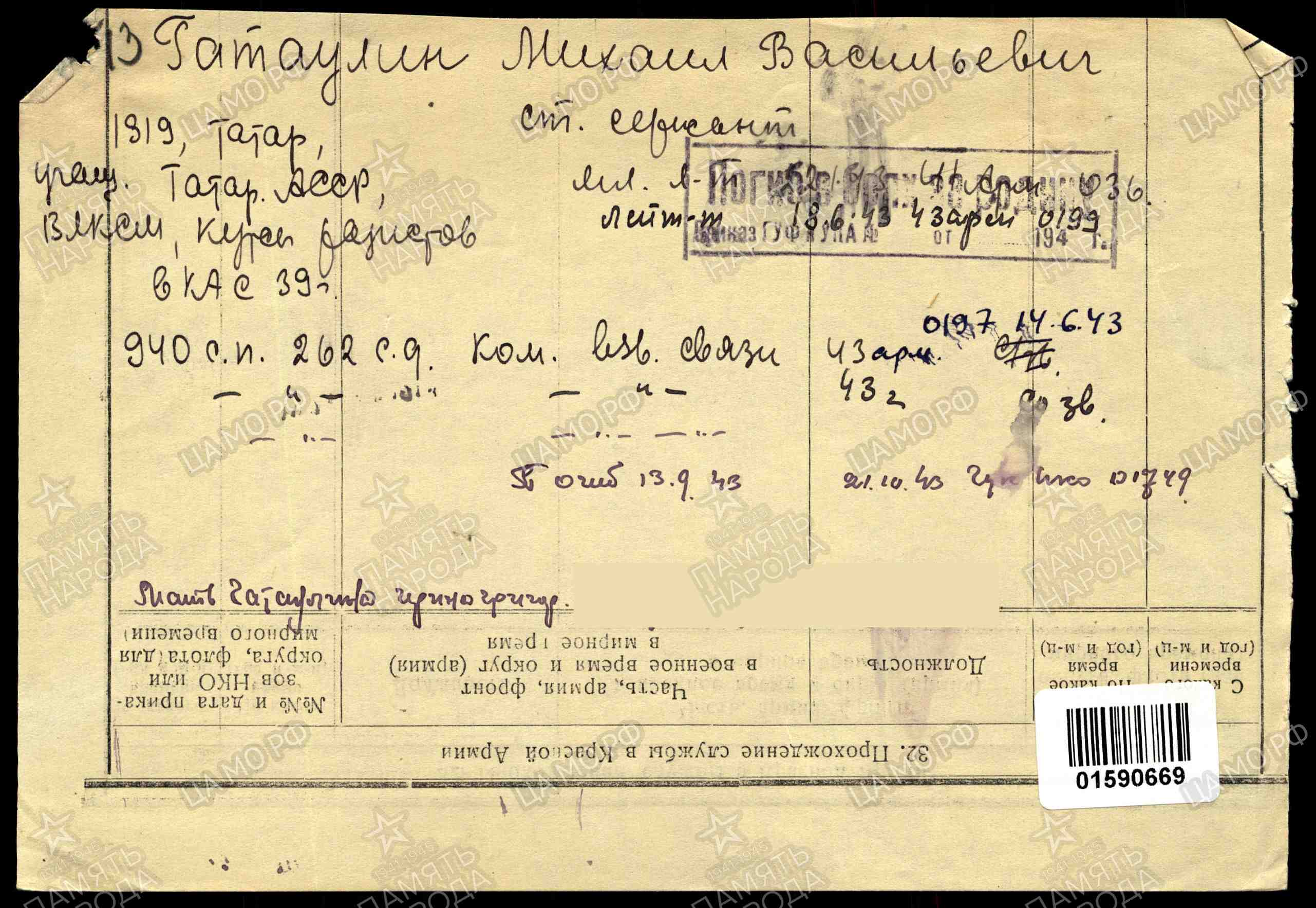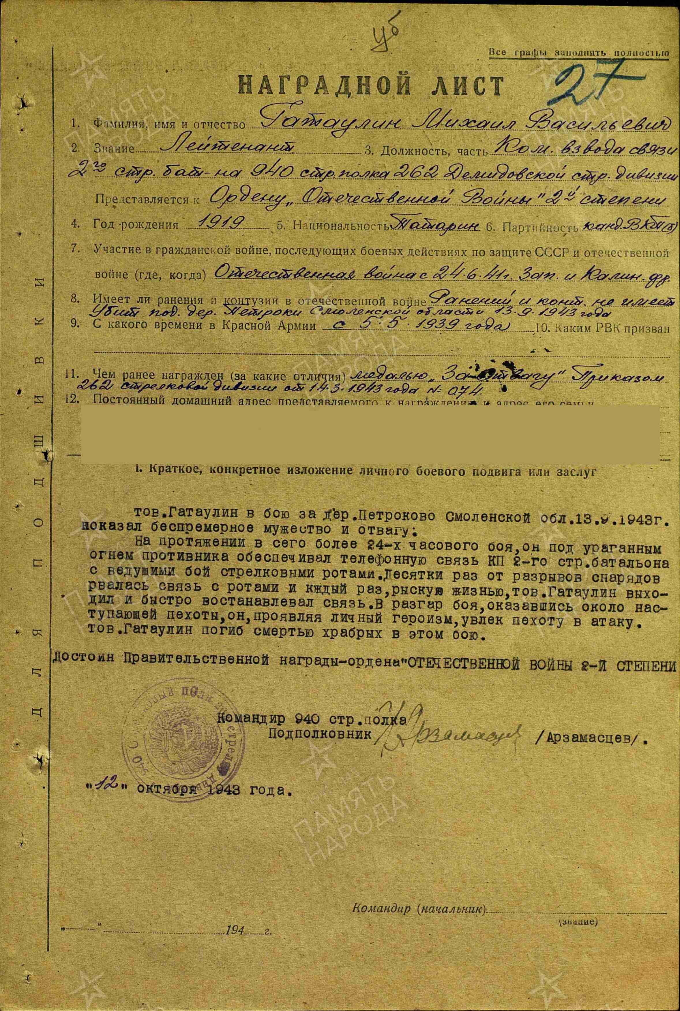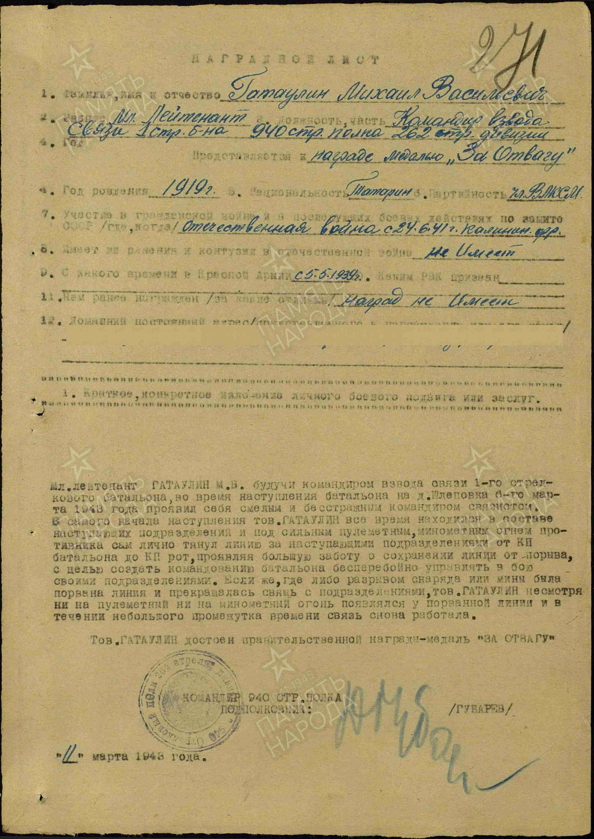 ГАТАУЛЛИН Михаил Васильевич, 1919, с. Верхняя Татарская Майна. Призван в РККА Билярским РВК 5 мая 1939. Участник войны с 24 июня 1941. Ст. сержант, радист. Воевал на Западном и Калининском фронте. Член ВЛКСМ/ канд. ВКП(б). Прошёл фронтовые офицерские курсы. С 1943 – мл. лейтенант/ лейтенант, ком. взвода связи 940 СП 262 СД 43 А Калининского фронта. Награждён медалью «За отвагу», орденом Отечественной войны 2 ст. (посмертно). Погиб 13 сент. 1943, д. Петраки (Петраково). Похоронен в д. Зараевка. Увековечен на братском захоронении в д. Немощёное, Духовщинский р-н, Смоленская обл.