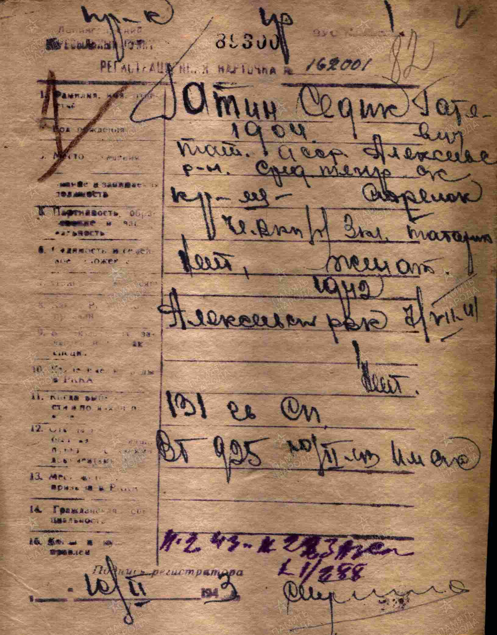 ГАТИН Садык Гатинович, 1904, с. Средние Тиганы. Мобилизован Алексеевским РВК 7 июля 1941. Красноармеец/ гв. красноармеец. Воевал в составе 131 гв. СП 45 гв. СД 67 А Ленинградского фронта. Был ранен и находился на излечении в военном госпитале № 925, г. Ленинград. 10 фев. 1943 направлен в 340 СП 46 СД 55 А ЛенФ. Погиб 20 марта 1943 в р-не торфоразработок в окр. г. Колпино, Ленинградская обл.