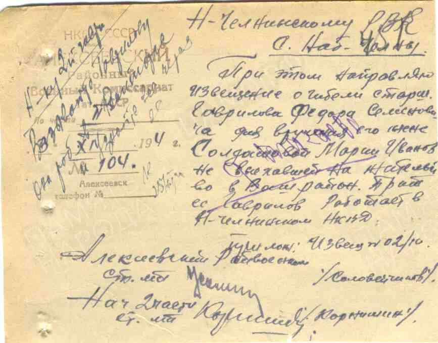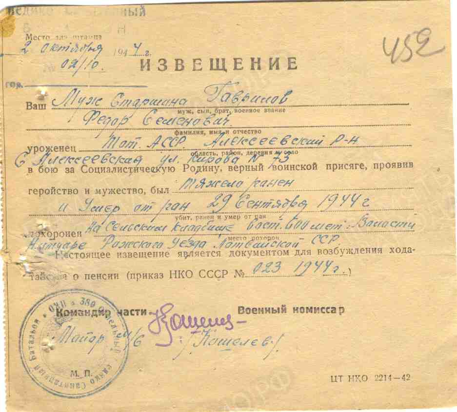 ГАВРИЛОВ Фёдор Семёнович, 1905, с. Алексеевское. Мобилизован Алексеевским РВК 13 авг. 1942. Член ВКП(б). Воевал на Волховском, Ленинградском, 3 Приб. фронтах. Сапёр 220 ОТБр. Ранен 12 апр. 1943. Старшина, повозочный батареи 120 мм миномётов, пом. ком. взвода 783 СП 229 СД. Награждён медалями "За отвагу", "За оборону Ленинграда". Представлен к ордену Красной Звезды в сент. 1944. Награждён орденом Славы 3 ст. 29 сент. 1944 тяжело ранен осколком в грудь, умер от ран в ОМСБ 380. Похоронен в могиле № 77 у с. Нитауре Рижского уезда ЛатвССР.