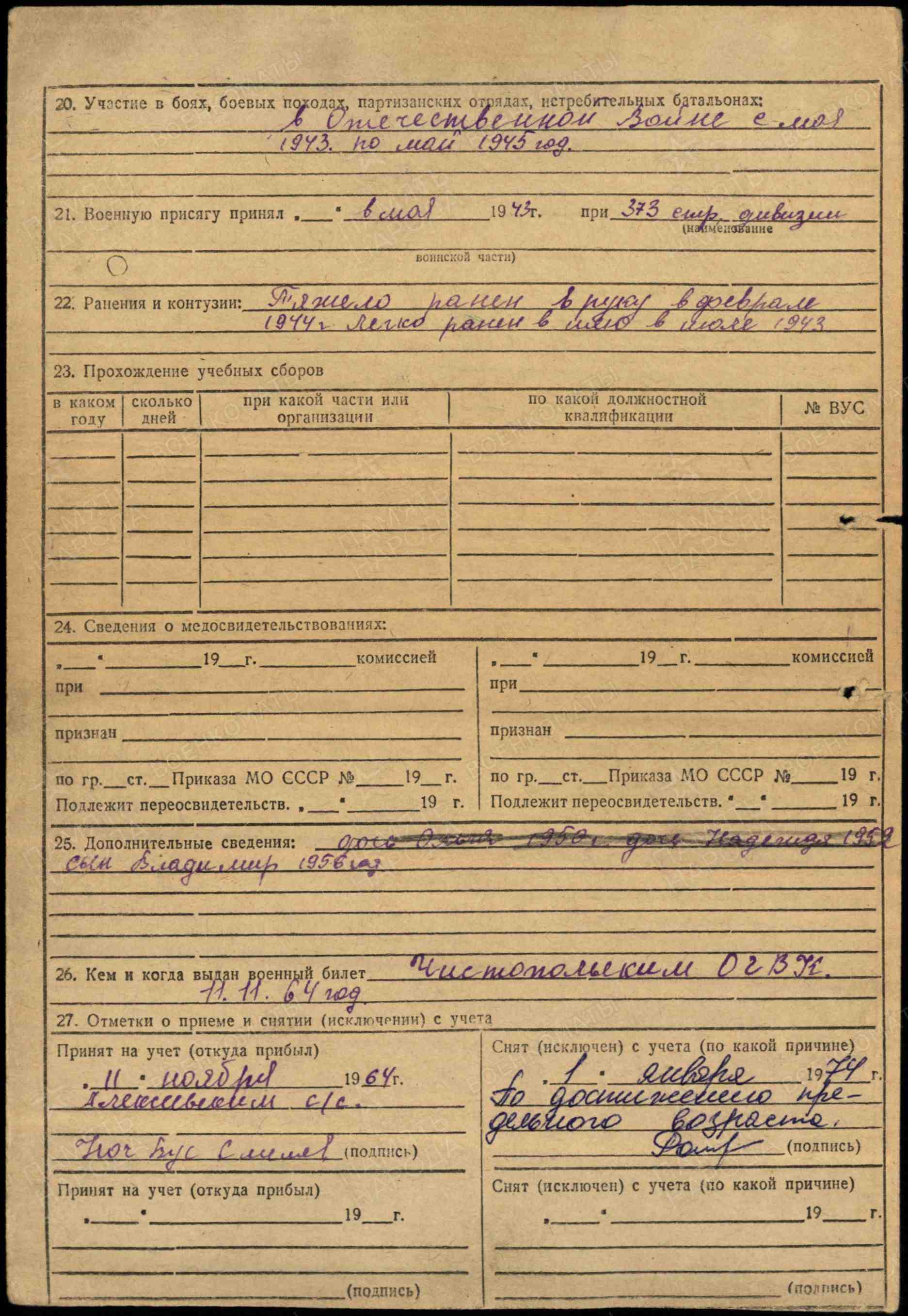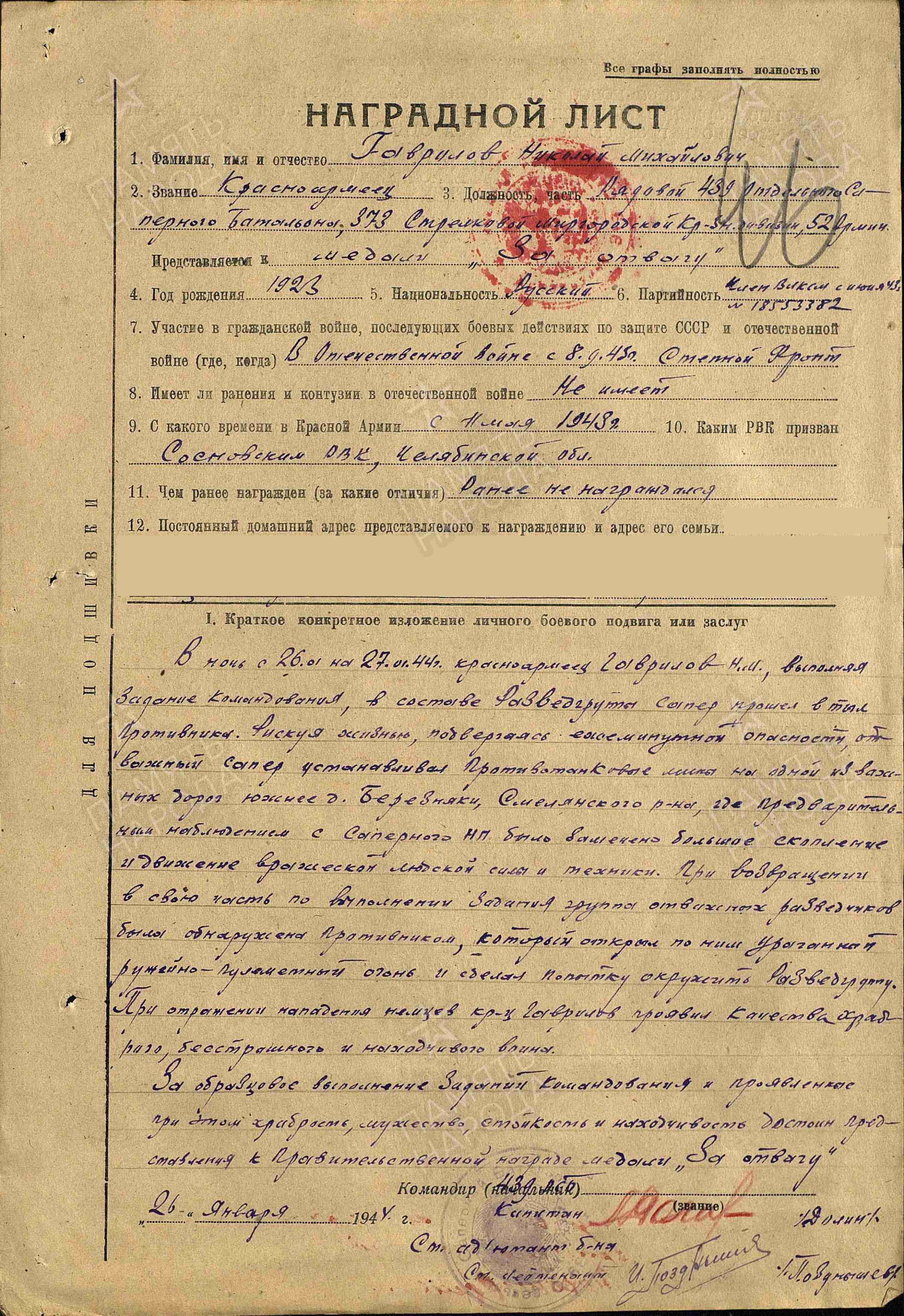 ГАВРИЛОВ Николай Михайлович, 1923, д. Кошаново. Мобилизован Сосновским РВК Челябинской обл. 12 мая 1943. Член ВЛКСМ. Красноармеец, сапёр/ минёр 439 отд. сапёрного батальона 373 СД 52 А Воронежского/ 2 и 1 Украинского фронта. Участник форсирования Днепра и освобождения Украины. Легко ранен в шею в 1943, тяжело ранен в ногу в фев. 1944. Демобилизован 25 сент. 1945. В послевоенное время переехал в п. Алексеевское. Работал в с-зе «Красный Восток». Награждён медалью «За отвагу», орденом Отечественной войны 2 ст. (1985).