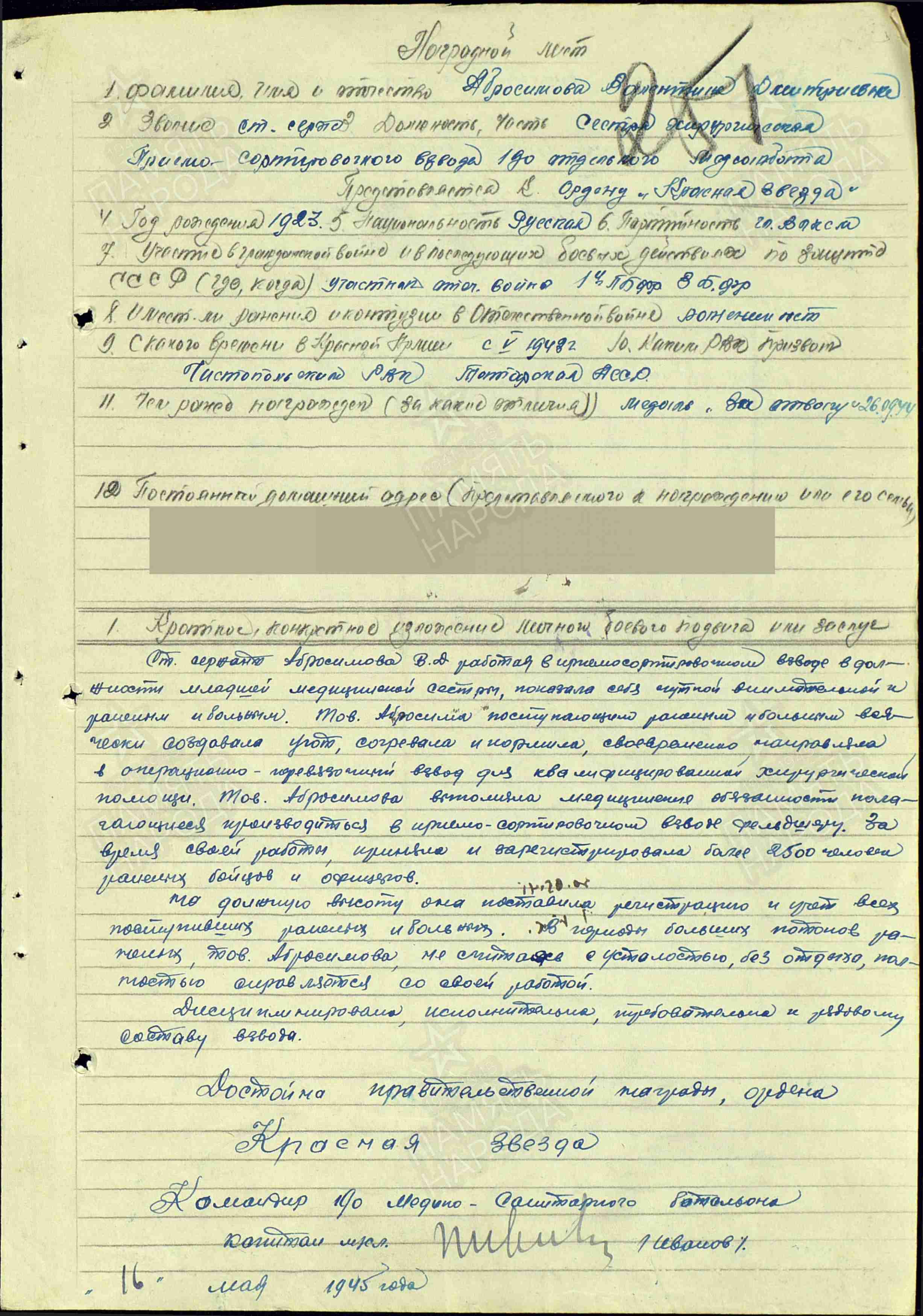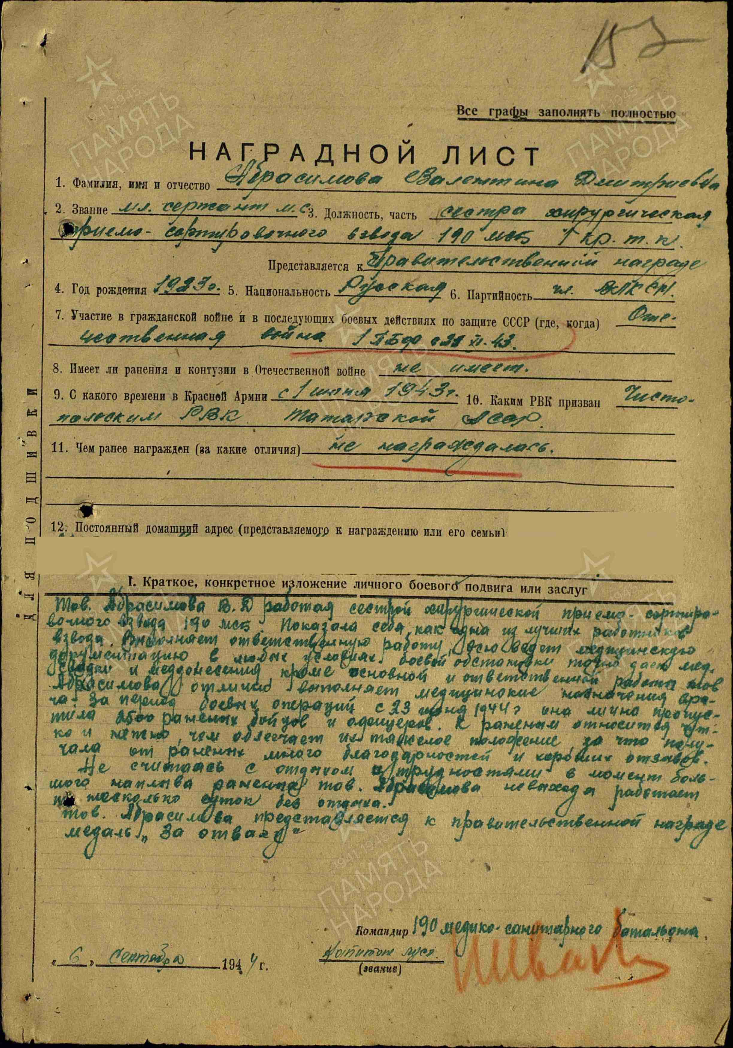 ГАВРИЛОВА (АБРОСИМОВА) Валентина Дмитриевна, 1923, с. Масловка. Член ВЛКСМ. Мобилизована Чистопольским РВК 1 июня 1943. Мл. сержант/ ст. сержант медицинской службы. Первоначально направлена в Учебный центр зенитной артиллерии, 1720 ЗенАП. С 21 нояб. 1943 – хирургическая сестра приёмно-сортировочного взвода 190 отд. МСБ 1 ТК 2 Прибалтийского и 3 Белорусского фронта. Награждена медалями «За отвагу», «За взятие Кёнигсберга», орденами Красной Звезды, Отечественной войны 2 ст. (1985). Скончалась в 2009.
