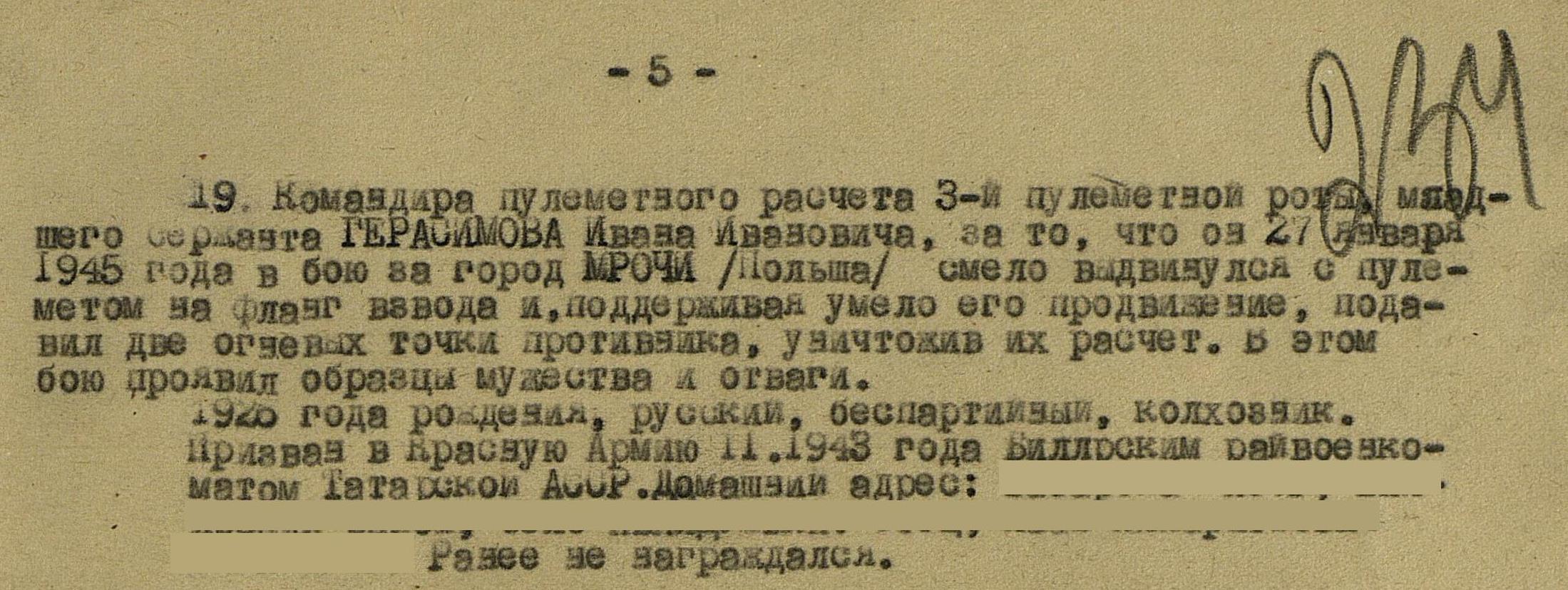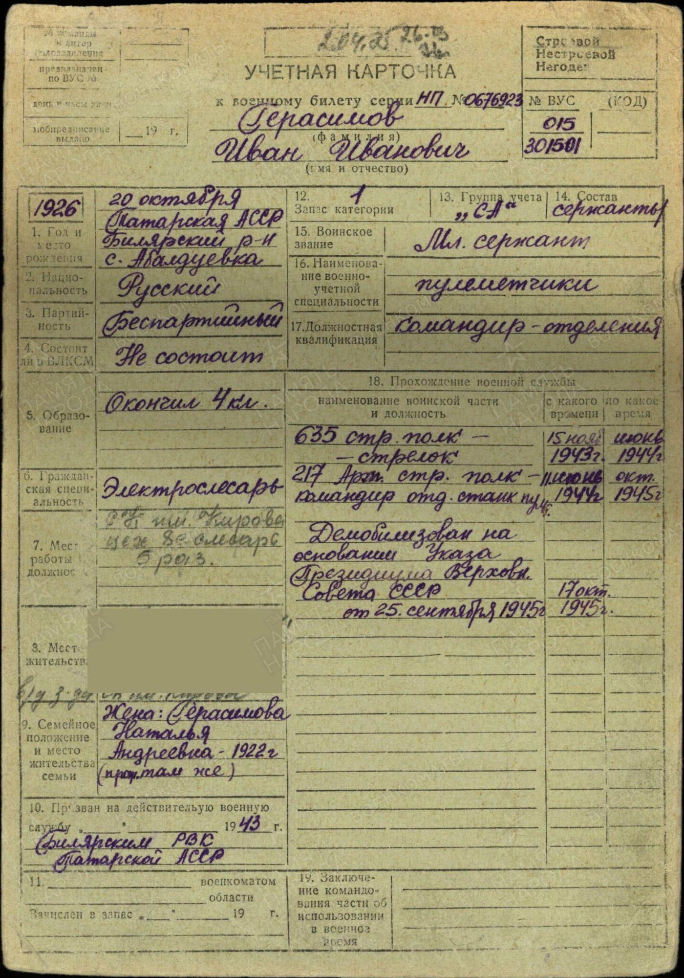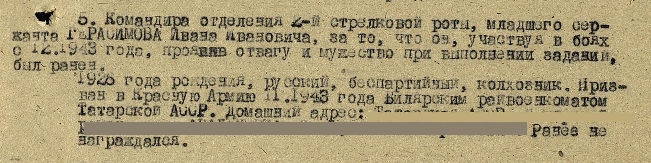 ГЕРАСИМОВ Иван Иванович, 1926, с. Абалдуевка. До призыва в армию работал в к-зе «Искра». Мобилизован Билярским РВК 15 нояб. 1943. Мл. сержант, ком. отделения 1026 СП 260 СД 47 А 1 Белорусского фронта. В боях перенёс три ранения: 7 июля 1944 в правое плечо, 2 фев. 1945 в правую руку, 19 апр. 1945 в правую ногу. Демобилизован 17 окт. 1945. Награждён медалями «За боевые заслуги», «За отвагу», орденом Отечественной войны 1 ст. (1985). Жил в г. Казань, работал слесарем 5 разряда 8 цеха Казанского з-да синтетического каучука им. Кирова.