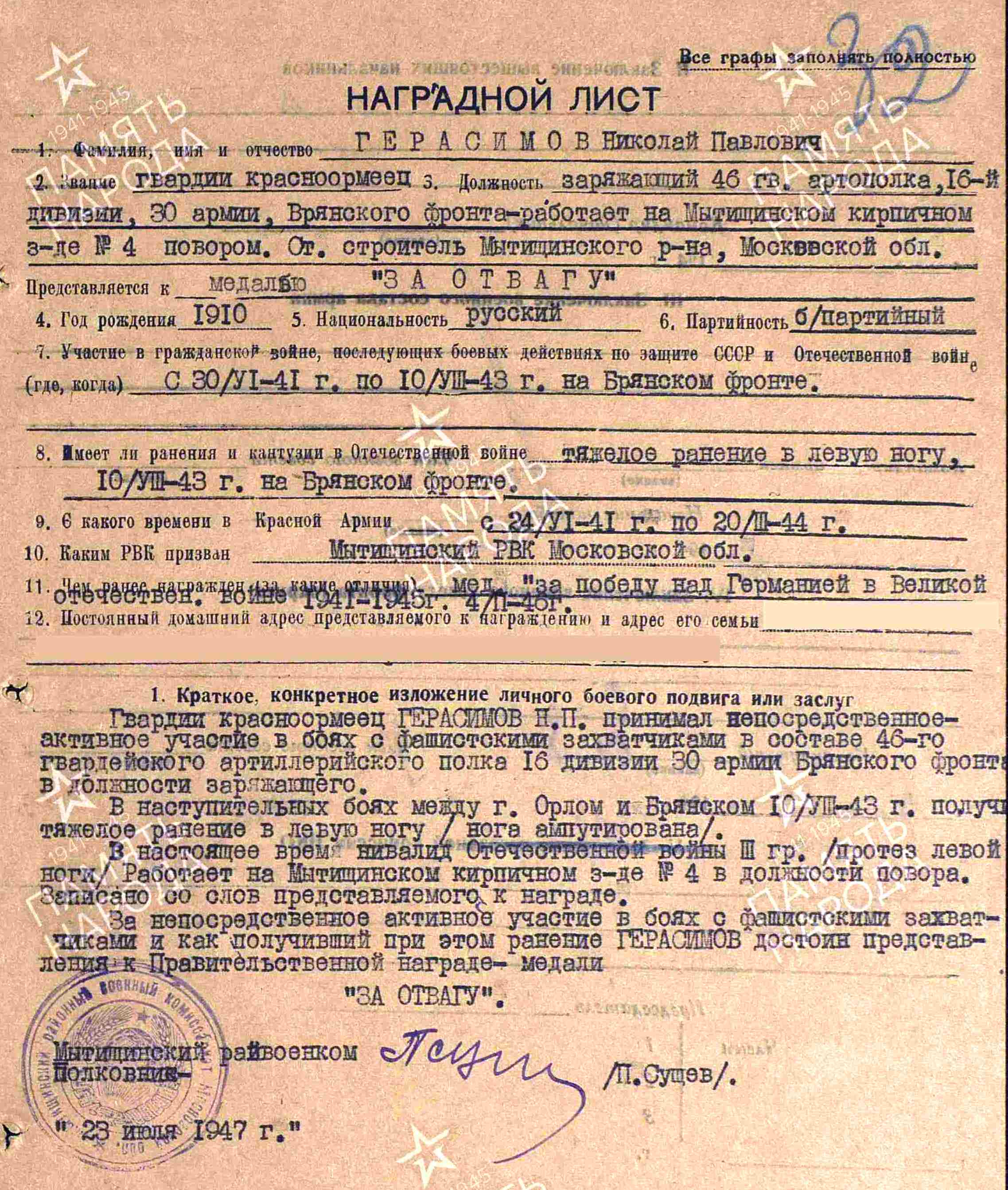 ГЕРАСИМОВ Николай Павлович, 1910, с. Балахчино. Мобилизован 24 июня 1941 Мытищинским РВК Московской обл. Воевал на Калининском, Северо-Западном, Западном, Брянском фронте в составе 22 А/ 4 УдА/ 16 А/ 58 А/ 30 А/ 50 А/ 33 А/ 11 гв. А. Красноармеец/ гв. красноармеец, заряжающий батареи 792 АП 249 СД/ 44 гв. АП 16 гв. СД. Участник битвы на Курской дуге. Тяжело ранен 10 авг. 1943 в левую ногу с ампутацией. ППроходил лечение в ЭГ 1066, г. Тула, ЭГ 3750, г. Свердловск. Демобилизован по инвалидности 3 гр. 6 марта 1944. Работал поваром на Мытищинскоим кирпичном заводе № 4. Награждён орденом Красной Звезды (1947).