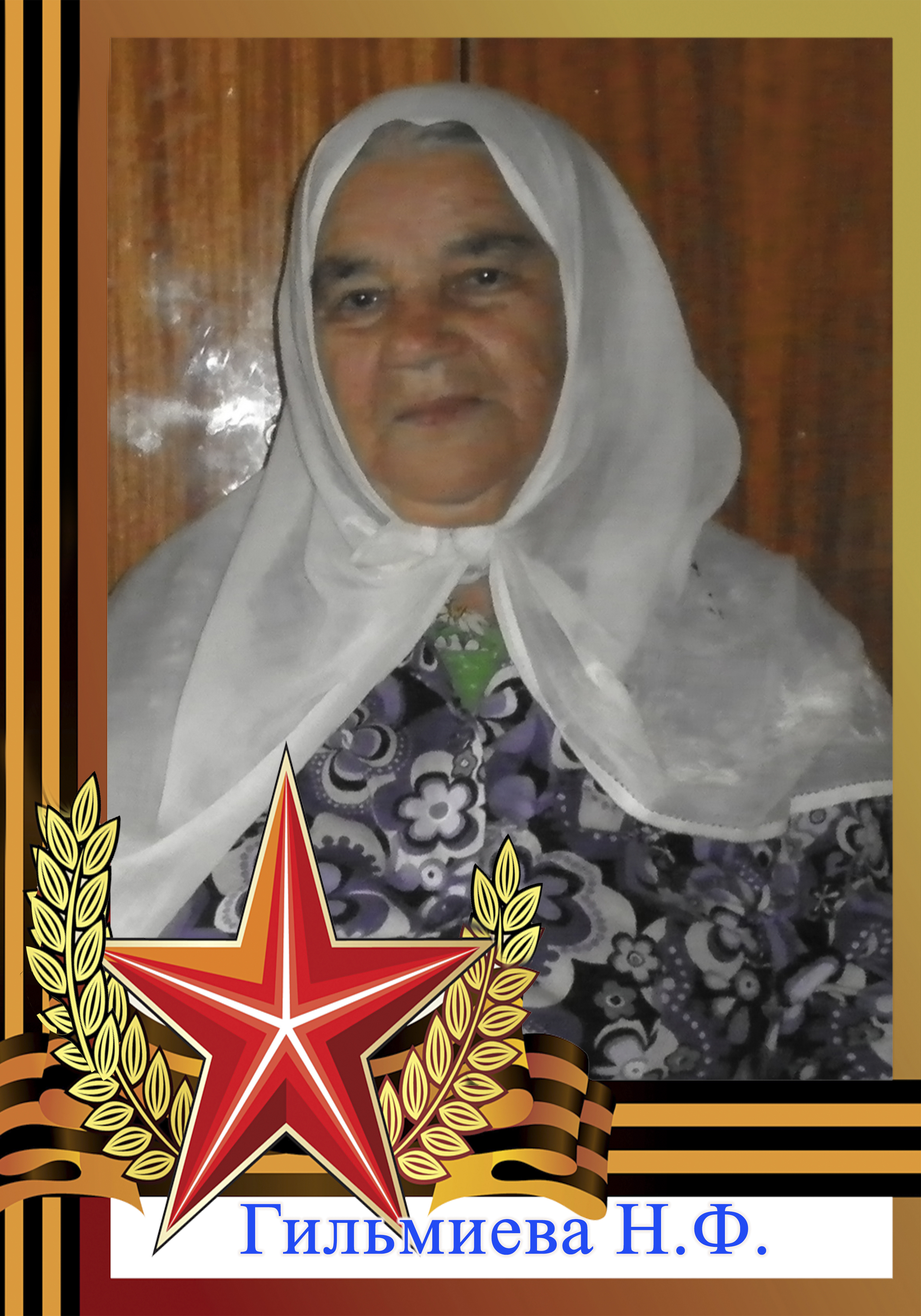 Труженица тыла. Родилась 11.03.1931 в с. Ургагары Алькеевского района РТ. Во время Вел. Отеч. войны работала на зернотоке разнорабочей, потом работала на ферме.