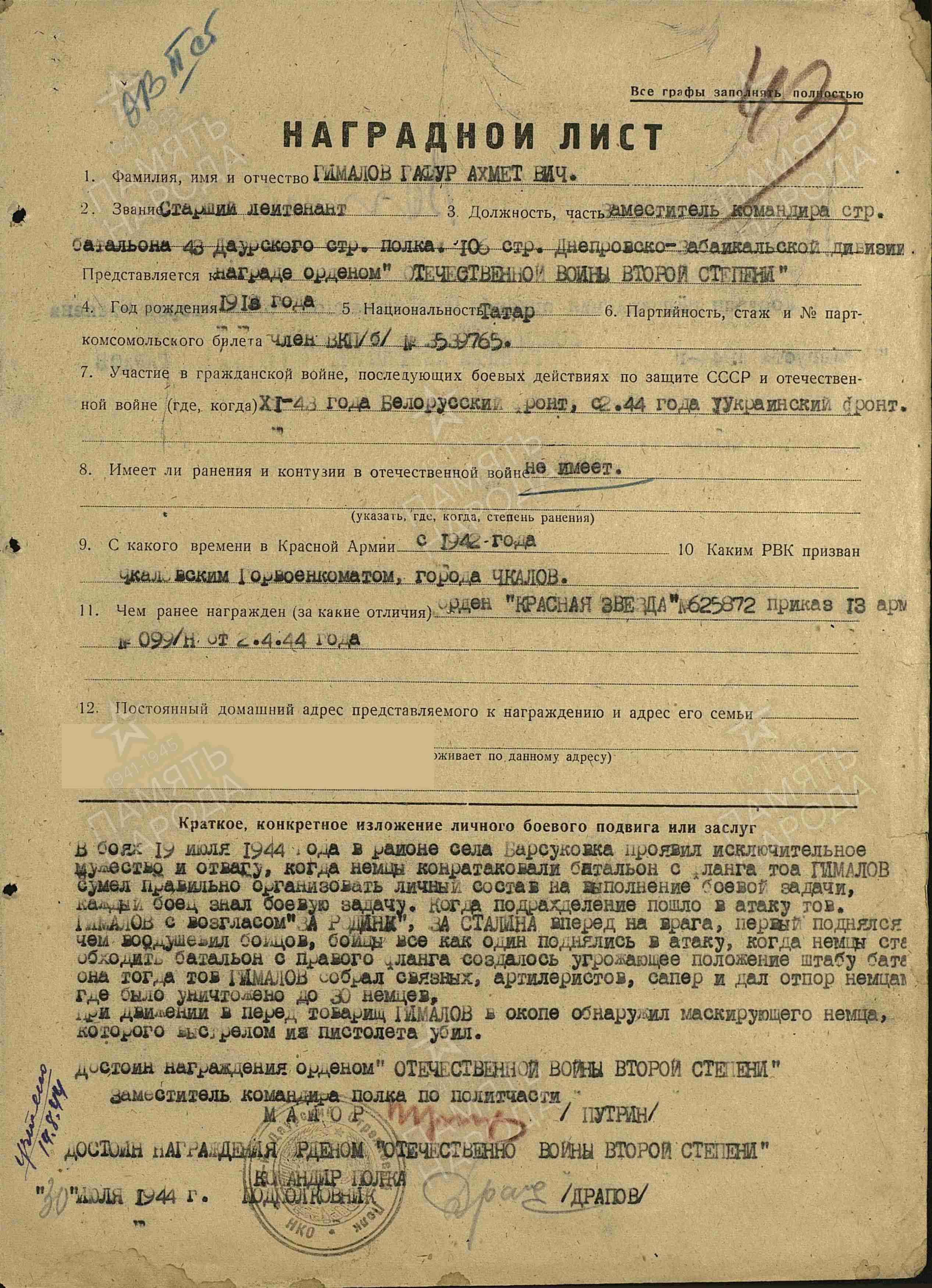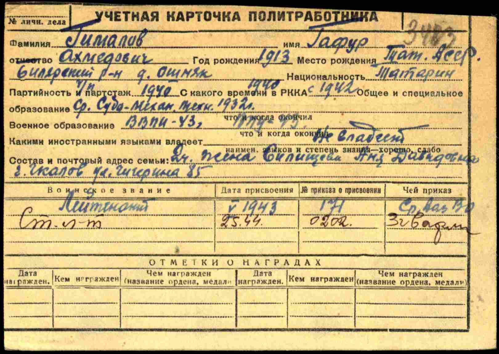 ГИМАЛОВ Гафур Ахметович, 1913, с. Ошняк. Мобилизован 1 июля 1942 Адамовским РВК Чкаловской (Оренбургской) обл./ Чкаловским ГВК. Член ВКП(б). Зам. политрука. Окончил военно-полит. уч-ще/ курсы военно-педагогического института. В апр. 1943 присвоено звание «лейтенант». С 29 дек. 1943 – ст. лейтенант, зам. ком. батальона по полит./ строевой части 43 СП 106 СД в составе 65 А/ 13 А/ 3 гв. А на Белорусском и 1 Украинском фронте. Участник освобождения Белоруссии, Украины и Польши. Награждён орденами Красной Звезды, Отечественной войны 2 ст. Погиб 19 авг. 1944, д. Дамброва, Красницкий повят, Люблинское воев-во, Польша.