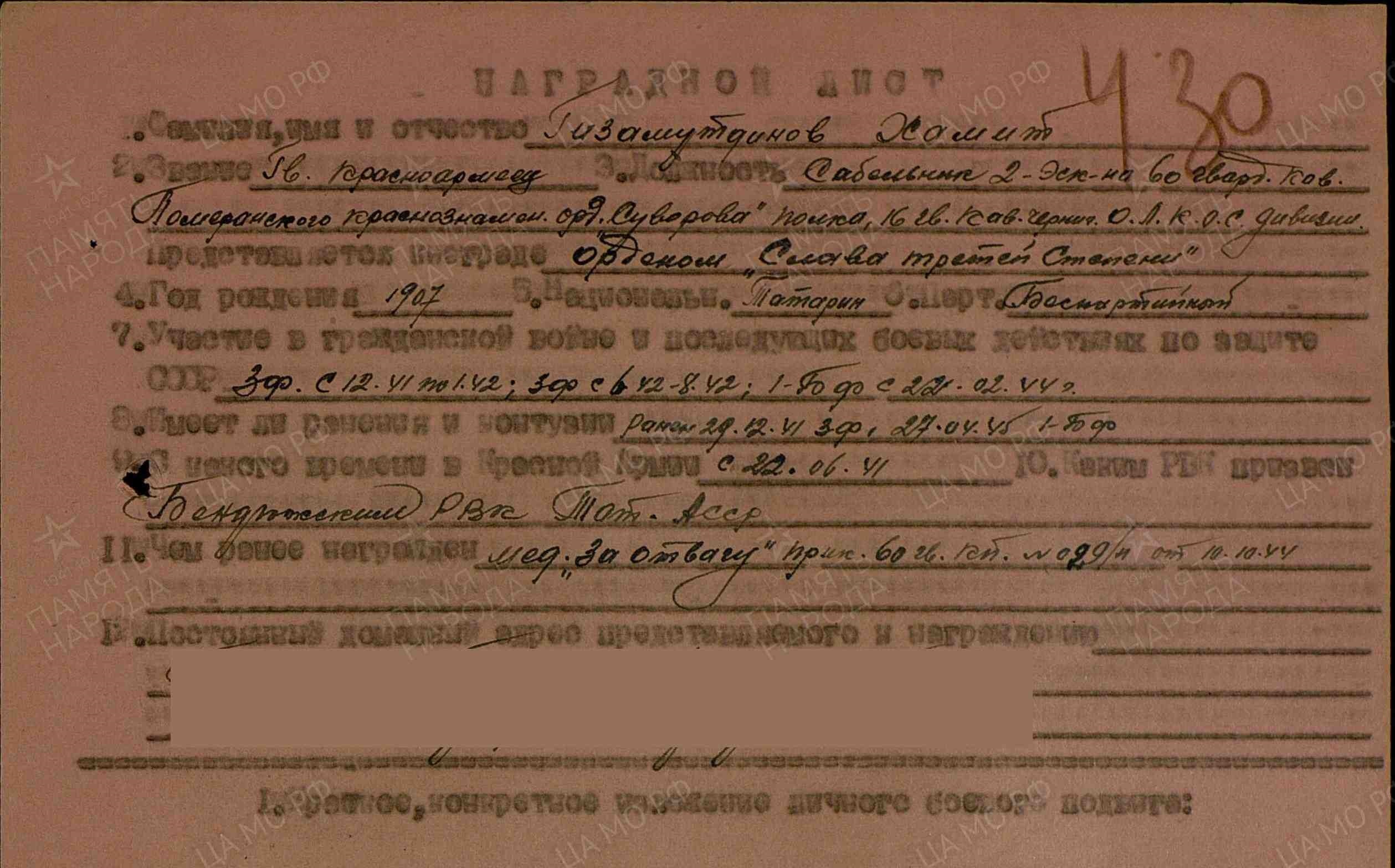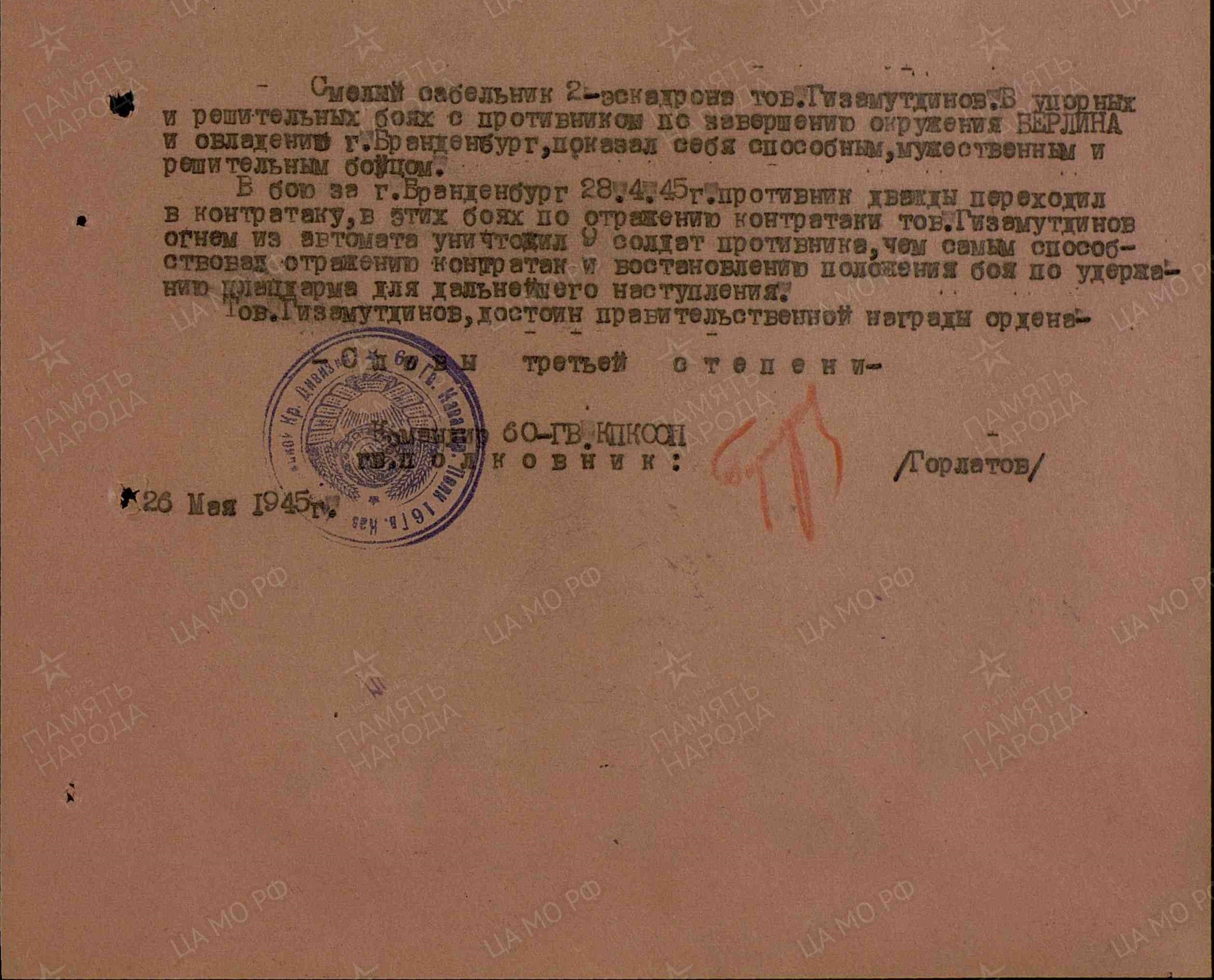 Гвардии рядовой, сабельник второго эскадрона 60 гвардейского кавалерийского 16 гвардейской кавалерийской дивизии Первого Белорусского фронта.