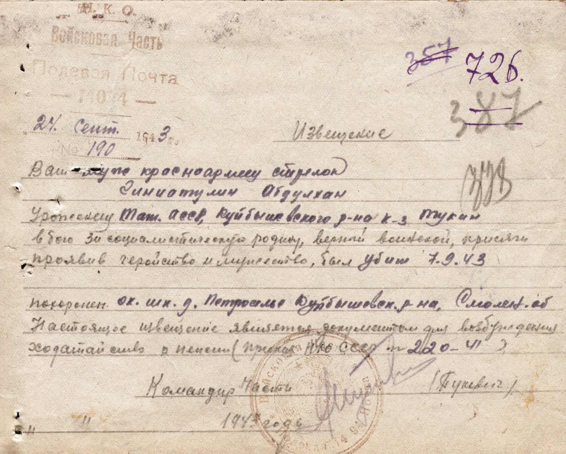 Убит 7 сентября 1943 года, похоронен в Смоленской области Куйбышевский район д. Петрополье.