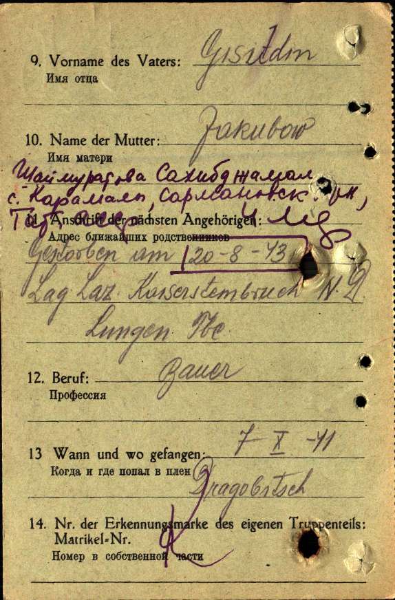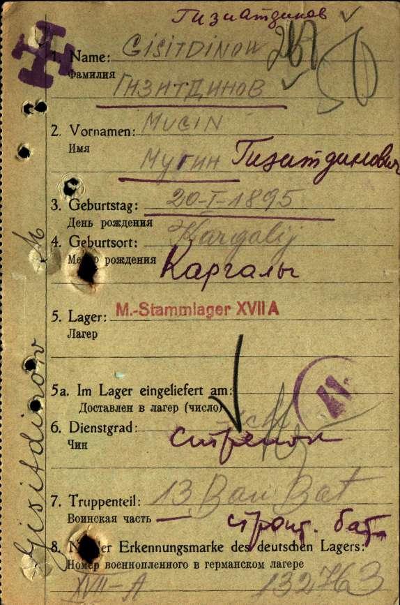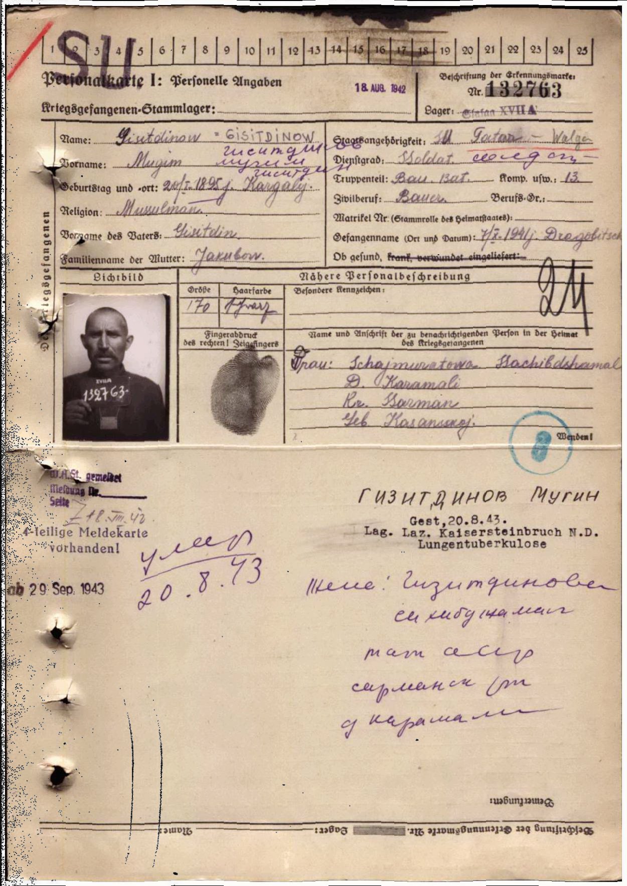 Родился 20 января 1895 г. в с. Каргали Чистопольского уезда Казанской губернии. Пленен 7 октября 1941 г. под Дрогобычем. Содержался в шталаге XVII A. Лагерный номер 132763. Рядовой Гизитдинов Мугин Гизитдинович погиб в плену 20 августа 1943 г. Захоронен в Кайзерштайнбрухе.