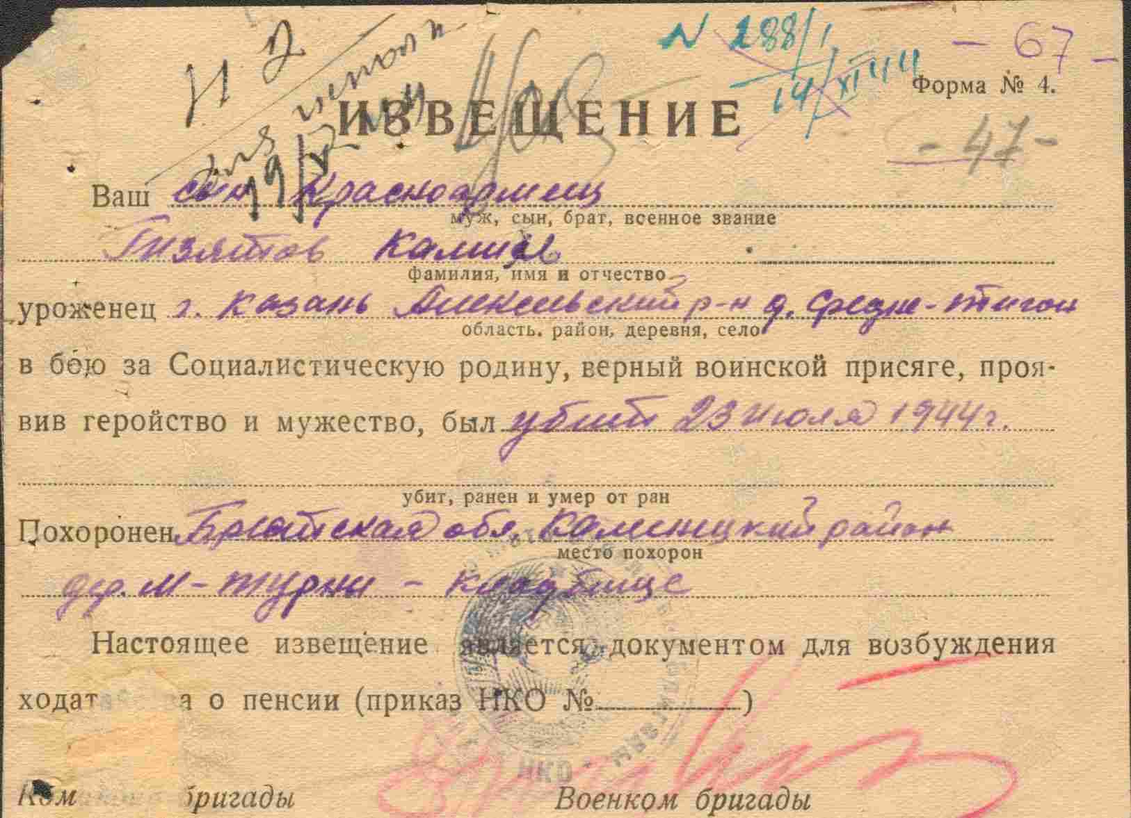 ГИЗЗАТОВ (ГИЗЯТОВ) Камиль Гилязович, 1925, с. Средние Тиганы. До призыва в армию работал в к-зе Им. Ворошилова. Член ВЛКСМ. Мобилизован Алексеевским РВК в июне 1943. Красноармеец, автоматчик 35 МехБр 1 МехК 1 Белорусского фронта. Погиб 23 июля 1944, д. Турна Малая, Каменецкий р-н, Брестская обл., БелССР.