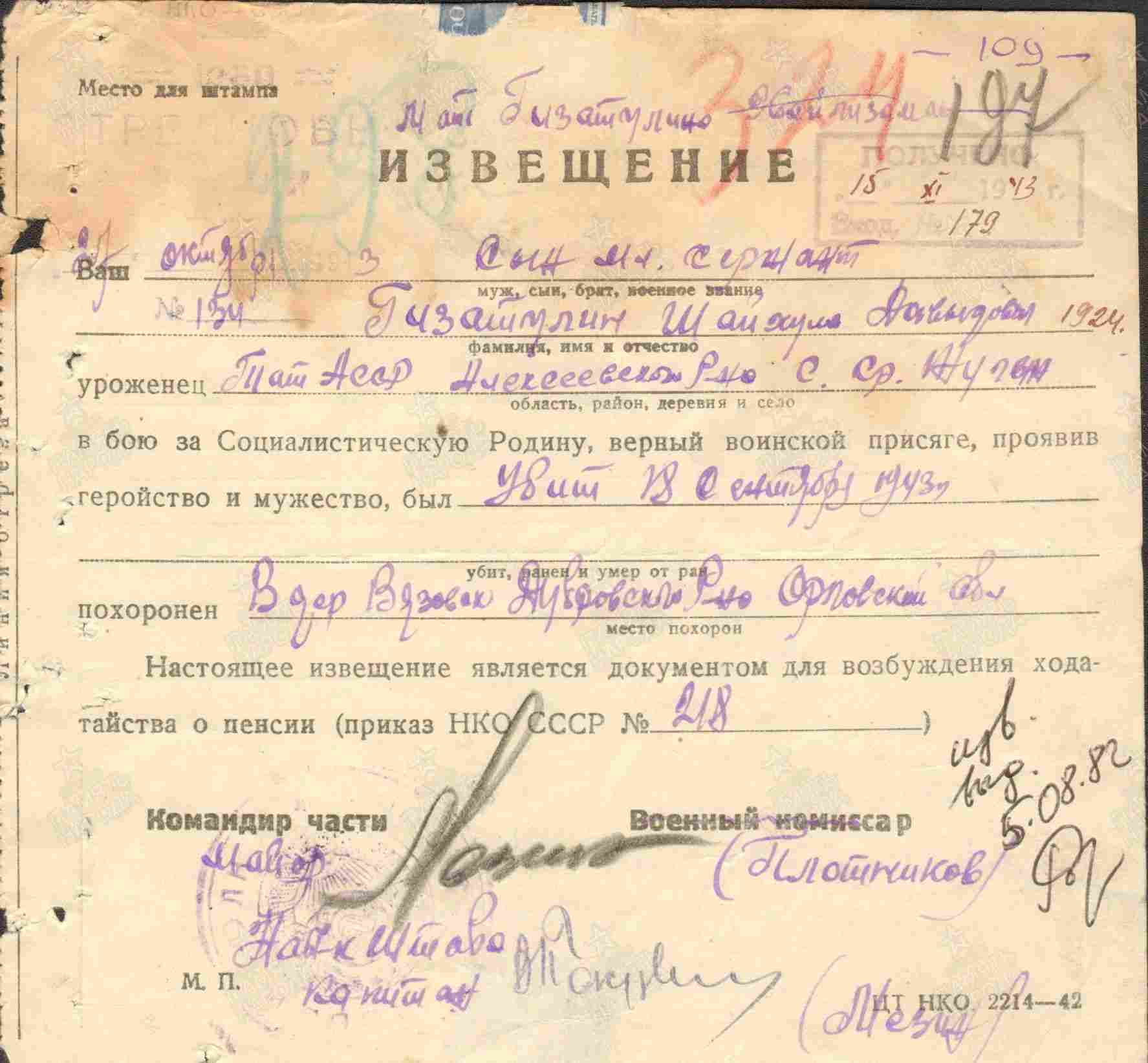 ГИЗЗАТУЛЛИН Шайхислам (Шайхулла) Даудович, 1924, с. Средние Тиганы. До призыва в армию работал в к-зе им. Ворошилова. Член ВЛКСМ. Мобилизован 20 авг. 1942 Алексеевским РВК. Мл. сержант, ком. отделения 1260 СП 380 СД 63 А/ 3 А Брянского фронта. Участник битвы на Курской дуге, освобождения г. Орёл. Погиб 18 сент. 1943 при форсировании р. Десна у д. Вязовск. Увековечен в с. Голубея, Дубровский р-н, Брянская обл.