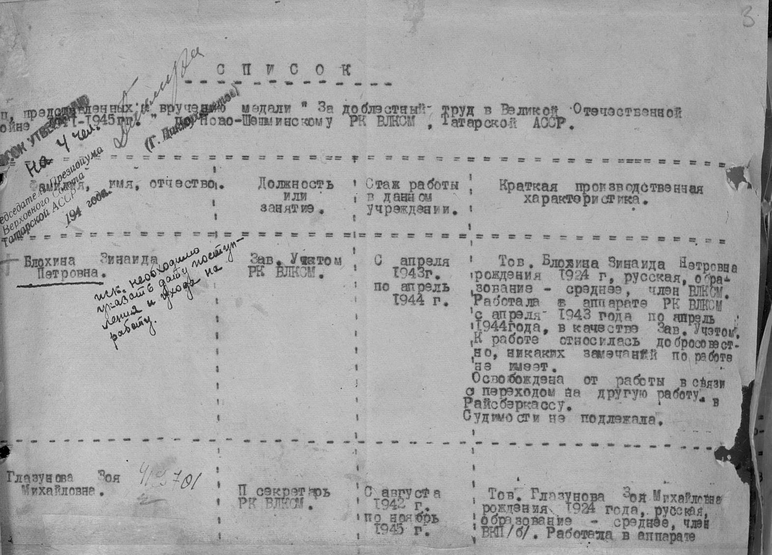 Глазунова Зоя Михайловна родилась в 1924 году. Место жительства: с.Новошешминск Чистопольского кантона ТАССР. В годы войны работала в РК ВЛКСМ вторым секретарем. Награжден медалью "За доблестный труд в Великой Отечественной войне 1941–1945 гг." (Акт от 28 апреля 1947 г, фонд 3610, опись 2, дело № 325, лист 3,№ 419701).