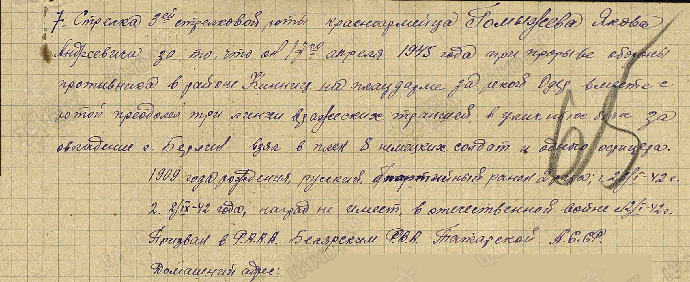 ГОМЫЖЁВ Яков Андреевич, 1909, с. Русская Мараса. Мобилизован Билярским РВК в 1941 г. Красноармеец. На фронте с 12 янв. 1942 г. 26 янв. 1942 г. был ранен в первый раз. Далее воевал в составе 976 СП 236 СД Северо-Кавказского фронта. 2 сентября 1942 г был ранен на Туапсинском направлении второй раз. Проходил лечение в 392 ОМСБ, ЭГ 2595. С июня 1943 г. направлен в краткосрочный отпуск по ранению. Далее воевал в 82 СП 33 СД. Героически проявил себя на одном из плацдармов р. Одер в апреле 1945 г. и штурме Берлина (взял в плен 8 солдат и 1 офицера противника). Награждён медалью "За отвагу".