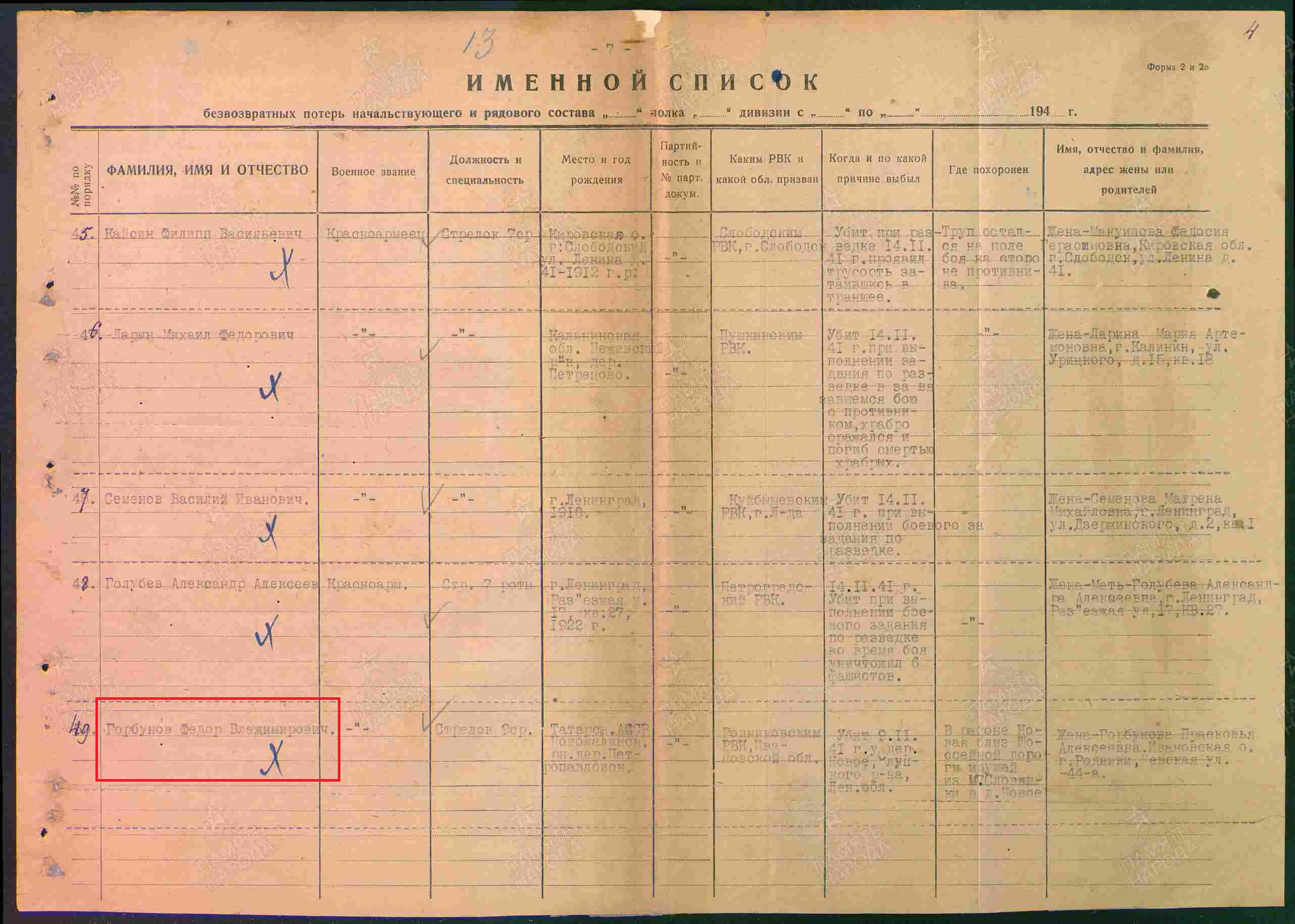 Горбунов Федор Владимирович родился в 1908 году в с.Слобода Петропавловская Казанской губернии Чистопольского уезда Новошешминской волости. Призван Родниковским РВК, кр-ц, 9 отдельная стрелковая рота отдела контрразведки "СМЕРШ" 5 армии, 187 стрелковый полк. Причина смерти: убит 09.11.41 г. место захоронения: Ленинградская обл., г.Пушкин