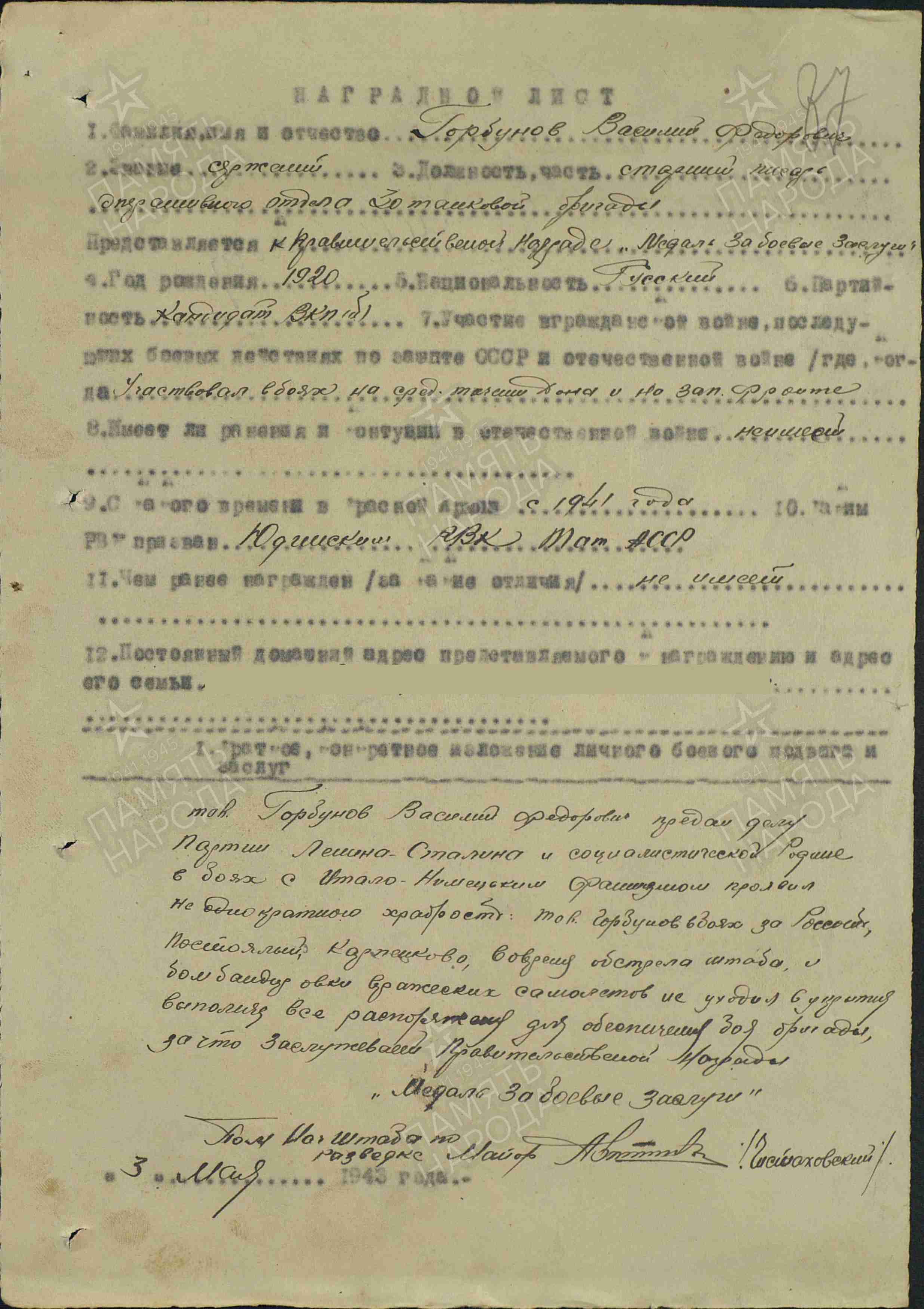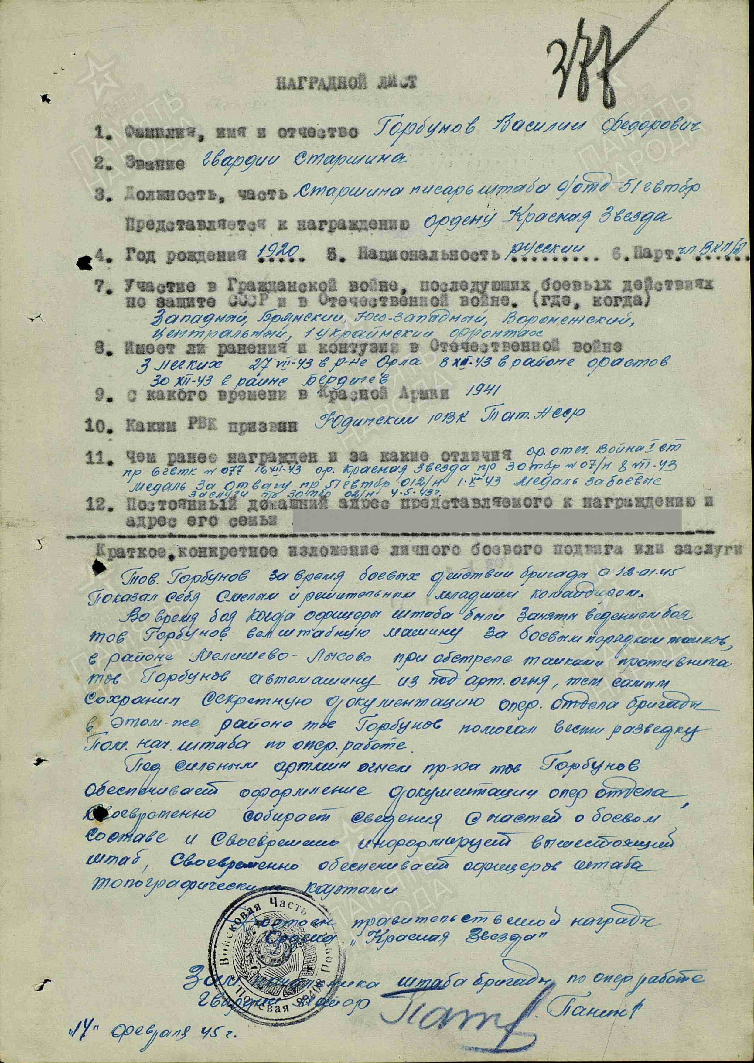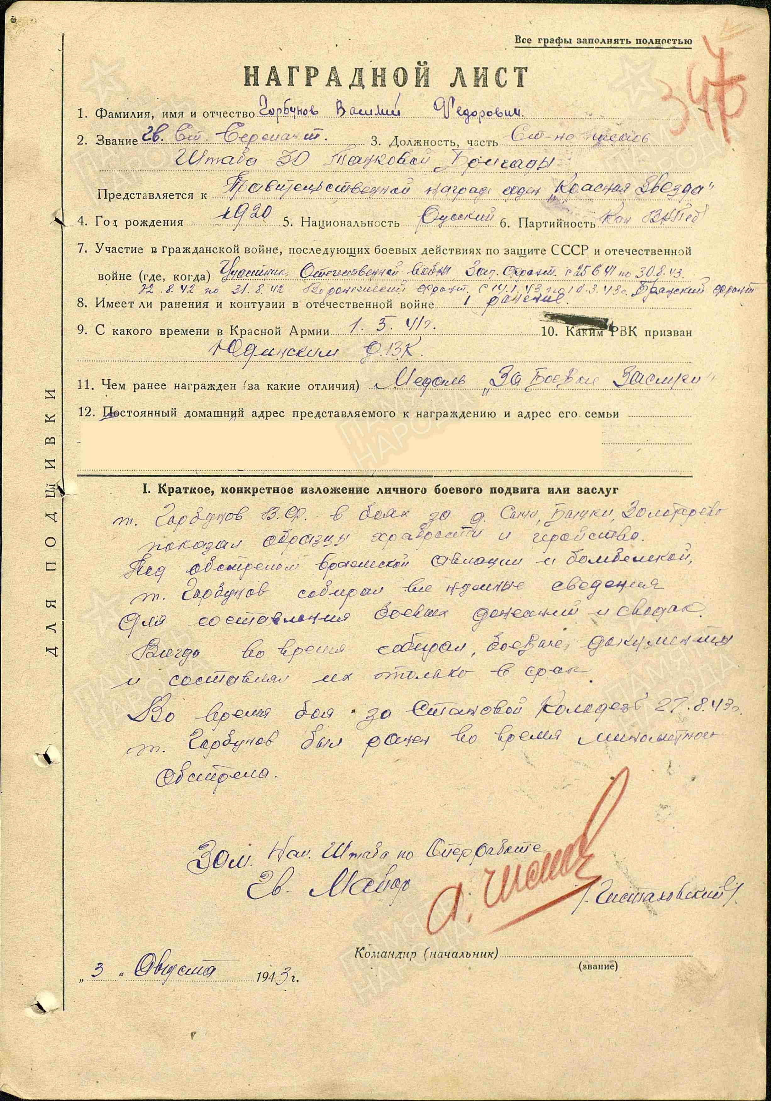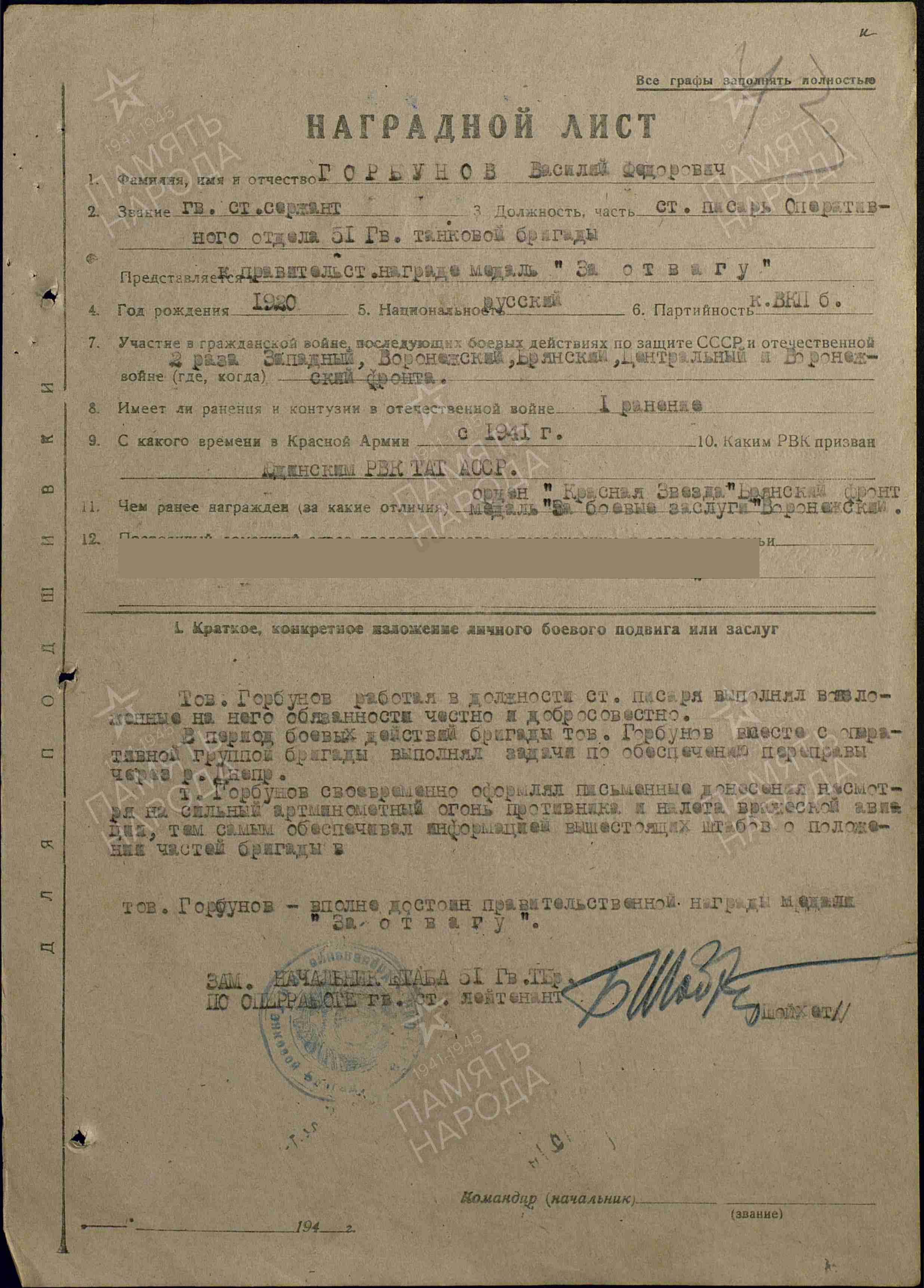 ГОРБУНОВ Василий Фёдорович, 1920, с. Лебяжье. Призван в Красную Армию 1 мая 1941 Юдинским РВК. Воевал на Западном, Юго-Западном, Воронежском, Центральном, Брянском, 1 Украинском фронте в составе 3 ТА/ 3 гв. ТА.. Участник битвы на Курской дуге, форсирования Днепра, освобождения Украины, Польши, Чехословакии. Перенёс три лёгких ранения: 27 июля, 8 дек., 30 дек. 1943. Член ВКП(б). Сержант/ гв. ст. сержант/ гв. старшина, ст. писарь оперативного отдела штаба 30 ТБр/ 51 гв. ТБр 12 ТК/ 6 гв. ТК. Неоднократно помимо своих прямых обязанностей штабного работника и помощника офицеров оперативного и развед. отдела штаба проявлял героизм в бою. Награждён медалями "За боевые заслуги", "За отвагу", двумя орденами Красной Звезды (1943, 1945), орденом Отечественной войны 1 ст. (1943). Уволен в запас в 1945 в звании "мл. лейтенант". Умер в 1962.