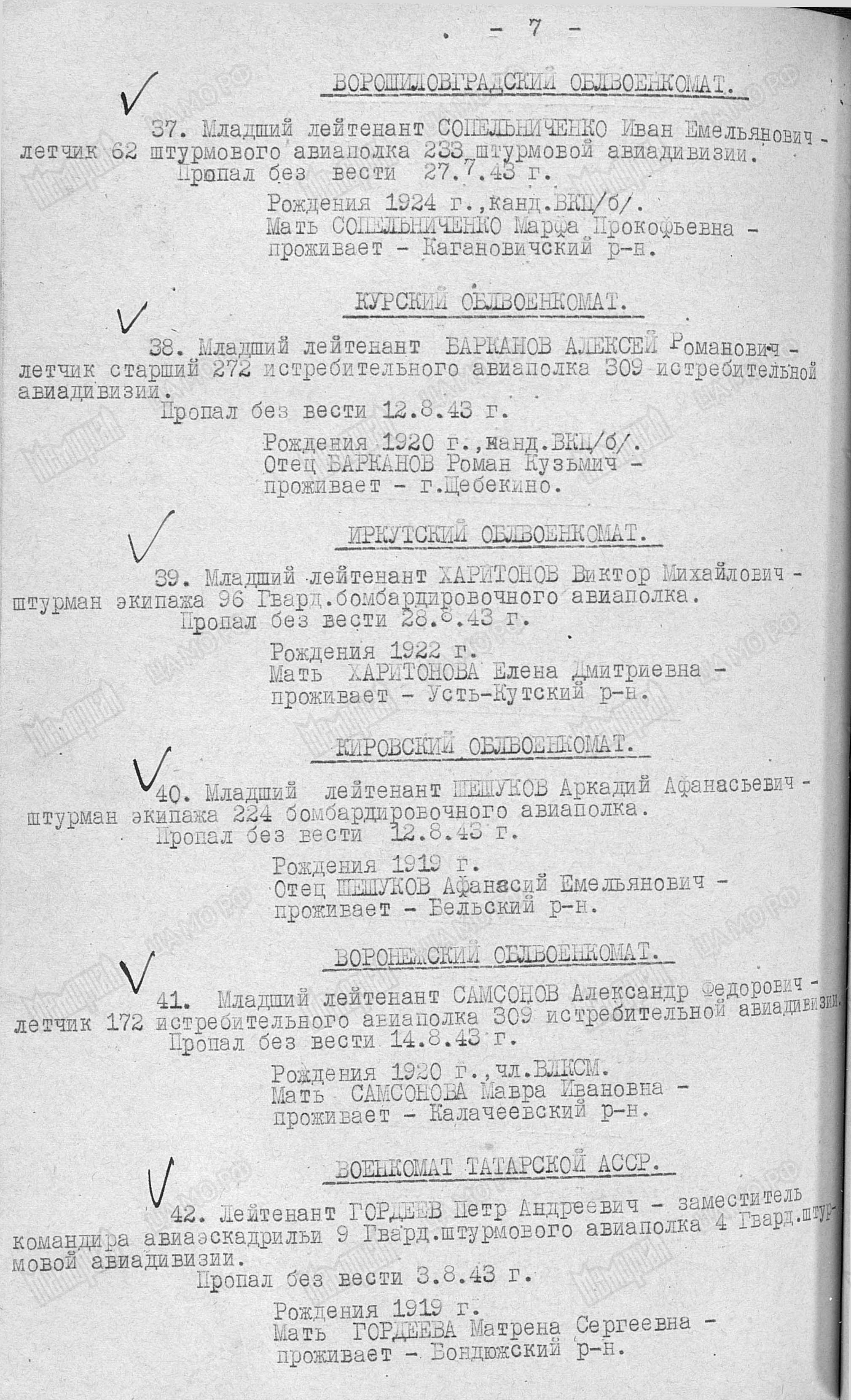 03. 08. 1943 г. не вернулся с боевого задания. Область выбытия Ровенская обл., Острожский р-н, с.Кр.Драгунская.