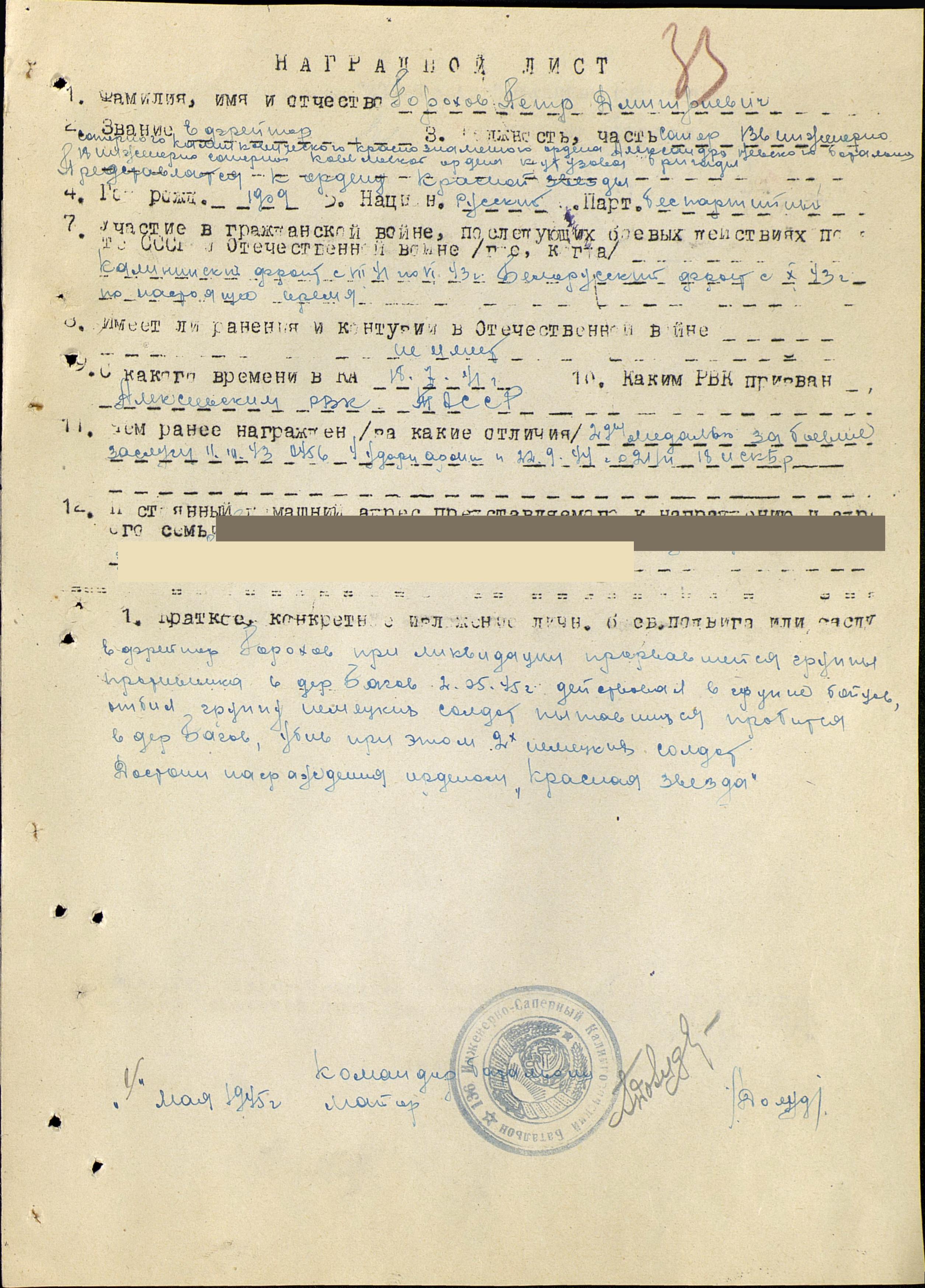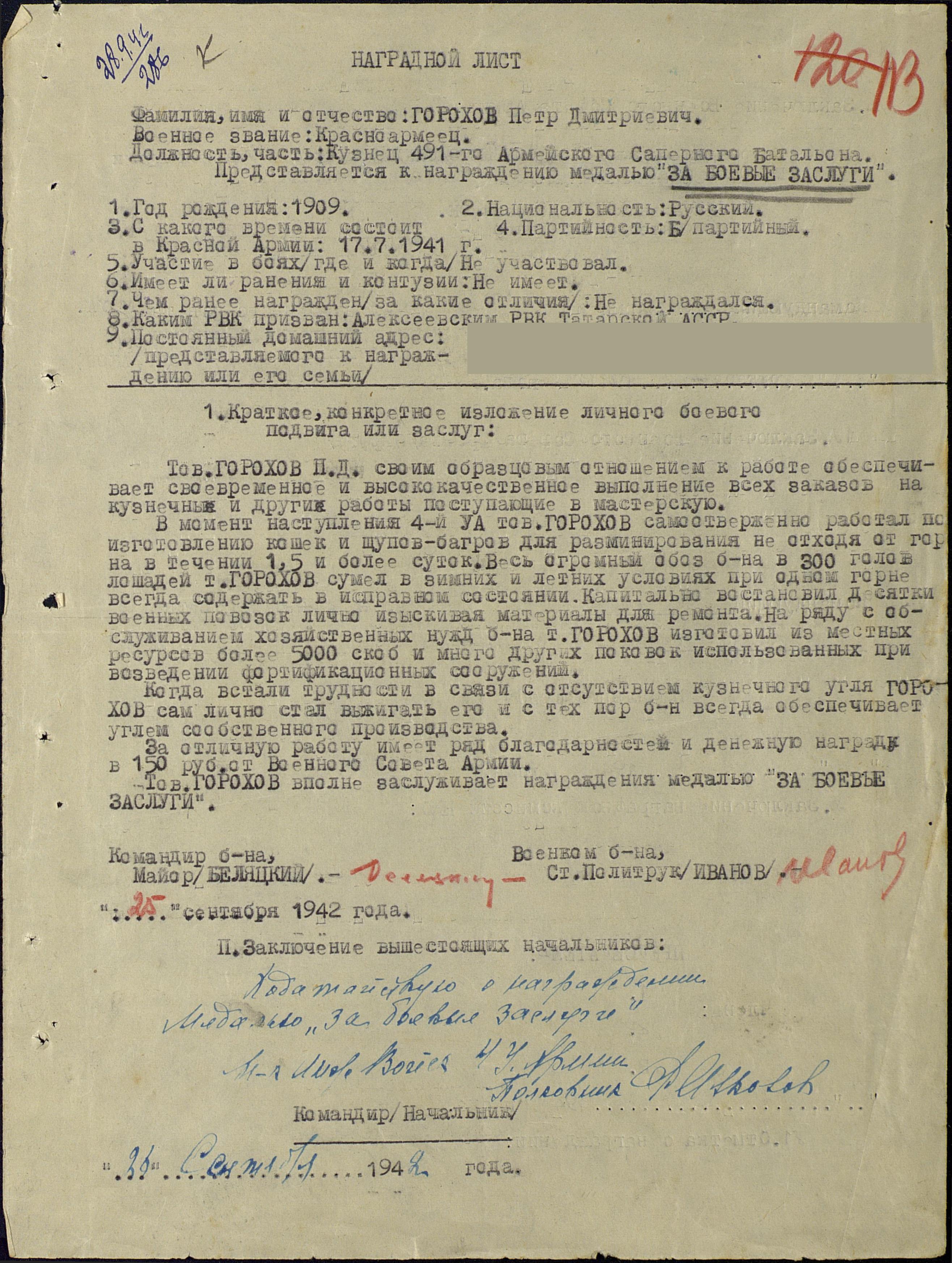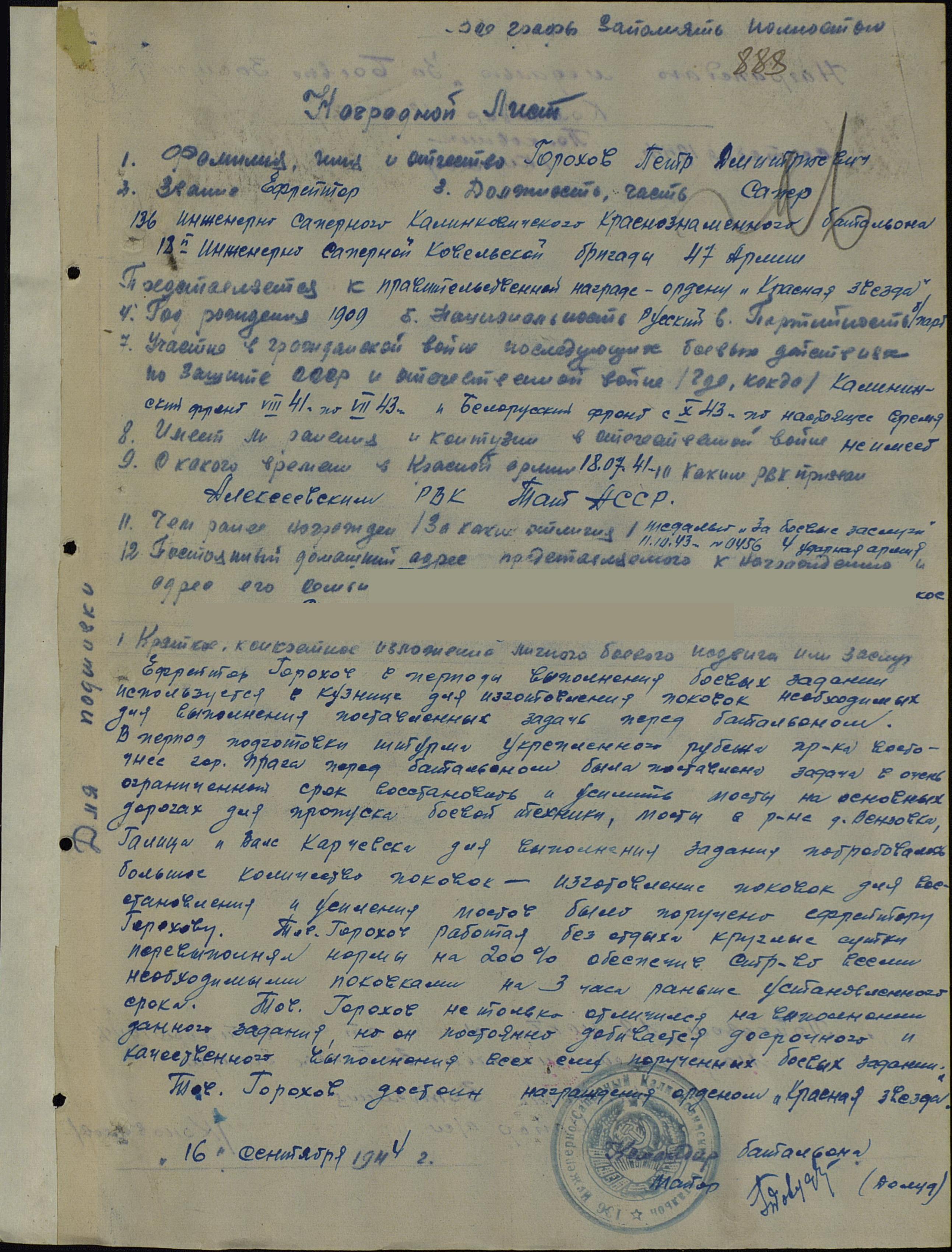 ГОРОХОВ Пётр Дмитриевич, 1909, с. Алексеевское. Мобилизован в армию 18 июля 1941 г. С 1941 по 1943 г. - на Калининском фронте, позднее - 1 Бел. Ф, ефрейтор, сапёр-кузнец 491 саперного батальона, также 136 инж. сапер. батальона 18 Инж. Сап. бригады 4 УА, 47 А. Отличился при усилении мостов на основных дорогах переброски войск, содержал на одном кузнечном горне 300 голов лошадей, готовил кошки и щупы-багры для разминирования, скобы и множество других кованых изделий, используемых для стоительства фортификационных сооружений, обеспечивал кузню углём собственного производства. Также отличился в бою 2 мая 1945 г., убив лично 2х немецких солдат. Награждён медалями "За боевые заслуги" дважды, "За отвагу", "За победу над Германией", орденом Отечественной войны 2 ст. (1985 г.).