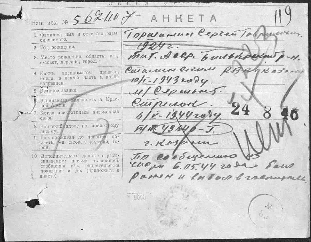 ГОРШЕНИН Сергей Гаврилович, 1924, с. Красная (Богоявленская) Горка. Мобилизован Сталинским/ Дзержинским РВК г. Казань 10 янв. 1943. До 4 фев. 1943 обучался в Горьковском учебном артиллерийском центре. Мл. сержант, 1428 ЛАП 65 ЛАБр 18 АртД прорыва 55 А/ 42 А/ 2 УдА Ленинградского фронта. Ранен 6 мая 1944 и отправлен в госпиталь. Дальнейшая судьба не установлена. Учтён пропавшим без вести.