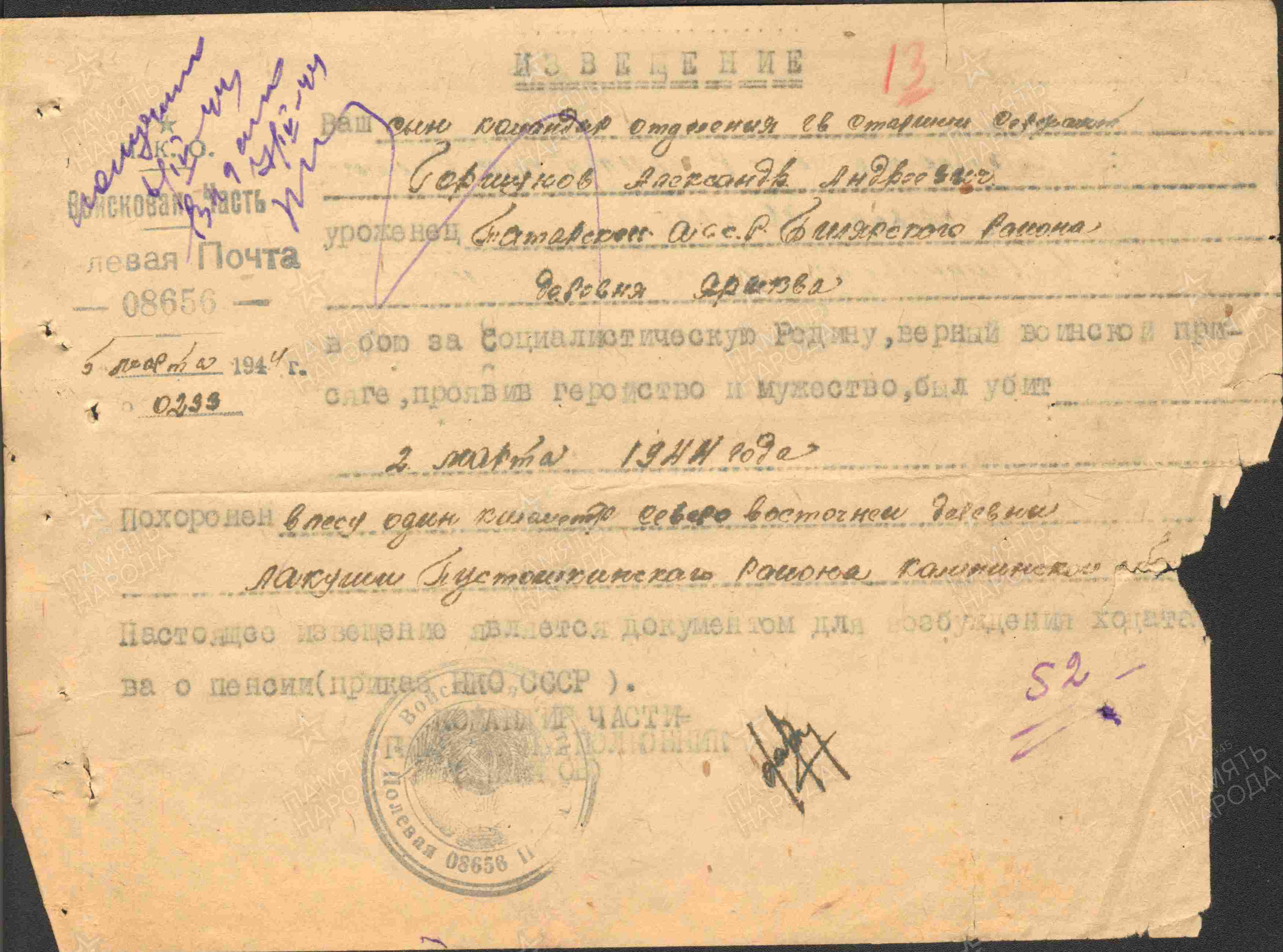 ГОРШУНОВ Александр Андреевич, 1924, д. Ерыкла. Мобилизован 24 авг. 1942 Билярским РВК. Гв. ст. сержант, ком. отделения 94 гв. СП 30 гв. СД 20 А/ 31 А/ 30 А/ 10 гв. А Западного/ 2 Прибалтийского фронта. В боях перенёс ранение, находился на лечении в ГЛР 3356. Погиб 2 марта 1944, с. Лакуши, Пустошкинский р-н, Калининская (Псковская) обл.