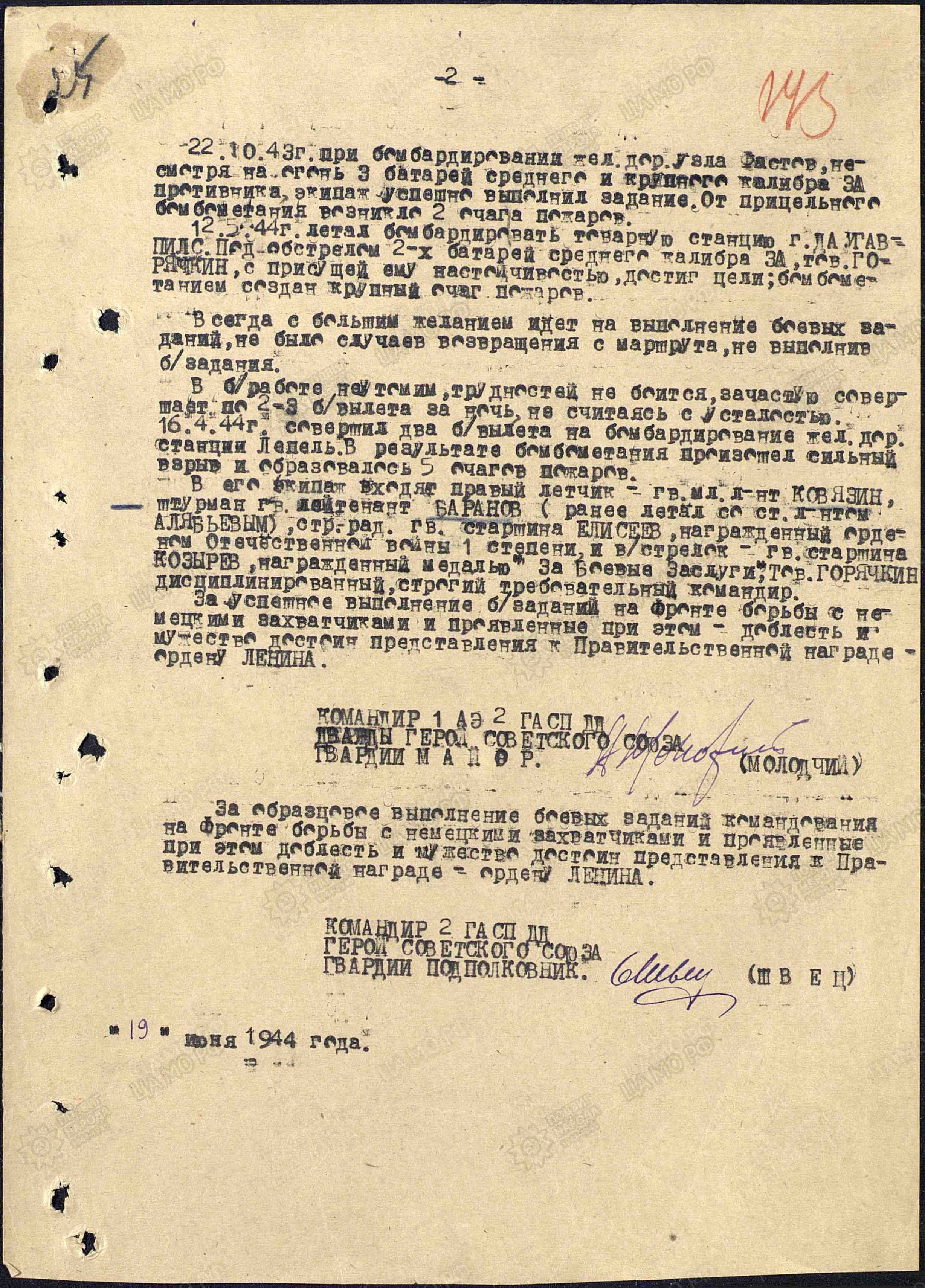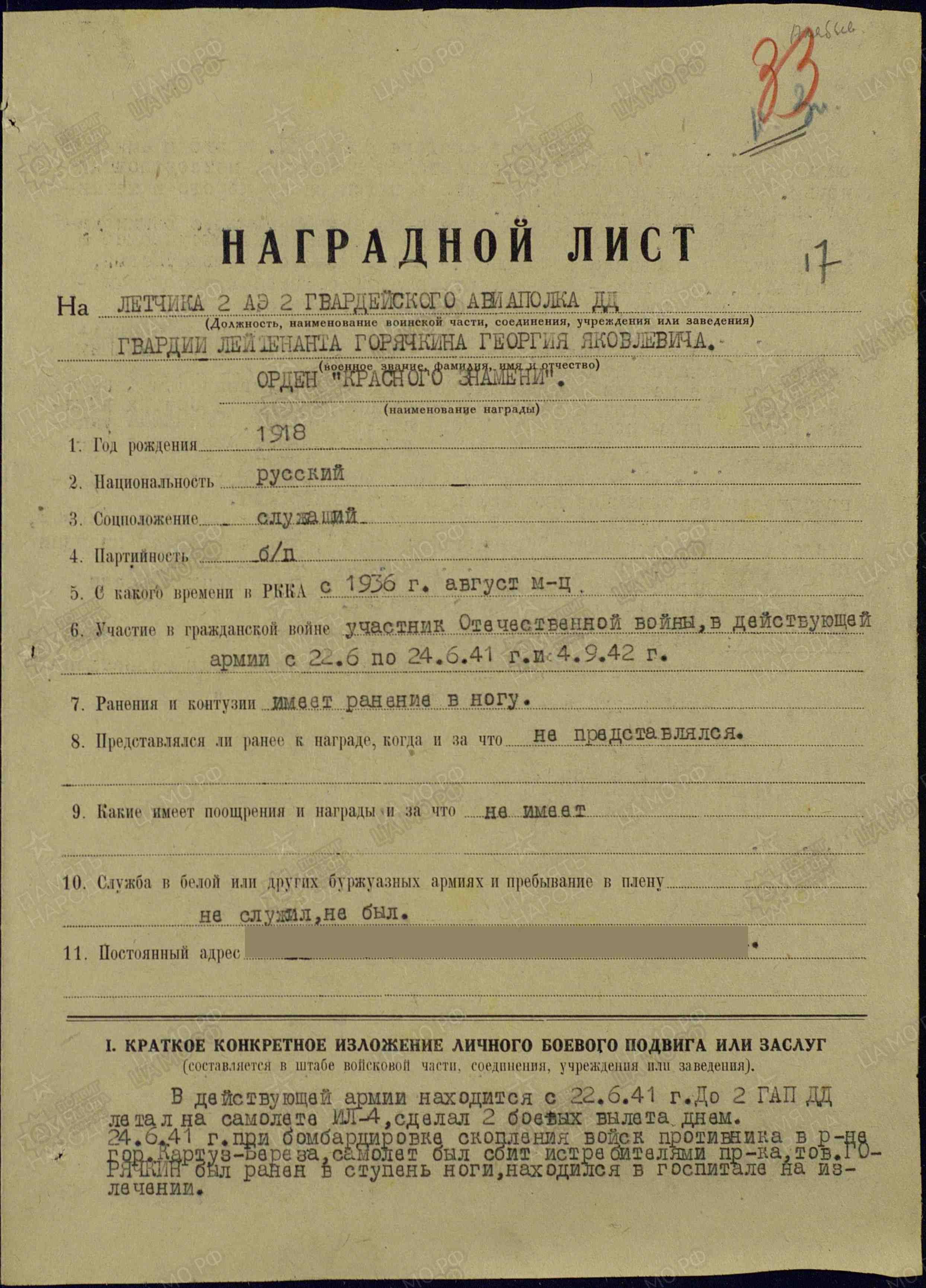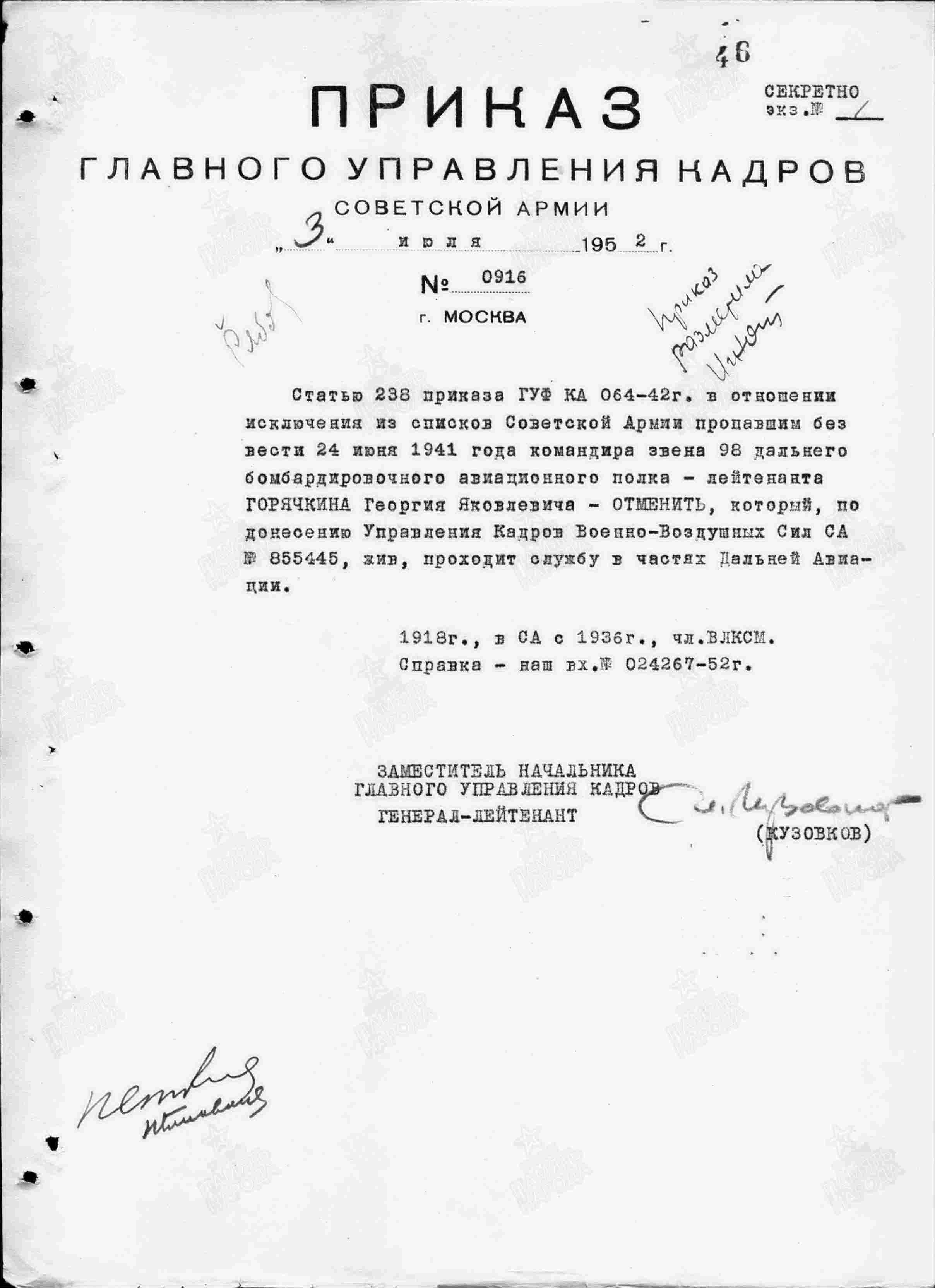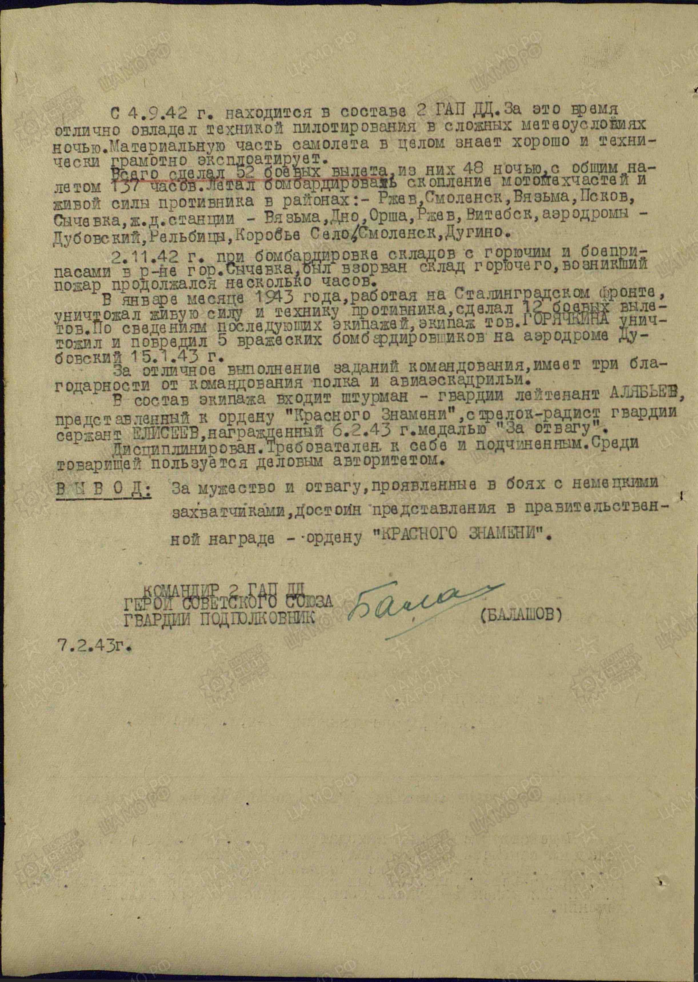 ГОРЯЧКИН Георгий Яковлевич, 1918, с. Ромодан, Спасский уезд Казанской губернии (соврем. Алексеевский район Республики Татарстан). Мобилизован Молотовским РВК г. Казань в 1936 г. Лётчик-бомбардировщик. В боях с 22 июня 1941 г. В течение 22 и 24 июня совершил два дневных боевых вылета. 24.06.1941 г. его самолёт Ил-4 был сбит истребителями противника. Был ранен в ступню. Проходил лечение в госпитале. Затем направлен в 7 запасной авиаполк. С 4 сентября 1942 г. продолжил службу качестве командира экипажа во 2 гвардейском авиационном полку дальнего действия (ДД) 1 гвардейской авиадивизии ДД 1 гв. авиакорпуса ДД, звание - гв. лейтенант. К январю 1943 г. совершил 52 результативных боевых вылета (из низ 48 ночью) на стратегические объекты противника в районе Ржев, Смоленск, Псков, Сычёвка, Дно, Орша, Витебск. С января 1943 г. – на Сталинградском фронте. Совершил 12 боевых вылетов. Только за один налёт на аэродром противника Дубовский уничтожил и повредил 5 бомбардировщиков врага. В марте 1943 г. награждён орденом Красного Знамени. К концу лета 1943 г. имел уже 103 боевых вылета (из них 99 ночью). Звание гв. старший лейтенант. Бомбил объекты врага в районах Кёнигсберг, Тильзит, Инстербург, Варшава, Брянск, Данциг (Гданьск), Хельсинки, Яссы, Минск, Гомель, Кременчуг, Калиновичи, Полоцк, Фастов, Нарва, Резекне, Гульбине, Лепель, Даугавпилс, Бобруйск, Березина, Духовщина и другие. 22 июня 1943 г. получил сильные ушибы при вынужденной посадке. Находился на излечении в госпитале. Награждён в 1943 г. орденом Отечественной войны 1 ст. В 1944 г. – гвардии капитан. К этому времени полк был переведён на ленд-лизовские самолёты американского производства B-25 Mitchell. Имел на счету 167 боевых вылетов (из них 163 ночью). В августе 1944 г. указом Президиума Верховного Совета СССР награждён орденом Ленина. Следует отметить, что практически каждый боевой вылет сопровождался сильным противодействием зенитного огня противника, а следовательно и риском для жизни. Также награждён медалями «За оборону Сталинграда», «За взятие Берлина», «За победу над Германией», орденом Отечественной войны 2 ст. (1985г.). В 1947 г. – гв. капитан, заместитель командира эскадрильи 2 гвард. бомбардировочного авиаполка 11 гвардейской бомбардировочной дивизии.