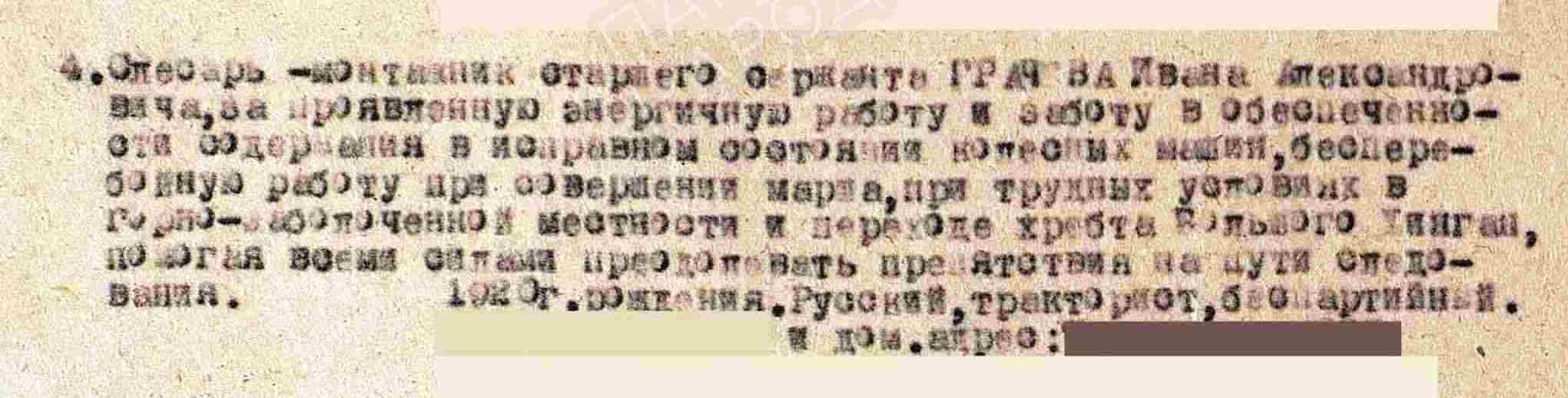 ГРАЧЁВ Иван Александрович, 1920, д. Русская Майна. Мобилизован Билярским РВК 27 июля 1941. Повторно – в 1942 из категории негодных. Воевал на Брянском, Белорусском, 1 Белорусском, 3 Прибалтийском, Ленинградском, Забайкальском фронте в составе 65 А/ 50 А/ 1 УдА/ 61 А/ 67 А/ 6 гв. ТА. Участник битвы на Курской дуге, освобождения Белоруссии, Прибалтики, Советско-японской войны. Ст. сержант, слесарь монтажник 1 гв. ТК/ 1038 САП 231 САБр. Награждён медалью «За победу над Японией», двумя медалями «За боевые заслуги», орденом Отечественной войны 2 ст. (1985).