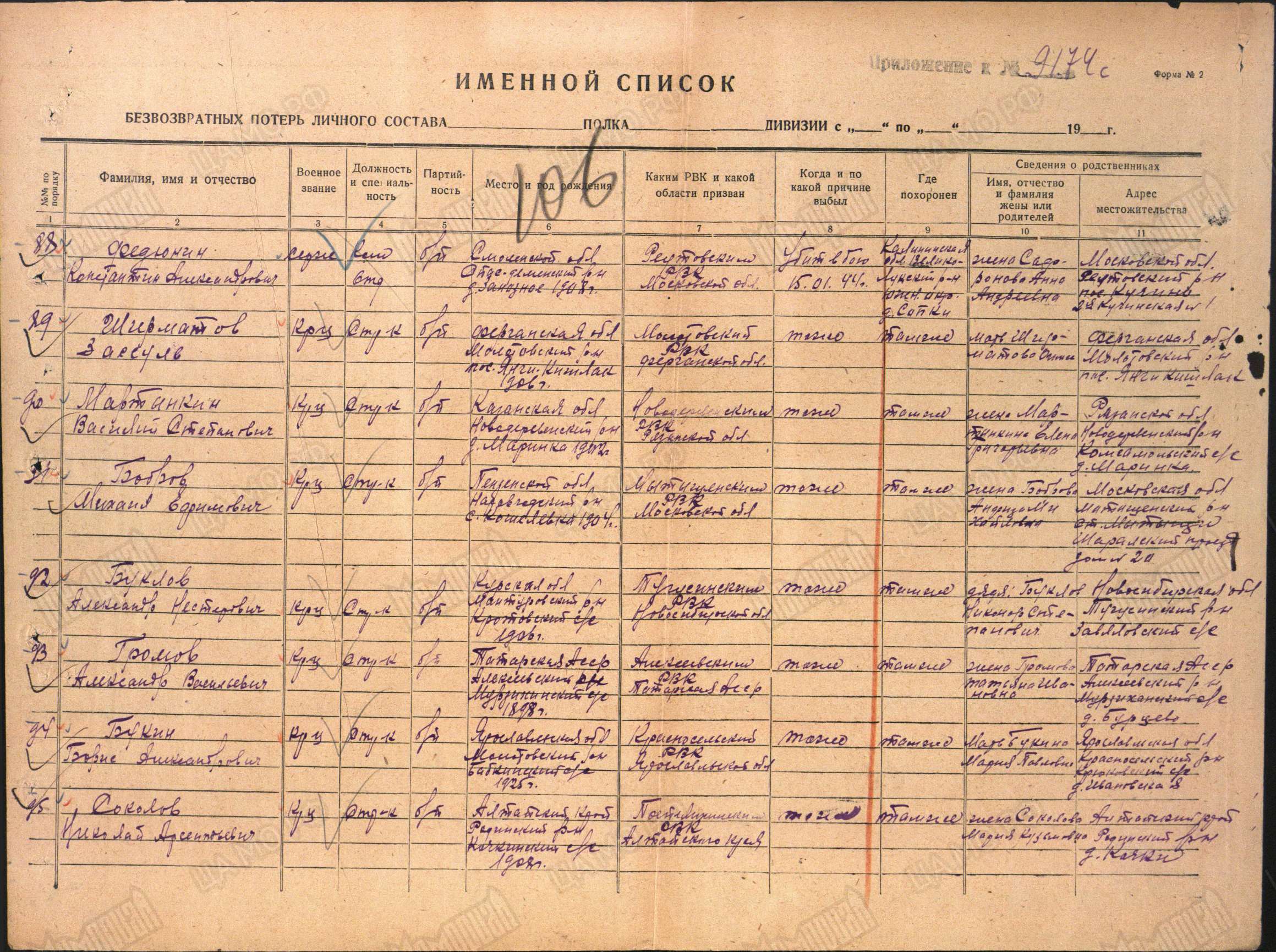 ГРОМОВ Александр Васильевич, 1898, д. Бурцево (сейчас не существует, переселена в 1950-х гг. в связи с затоплением Куйбышевского водохранилища). В 1937 г. - председатель колхоза "Привет Будённому". 14 дек. 1937 г. был арестован за "агитацию против мероприятий Советской власти и провокационные слухи". Предъявлено обвинение по ст. 58-10 ч. 1, 58-11. НКВД ТАССР 8 февраля 1939 г. дело прекращено за недостаточностью улик. Мобилизован Алексеевским РВК в 1942 г. Красноармеец 1128 стр. полка 336 СД Калининского фронта. 27 ноября 1942 г. учтён как погибший у д. Плющево Зубцовского района Калининской обл., о чём семья получила соответствующее извещение. Далее (после ранения?) служил в составе 37 СД. 15 января 1944 г. погиб на южных окрестностях д. Чёрное Великолукского района Калининской (в наши дни Псковской) обл.