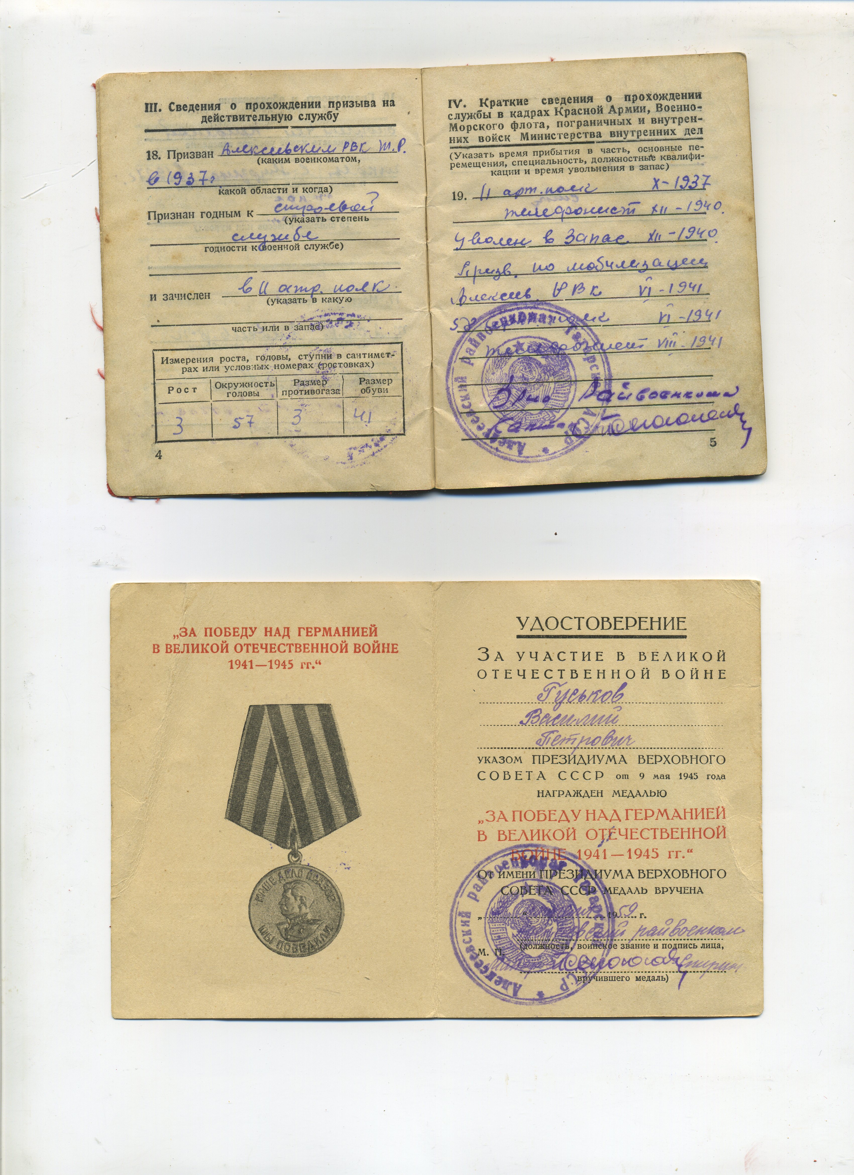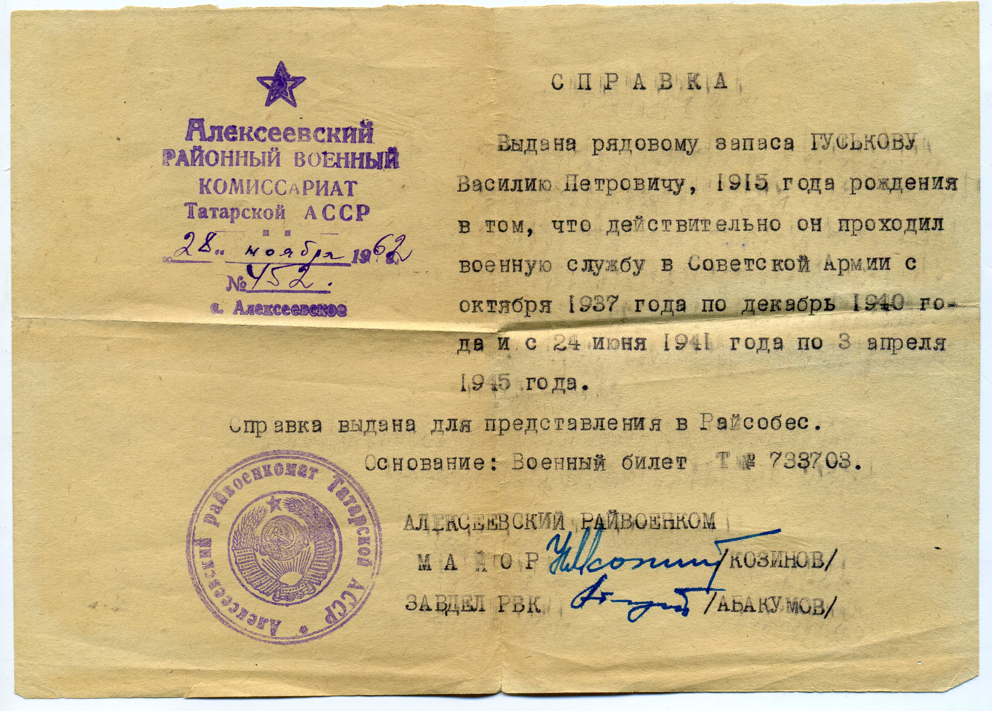 ГУСЬКОВ Василий Петрович, 1915, с. Мурзиха. С 1937 по 1940 г. проходил срочную службу в РККА. С началом войны был мобилизован в армию, находился на фронте в составе 580 арт. полка в должности телефониста. В августе 1941 г. попал в плен, где находился до начала апреля 1945 г. Был освобождён и продолжил службу, демобилизован в 1946 г. После войны работал в дорожном управлении. Награждён медалью "За победу над Германией".