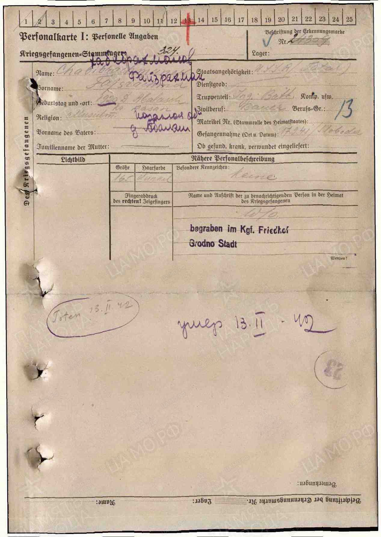Погиб в плену 13.02.1942 г. Место захоронения г.Гродно.