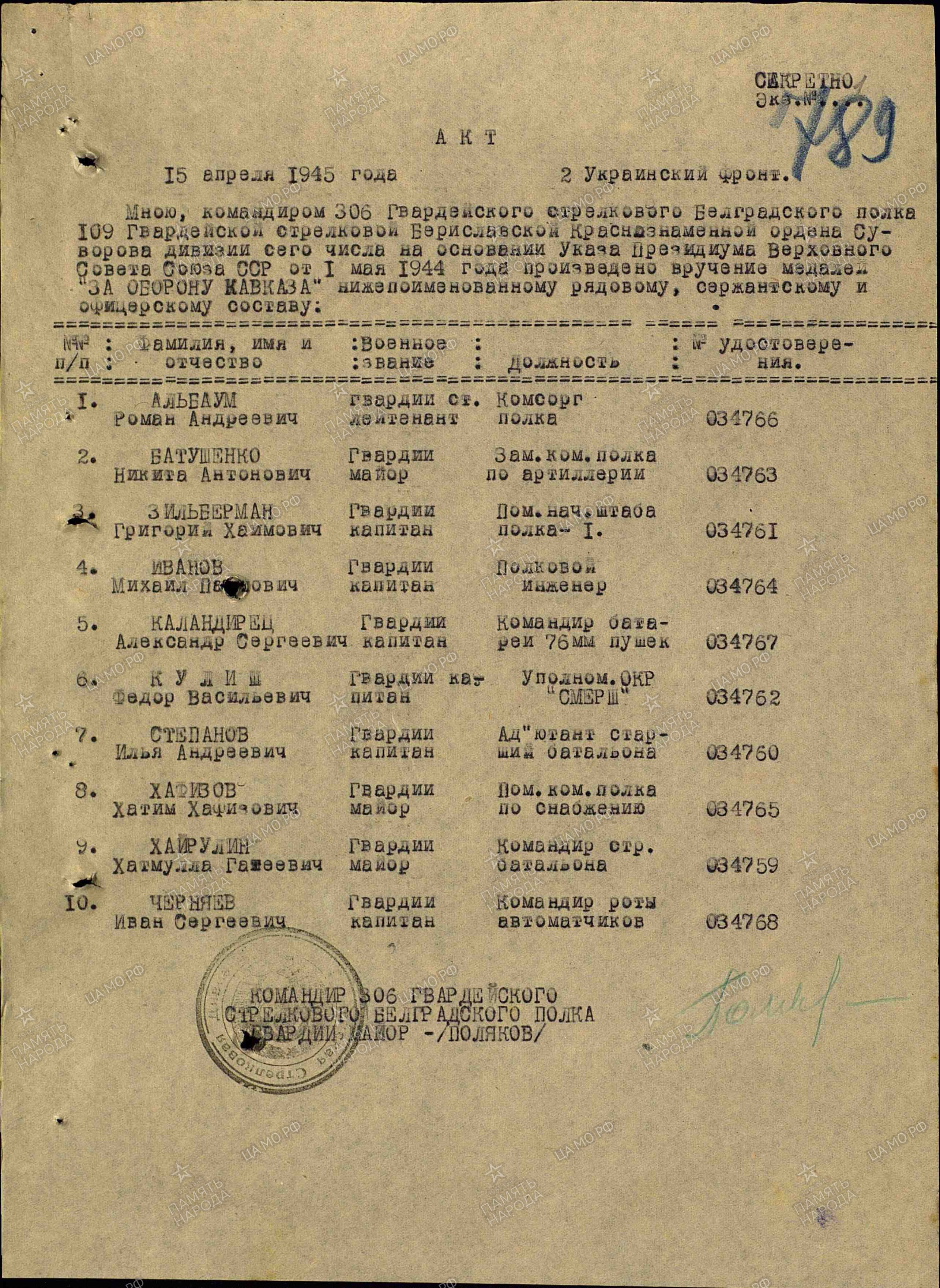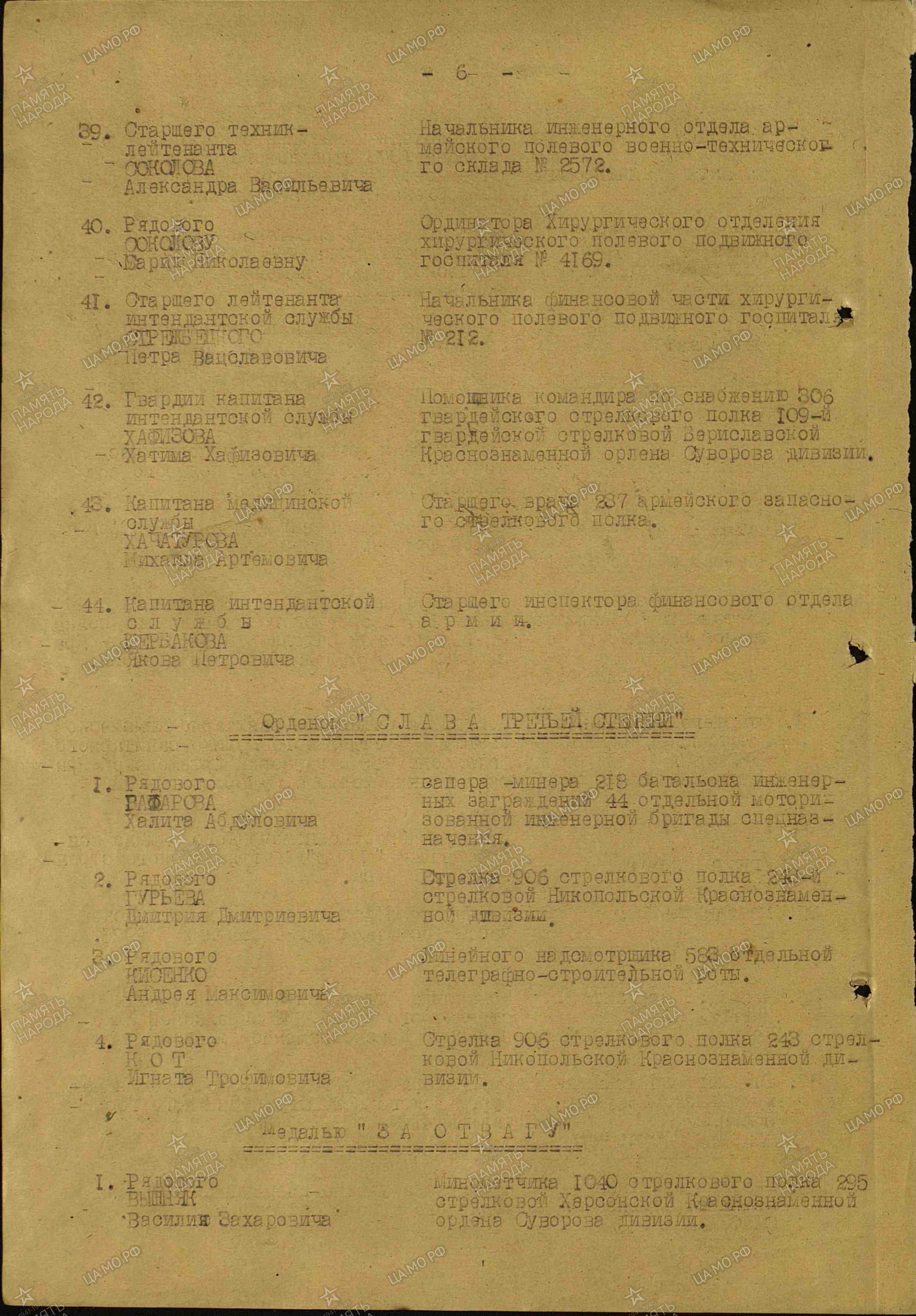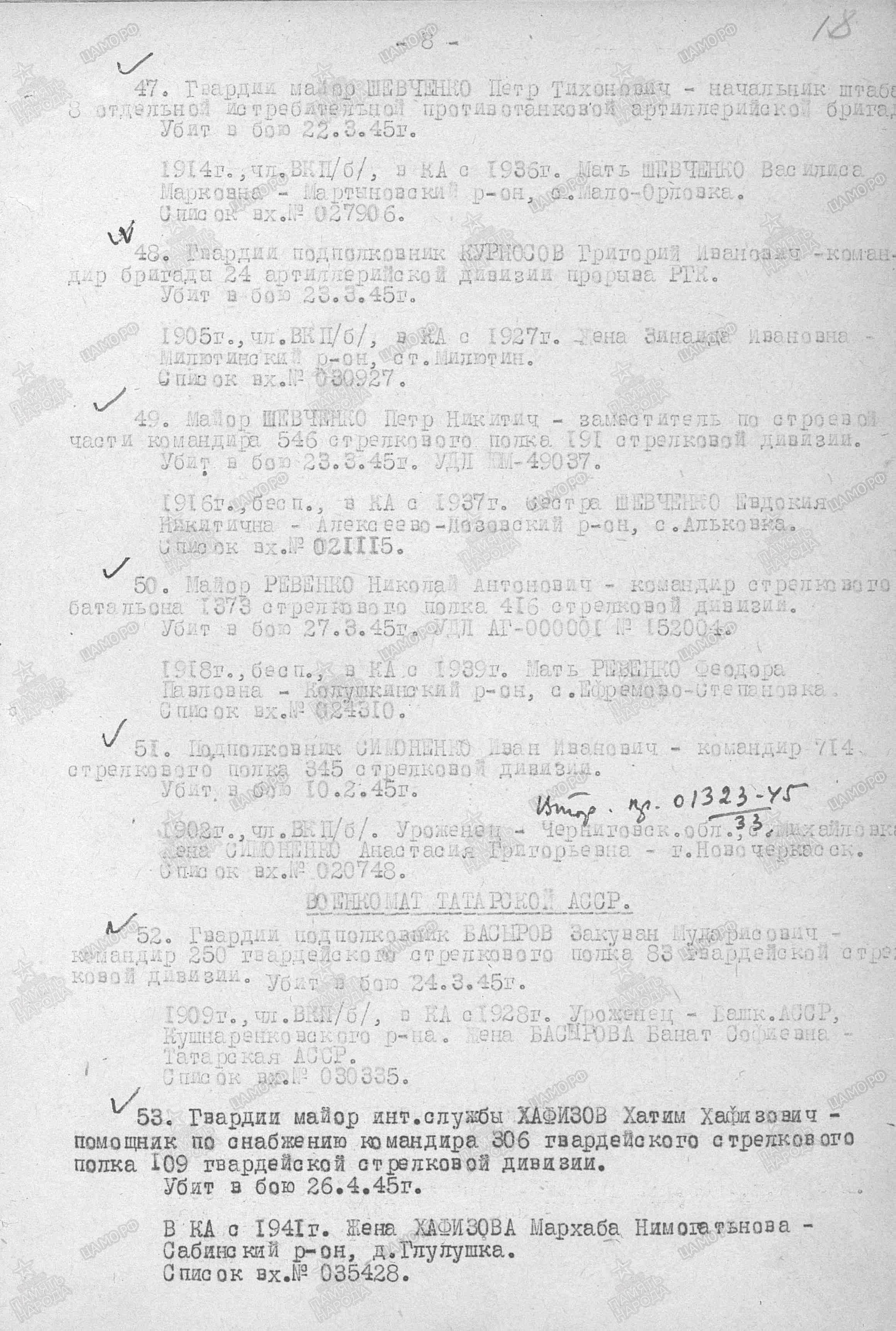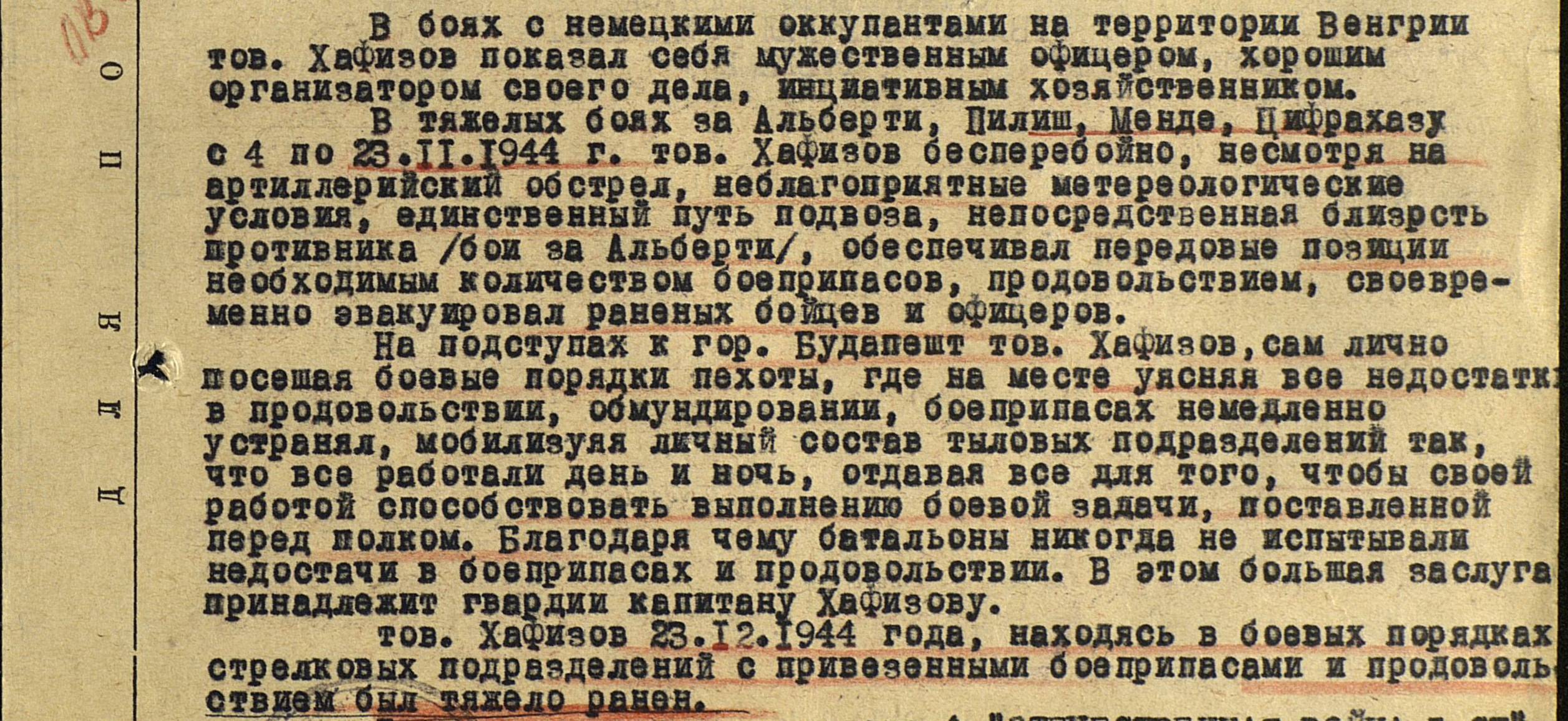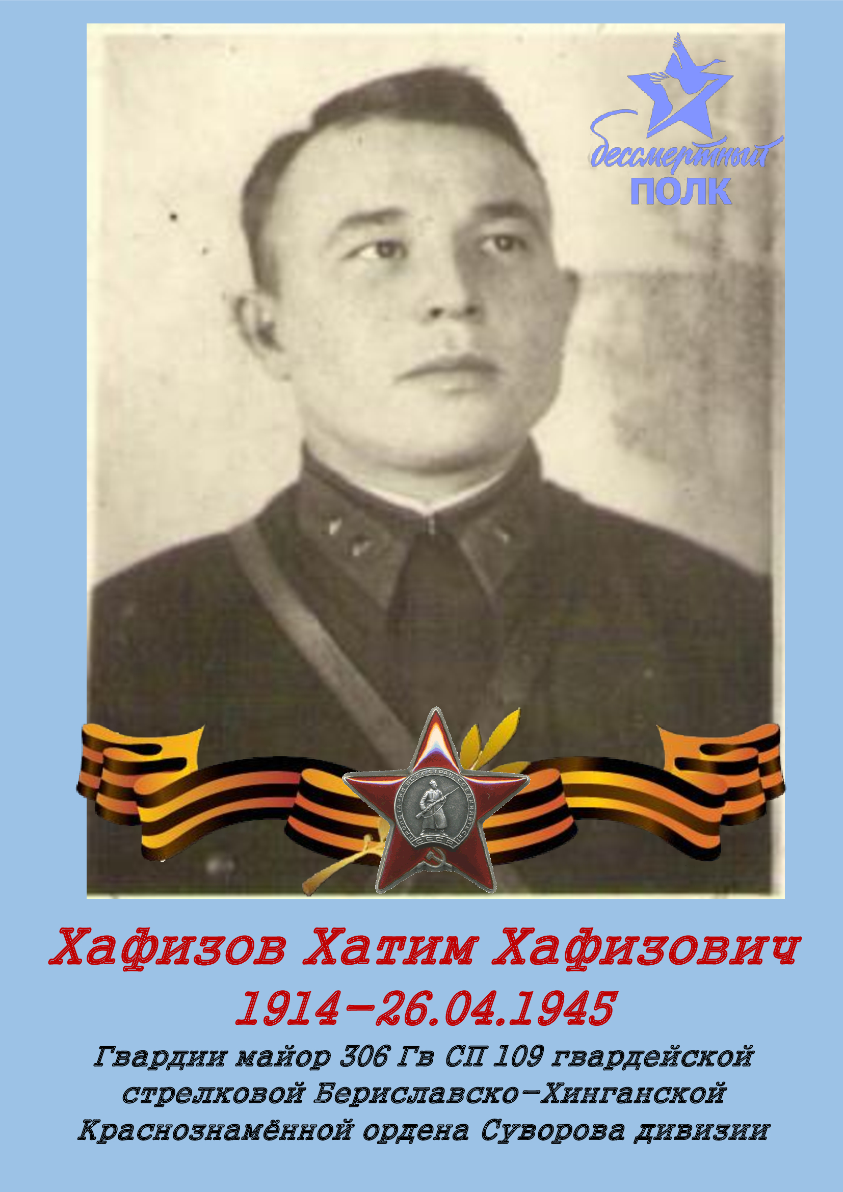 Гвардии майор интендантской службы Хафизов Хатим Хафизович, помошник командира полка по снабжению 306 гвардейского стрелкового полка 109-я гвардейской стрелковой Бериславско-Хинганской Краснознамённой Ордена Суворова дивизии, прошел всю войну. Погиб в бою за г. Брно (Чехословакия) 26 апреля 1945 года.